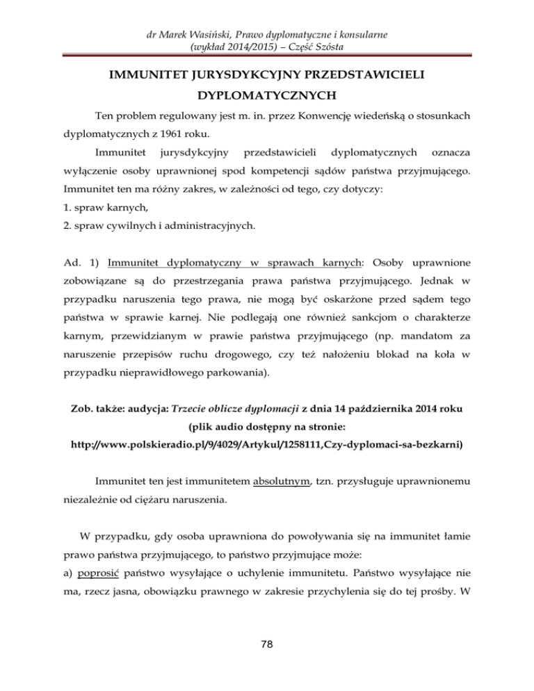dr Marek Wasiński, Prawo dyplomatyczne i konsularne (wykład 2014/2015) – Część Szósta IMMUNITET JURYSDYKCYJNY PRZEDSTAWICIELI DYPLOMATYCZNYCH Ten problem regulowany jest m. in. przez Konwencję wiedeńską o stosunkach dyplomatycznych z 1961 roku. Immunitet jurysdykcyjny przedstawicieli dyplomatycznych oznacza wyłączenie osoby uprawnionej spod kompetencji sądów państwa przyjmującego. Immunitet ten ma różny zakres, w zależności od tego, czy dotyczy: 1. spraw karnych, 2. spraw cywilnych i administracyjnych. Ad. 1) Immunitet dyplomatyczny w sprawach karnych: Osoby uprawnione zobowiązane są do przestrzegania prawa państwa przyjmującego. Jednak w przypadku naruszenia tego prawa, nie mogą być oskarżone przed sądem tego państwa w sprawie karnej. Nie podlegają one również sankcjom o charakterze karnym, przewidzianym w prawie państwa przyjmującego (np. mandatom za naruszenie przepisów ruchu drogowego, czy też nałożeniu blokad na koła w przypadku nieprawidłowego parkowania). Zob. także: audycja: Trzecie oblicze dyplomacji z dnia 14 października 2014 roku (plik audio dostępny na stronie: http://www.polskieradio.pl/9/4029/Artykul/1258111,Czy-dyplomaci-sa-bezkarni) Immunitet ten jest immunitetem absolutnym, tzn. przysługuje uprawnionemu niezależnie od ciężaru naruszenia. W przypadku, gdy osoba uprawniona do powoływania się na immunitet łamie prawo państwa przyjmującego, to państwo przyjmujące może: a) poprosić państwo wysyłające o uchylenie immunitetu. Państwo wysyłające nie ma, rzecz jasna, obowiązku prawnego w zakresie przychylenia się do tej prośby. W 78 dr Marek Wasiński, Prawo dyplomatyczne i konsularne (wykład 2014/2015) – Część Szósta przypadku uchylenia immunitetu naruszyciel będzie mógł być pociągnięty do odpowiedzialności karnej przed właściwym organem państwa przyjmującego. Zob. także: audycja: Trzecie oblicze dyplomacji z dnia 29 grudnia 2014 roku (plik audio dostępny na stronie: http://www.polskieradio.pl/9/4029/Artykul/1337925,Milosc-zabojstwo-i-immunitetchroniacy-rodzine-dyplomaty) Należy podkreślić, że decyzję w przedmiocie uchylenia immunitetu może podjąć wyłącznie państwo wysyłające. Uprawnienie w tej mierze nie przysługuje natomiast osobie chronionej przez immunitet. b) uznać naruszyciela za osobę niemile widzianą/niepożądaną. Jeżeli państwo wysyłające, zgodnie z żądaniem, nie uchyli immunitetu, bądź nie odwoła naruszyciela, państwo przyjmujące może wyznaczyć mu rozsądny termin na opuszczenie jego terytorium. Po bezskutecznym upływie tego terminu państwo przyjmujące będzie uprawnione do dokonania ekspulsji (tj. przymusowego wydalenia) danej osoby. c) poprosić państwo wysyłające, by osądziło osobę uprawnioną do immunitetu we własnym zakresie. Państwo wysyłające nie ma jednak prawnomiędzynarodowego obowiązku osądzenia własnego przedstawiciela dyplomatycznego. Ad. 2) Immunitet dyplomatyczny w sprawach cywilnych i administracyjnych: Zasadą jest, że osoba uprawniona nie podlega jurysdykcji cywilnej i administracyjnej państwa przyjmującego. Wskazana zasada nie dotyczy jednak trzech przypadków: a) [WYJĄTEK PIERWSZY] Immunitet nie przysługuje w przypadku skierowania przeciwko osobie objętej immunitetem powództw1 z zakresu prawa rzeczowego, które dotyczą prywatnego mienia nieruchomego położonego na terytorium państwa 1 Powództwo - żądanie udzielenia ochrony prawnej w drodze procesu cywilnego skierowane do sądu. 79 dr Marek Wasiński, Prawo dyplomatyczne i konsularne (wykład 2014/2015) – Część Szósta przyjmującego. Wyjaśnijmy, że „powództwa z zakresu prawa rzeczowego” (powództwa in rem) – są to powództwa, w ramach których powód dochodzi skutecznych przeciwko wszystkim roszczeń2 związanych z prawami rzeczowymi (np. roszczeń dotyczących posiadania, prawa własności, czy ograniczonych praw rzeczowych, np. użytkowania wieczystego). Powództwem rzeczowym w tym znaczeniu jest np. Powództwo oparte o art. 222 polskiego Kodeksu cywilnego „(§ 1) Właściciel może żądać od [każdej – dop. MW] osoby, która włada faktycznie jego rzeczą, ażeby rzecz została mu wydana, chyba że osobie tej przysługuje skuteczne względem właściciela uprawnienie do władania rzeczą; (§ 2) Przeciwko [każdej – dop. MW] osobie, która narusza własność w inny sposób aniżeli przez pozbawienie właściciela faktycznego władztwa nad rzeczą, przysługuje właścicielowi roszczenie o przywrócenie stanu zgodnego z prawem i o zaniechanie naruszeń”. § 1 – to tzw. roszczenie windykacyjne. Może z nim wystąpić właściciel nieruchomości np. przeciwko osobie, która jego nieruchomość bezprawnie zajmuje. § 2 – to tzw. roszczenie negatoryjne. Może z nim wystąpić właściciel nieruchomości np. przeciwko sąsiadowi, która bezprawnie składuje odpady na tej nieruchomości. Dodajmy, że powództwa rzeczowe (in rem) powinny być odróżnione od powództw o charakterze osobistym (in personam). Te ostatnie to, przykładowo: a) powództwa, w ramach których na podstawie umowy (kontraktu), lub b) w związku z czynem niedozwolonym (deliktem) - konkretny wierzyciel może domagać się od konkretnego dłużnika oznaczonego zachowania. Za „powództwo z zakresu prawa rzeczowego” nie jest zatem uważane powództwo w ramach którego powód dochodzi od pozwanego zapłaty czynszu 2 Roszczenie - uprawnienie do żądania od oznaczonej osoby zachowania się w określony sposób. 80 dr Marek Wasiński, Prawo dyplomatyczne i konsularne (wykład 2014/2015) – Część Szósta określonego w umowie. Powództwo takie wynika z kontraktu i skierowane jest przeciwko konkretnemu dłużnikowi (powództwo in personam). A zatem: Sprawa zastępcy Sekretarza Międzynarodowego Trybunału Sprawiedliwości (sąd holenderski, 1980 rok) Pracownik MTS (któremu przysługiwały przywileje i immunitety analogiczne do przywilejów i immunitetów dyp
