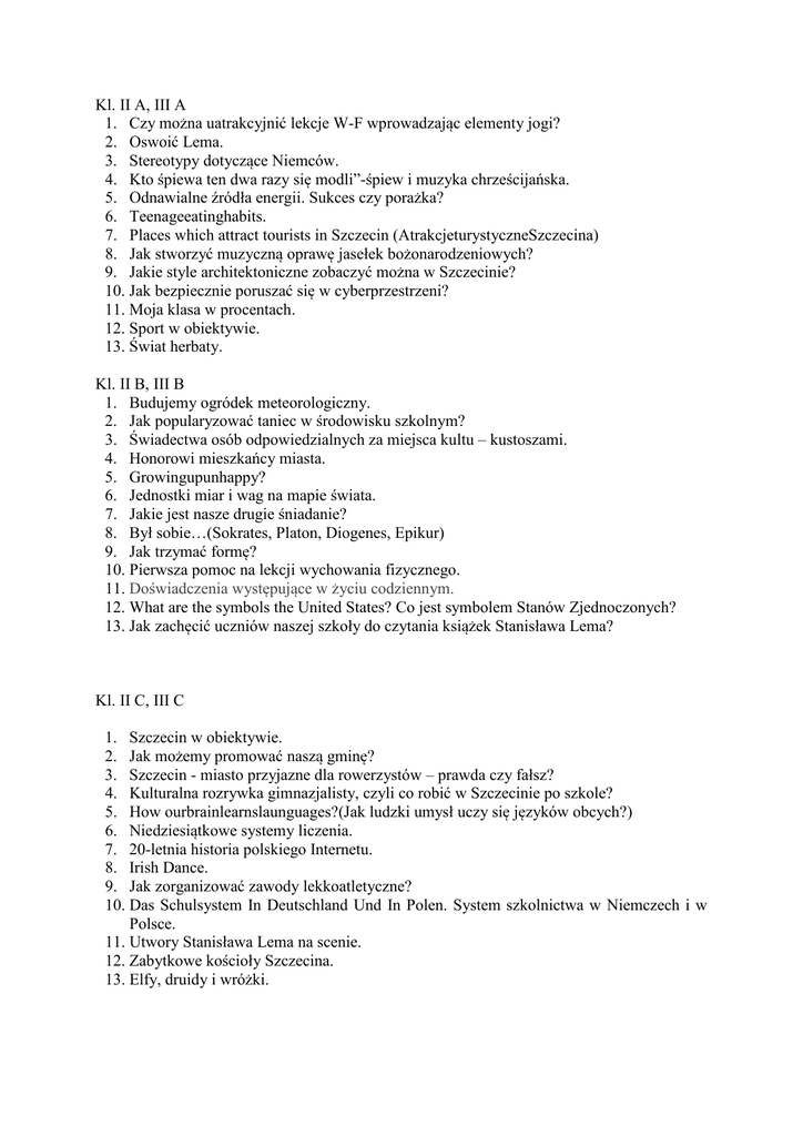 Kl. II A, III A 1. Czy można uatrakcyjnić lekcje W-F wprowadzając elementy jogi? 2. Oswoić Lema. 3. Stereotypy dotyczące Niemców. 4. Kto śpiewa ten dwa razy się modli”-śpiew i muzyka chrześcijańska. 5. Odnawialne źródła energii. Sukces czy porażka? 6. Teenageeatinghabits. 7. Places which attract tourists in Szczecin (AtrakcjeturystyczneSzczecina) 8. Jak stworzyć muzyczną oprawę jasełek bożonarodzeniowych? 9. Jakie style architektoniczne zobaczyć można w Szczecinie? 10. Jak bezpiecznie poruszać się w cyberprzestrzeni? 11. Moja klasa w procentach. 12. Sport w obiektywie. 13. Świat herbaty. Kl. II B, III B 1. Budujemy ogródek meteorologiczny. 2. Jak popularyzować taniec w środowisku szkolnym? 3. Świadectwa osób odpowiedzialnych za miejsca kultu – kustoszami. 4. Honorowi mieszkańcy miasta. 5. Growingupunhappy? 6. Jednostki miar i wag na mapie świata. 7. Jakie jest nasze drugie śniadanie? 8. Był sobie…(Sokrates, Platon, Diogenes, Epikur) 9. Jak trzymać formę? 10. Pierwsza pomoc na lekcji wychowania fizycznego. 11. Doświadczenia występujące w życiu codziennym. 12. What are the symbols the United States? Co jest symbolem Stanów Zjednoczonych? 13. Jak zachęcić uczniów naszej szkoły do czytania książek Stanisława Lema? Kl. II C, III C 1. Szczecin w obiektywie. 2. Jak możemy promować naszą gminę? 3. Szczecin - miasto przyjazne dla rowerzystów – prawda czy fałsz? 4. Kulturalna rozrywka gimnazjalisty, czyli co robić w Szczecinie po szkole? 5. How ourbrainlearnslaunguages?(Jak ludzki umysł uczy się języków obcych?) 6. Niedziesiątkowe systemy liczenia. 7. 20-letnia historia polskiego Internetu. 8. Irish Dance. 9. Jak zorganizować zawody lekkoatletyczne? 10. Das Schulsystem In Deutschland Und In Polen. System szkolnictwa w Niemczech i w Polsce. 11. Utwory Stanisława Lema na scenie. 12. Zabytkowe kościoły Szczecina. 13. Elfy, druidy i wróżki. Kl. II D, III D 1. Miejsca kultu Maryjnego w diecezji Szczecińsko – Kamieńskiej. 2. Szczecin miastem mistrzów wioślarstwa. 3. Jakie tajemnice chemiczne kryją się w naszej kuchni? 4. Mitologia i biblia w wybranych związkach frazeologicznych. 5. Figury geometryczne w Twoim pokoju. 6. Ulicą Świętoborzyców. 7. Święta Bożego Narodzenia w Polsce i w Niemczech. 8. Lekka atletyka – co wiem o sukcesach szkoły? 9. Ile angielskiego jest w polskim? – rola zapożyczeń we współczesnym języku. 10. Pęd. Zjawisko odrzutu. 11. Strona internetowa samorządu szkolnego. 12. Uwaga - bestseller! czyli książki, które mnie zachwyciły i dlatego warto je przeczytać. 13. Jak zaprezentować kulturę europejską? Kl. II E, III E 1. Pokochać teatr. 2. Jak wygląda praca sędziego piłkarskiego? 3. Wokół elektryczności. 4. Czas wolny dawniej i dziś- więcej różnic czy podobieństw? 5. Jak zwiedzić Szczecin w jeden dzień? 6. Symbol E na produktach żywnościowych – zdrowie czy nie? 7. Co można zobaczyć wędrując czerwonym szlakiem miejskim po Szczecinie? 8. Przygotowujemy sprawdzian z matematyki. 9. Józef Piłsudski w oczach współczesnej młodzieży. 10. Język niemiecki w otaczającym nas świecie. Z jakich źródeł uczymy się j. niemieckiego i do czego możemy wykorzystać go w praktyce? 11. FalseFriends – podstępne słówka. Jakie problemy mogą sprawić w nauce języka angielskiego? Jak mogą być wykorzystane w żartach i grach słownych? 12. Czy moja rodzina prowadzi zdrowy tryb życia? 13. Coca–cola, Sprite, Red Bull….-pić czy nie pić? Kl. II F, III F 1. Flagi państw Unii Europejskiej. 2. Ewolucja piłki siatkowej. 3. Nasze spotkanie z poezją. 4. Ortografia w naszych rymowankach. 5. Dom jako źródło wiedzy o jego mieszkańcach. 6. Rękodzieło w dekoracji szkolnej. 7. Co mówią drzewa? 8. Nie daj się złapać – falsefriends. 9. Ślady historii niemieckiej w Szczecinie. 10. Famous buidlings in English-speaking Znanebudowlekrajówanglojęzycznych. 11. Mój pomysł na szkolny turniej piłki nożnej. 12. Zjawiska fizyczne w reklamie telewizyjnej. 13. Jak zaplanować 3-dniową wycieczkę klasową? countries.