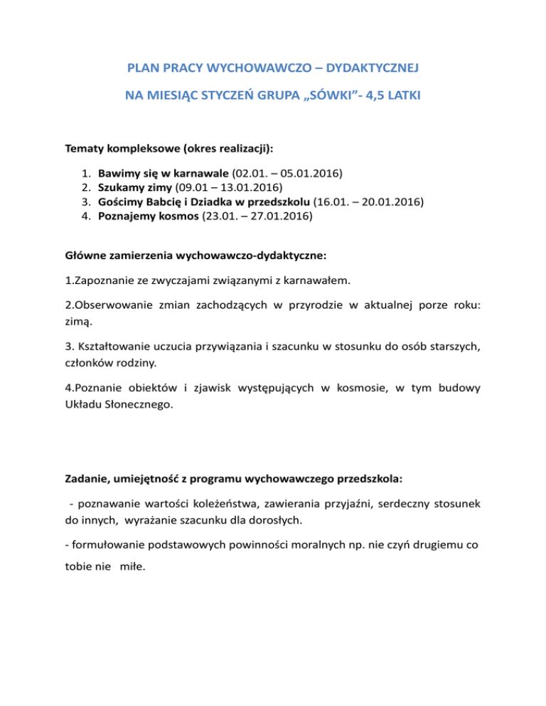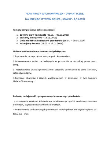 PLAN PRACY WYCHOWAWCZO – DYDAKTYCZNEJ NA MIESIĄC STYCZEŃ GRUPA „SÓWKI”- 4,5 LATKI Tematy kompleksowe (okres realizacji): 1. 2. 3. 4. Bawimy się w karnawale (02.01. – 05.01.2016) Szukamy zimy (09.01 – 13.01.2016) Gościmy Babcię i Dziadka w przedszkolu (16.01. – 20.01.2016) Poznajemy kosmos (23.01. – 27.01.2016) Główne zamierzenia wychowawczo-dydaktyczne: 1.Zapoznanie ze zwyczajami związanymi z karnawałem. 2.Obserwowanie zmian zachodzących w przyrodzie w aktualnej porze roku: zimą. 3. Kształtowanie uczucia przywiązania i szacunku w stosunku do osób starszych, członków rodziny. 4.Poznanie obiektów i zjawisk występujących w kosmosie, w tym budowy Układu Słonecznego. Zadanie, umiejętność z programu wychowawczego przedszkola: - poznawanie wartości koleżeństwa, zawierania przyjaźni, serdeczny stosunek do innych, wyrażanie szacunku dla dorosłych. - formułowanie podstawowych powinności moralnych np. nie czyń drugiemu co tobie nie miłe. Wiersz miesiąca Nowoczesna babcia tekst: M. Terlikowska Nowoczesna babcia Nie założy kapcia Woli getry od spódnicy Gdy zje ciastko zaraz ćwiczy. Zamiast kremu z czekoladą Jabłka i sałatę zjada. Kiedy proszę przebrać lalę Babcia mówi po serialu. Zamiast robótki na drucie Woli gumy Orbit żucie. Gdy spać kładę się wieczorem Marzę: o bajce z humorem O piosence do podusi - bo zasypiam w kolebusi... A muzyka z płyty gra Śpijcie dzieci a a a... Piosenka miesiąca Ufoludki autor: zespół Fasolki Mój brat wciąż czyta o kosmitach Gwiazdach, planetach i orbitach O niczym innym nie chce słyszeć Nawet do UFO listy pisze Wreszcie zasłużył na nagrodę I latający ujrzał spodek Bo wylądował dziś w ogródku Pojazd zielonych ufoludków Zielone włosy, zielone butki Całe zielone są ufoludki Kot na ich widok zaraz zmyka Dziwnego boi się ludzika Pies szybko przykrył nos ogonem Może to gryzie to zielone A czym się żywi śmieszny tworek Czy zjedzą z nami podwieczorek Kompot dostały, tort dostały Zjadły, wipiły, odleciały Zielone włosy zielone butki Całe zielone są ufludki