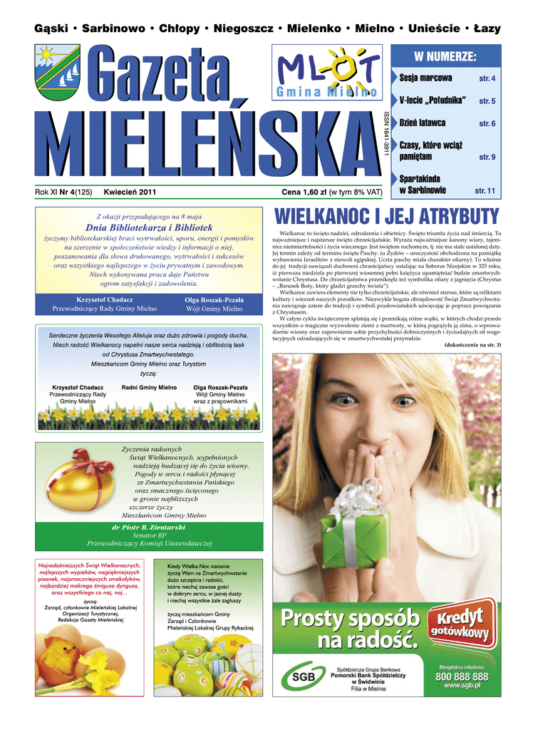 Kwiecień 2011 1 WIELKANOC I JEJ ATRYBUTY Wielkanoc to święto nadziei, odrodzenia i obietnicy. Święto triumfu życia nad śmiercią. To najważniejsze i najstarsze święto chrześcijańskie. Wyraża najważniejsze kanony wiary, tajemnice nieśmiertelności i życia wiecznego. Jest świętem ruchomym, tj. nie ma stale ustalonej daty. Jej termin zależy od terminu święta Paschy. (u Żydów – uroczystość obchodzona na pamiątkę wybawienia Izraelitów z niewoli egipskiej. Uczta paschy miała charakter ofiarny). To właśnie do jej tradycji nawiązali duchowni chrześcijańscy ustalając na Soborze Nicejskim w 325 roku, iż pierwsza niedziela po pierwszej wiosennej pełni księżyca upamiętniać będzie zmartwychwstanie Chrystusa. Do chrześcijaństwa przeniknęła też symbolika ofiary z jagnięcia (Chrystus – „Baranek Boży, który gładzi grzechy świata”). Wielkanoc zawiera elementy nie tylko chrześcijańskie, ale również starsze, które są reliktami kultury i wierzeń naszych przodków. Niezwykle bogata obrzędowość Świąt Zmartwychwstania nawiązuje zatem do tradycji i symboli prasłowiańskich uświęcając je poprzez powiązanie z Chrystusem. W całym cyklu świątecznym splatają się i przenikają różne wątki, w których chodzi przede wszystkim o magiczne wyzwolenie ziemi z martwoty, w którą pogrążyła ją zima, o wprowadzenie wiosny oraz zapewnienie sobie przychylności dobroczynnych i życiodajnych sił wegetacyjnych odradzających się w zmartwychwstałej przyrodzie. (dokończenie na str. 3) www.mielno.pl W skrócie 2 Walne MLOT 17. 03. 2011 r. odbyło się Sprawozdawczo-Wyborcze zebranie członków Mieleńskiej Lokalnej Organizacji Turystycznej. Członkowie MLOT wybrali nowe władze stowarzyszenia oraz podjęli następujące uchwały: - uchwała o przyjęciu sprawozdania merytorycznego Zarządu z działalności w 2010 r. – udzielenie absolutorium dla Zarządu MLOT; - uchwała o przyjęciu sprawozdania z działalności Komisji Rewizyjnej MLOT w 2010 r. (w tym sprawozdania finansowego MLOT za 2010 rok); - uchwały o powołaniu nowych członków Zarządu i Komisji Rewizyjnej; - uchwała o przyjęciu programu działań MLOT na 2011 r. W zebraniu uczestniczyła pani wójt Olga Roszak-Pezała, wieloletnia skarbnik organizacji, zastępca wójta Adam Klecha oraz mec. Łukasz Frankiewicz, radca prawny, który zapewniał obsługę prawną Walnego Zebrania. Członkami Zarządu zostali: - Waldemar Andrzejewski – Prezes - Piotr Laskowski – Wiceprezes - Bożena Kwolik-Marcinkowska – Sekretarz - Bożena Mas – Skarbnik - Marek Giełdon – członek Kwiecień 2011 Filmowe ferie w Gąskach 4 marca br. mieleńska biblioteka gościła przedstawicieli świetlicy „Promyk” w Gąskach, którzy przedstawili zebranym gościom film nakręcony przez dzieci w czasie ferii zimowych. Dzieci i młodzież, uczęszczająca do świetlicy, przygotowała film korzystając z animacji poklatkowej. Polegało to stworzeniu animacji na podstawie klatek będących zdjęciami. Powstały w ten sposób film wzbudził duże zainteresowanie oglądających. Zaprezentowano też cały proces tworzenia i przygotowań do prac nad filmem oraz krótkie wywiady z seniorami, którzy odpowiadali na pytania zadawane przez dzieci. Pytania dotyczyły ich dzieciństwa i życia w Gaskach. Można też było obejrzeć plakaty filmowe wykonane przez młodych artystów. Cieszy nas, że wybrano właśnie bibliotekę na miejsce gdzie można pochwalić się swoimi osiągnięciami. Dyrektor Biblioteki Danuta Maciejewska Ważne (i przydatne) telefony oraz adresy OŚRODKI ZDROWIA: MIELNO, ul. B. Chrobrego 9: CELSUS BIS tel. 94 318 92 26 MED–CARE tel. 94 316 65 15 SARBINOWO ul. Nadmorska 62, tel. 94 316 55 89 APTEKI: MIELNO, ul. B. Chrobrego 9, tel. 94 316 64 46 SARBINOWO, ul. Nadmorska 62A, tel. 94 316 57 24 UNIEŚCIE, ul. 6-Marca 45C, tel. 94 316 61 43 URZĘDY POCZTOWE: MIELNO ul. 1-maja 5, tel. 94 348 96 52 KOŚCIOŁY: MIELNO, ul. Kościelna 27, tel. 94 318 94 05 UNIEŚCIE, ul. Morska 1 tel. 94 318 91 91 SARBINOWO, ul. Nadmorska 17, tel. 94 316 57 25 Skład Komisji Rewizyjnej: - Adam Wojciechowski – Przewodniczący - Alicja Matusewicz – członek - Leszek Błażkiewicz – członek tekst i fot. szpak INNE: Pogotowie Ratunkowe tel. 999 Straż Pożarna tel. 998 Policja tel. 997 Zaprosili nas Spotkanie z senatorem Walne Grupy Rybackiej 29 marca br. w Mielnie odbyło się Sprawozdawcze Walne Zebranie Członków Stowarzyszenia Mieleńska Lokalna Grupa Rybacka. Obrady otworzył Prezes Zarządu MLGR Krzysztof Szpakiewicz, który przedstawił porzą- Sprostowanie W poprzednim wydaniu gazety w artykule pt. Analiza działalności Biblioteki Publicznej Gminy Mielno za 2010 rok omyłkowo podaliśmy liczbę czytelników mieleńskiej biblioteki oraz ilość wypożyczonych przez nich książek. Oto poprawne dane: W 2010 r. biblioteka mieleńska i jej filia zarejestrowały 1 638 czytelników, którzy wypożyczyli 22 374 książek. redakcja dek zebrania i poprowadził obrady. Porządek Walnego Zebrania przewidywał m.in.: informację Biura MLGR z zaawansowania, ocen wniosków w II naborze przez lokalne grupy rybackie w celu wyboru do realizacji LSROR w ramach PO RYBY 2007 – 2012, przedstawienie i przyjęcie sprawozdania z działalności Zarządu MLGR, omówienie i uchwalenie sprawozdania finansowego MLGR. Członkowie udzielili również absolutorium Zarządowi MLGR za 2010 r. W zebraniu uczestniczyli m.in. Wójt Gminy – Olga Roszak-Pezała, Zastępca Wójta – Adam Klecha oraz Przewodniczący Rady Gminy w Mielnie – Krzysztof Chadacz. Bogusław Adamów Biuro MLGR „Tego właśnie Jezusa wskrzesił Bóg, a my wszyscy jesteśmy tego świadkami” (Dz 2,32) SZANOWNI MIESZKAŃCY GMINY MIELNO! DRODZY CZYTELNICY GAZETY MIELEŃSKIEJ! KOCHANI PARAFIANIE! WIELKANOC to czas nadziei i życia. Bóg przybliża się do nas poprzez Wieczernik i Golgotę, a potem przez MIŁOŚĆ ukrytą w ciszy ołtarza. Jak cichy staje si