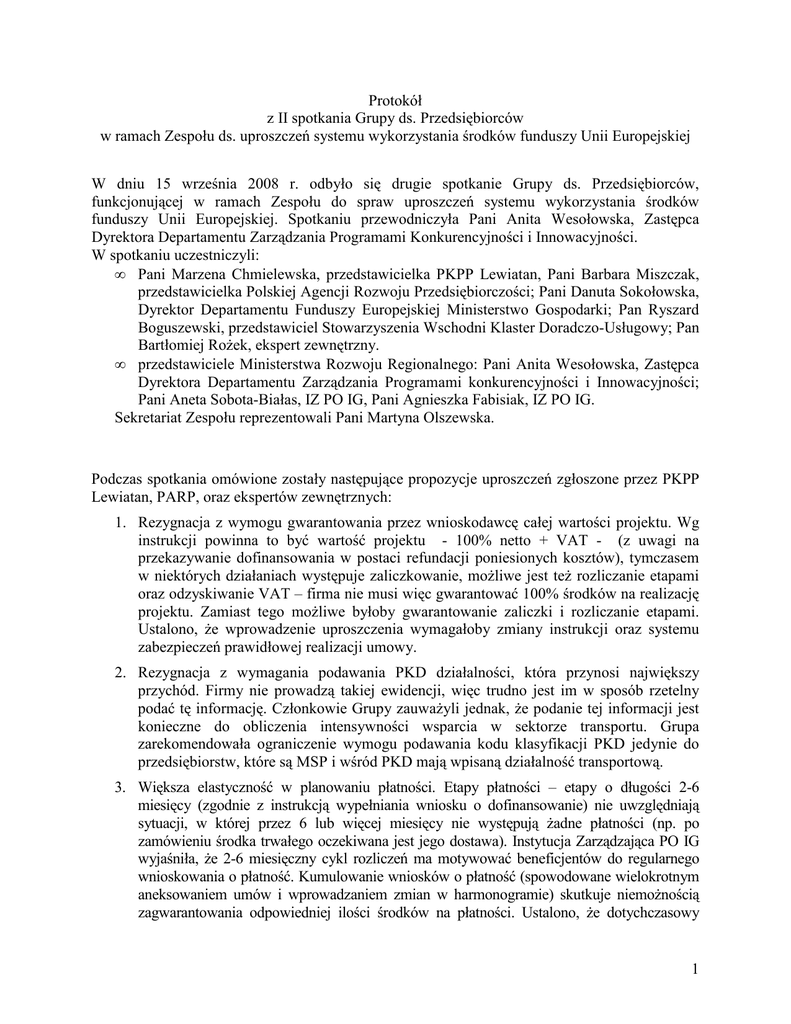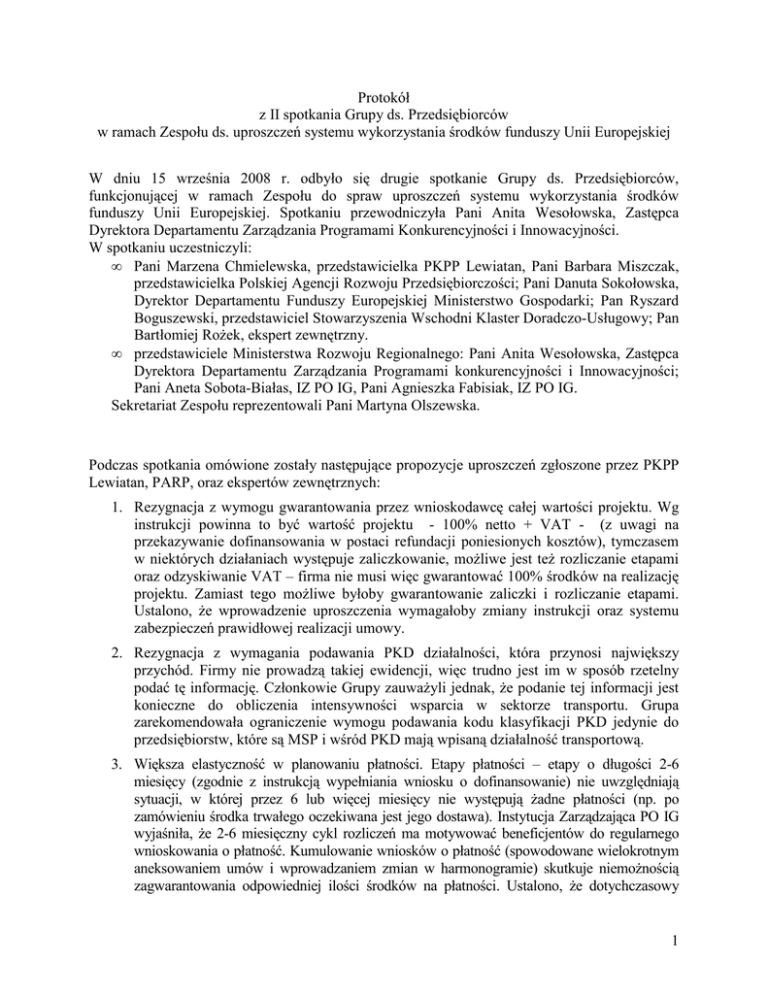 Protokół z II spotkania Grupy ds. Przedsiębiorców w ramach Zespołu ds. uproszczeń systemu wykorzystania środków funduszy Unii Europejskiej W dniu 15 września 2008 r. odbyło się drugie spotkanie Grupy ds. Przedsiębiorców, funkcjonującej w ramach Zespołu do spraw uproszczeń systemu wykorzystania środków funduszy Unii Europejskiej. Spotkaniu przewodniczyła Pani Anita Wesołowska, Zastępca Dyrektora Departamentu Zarządzania Programami Konkurencyjności i Innowacyjności. W spotkaniu uczestniczyli: • Pani Marzena Chmielewska, przedstawicielka PKPP Lewiatan, Pani Barbara Miszczak, przedstawicielka Polskiej Agencji Rozwoju Przedsiębiorczości; Pani Danuta Sokołowska, Dyrektor Departamentu Funduszy Europejskiej Ministerstwo Gospodarki; Pan Ryszard Boguszewski, przedstawiciel Stowarzyszenia Wschodni Klaster Doradczo-Usługowy; Pan Bartłomiej RoŜek, ekspert zewnętrzny. • przedstawiciele Ministerstwa Rozwoju Regionalnego: Pani Anita Wesołowska, Zastępca Dyrektora Departamentu Zarządzania Programami konkurencyjności i Innowacyjności; Pani Aneta Sobota-Białas, IZ PO IG, Pani Agnieszka Fabisiak, IZ PO IG. Sekretariat Zespołu reprezentowali Pani Martyna Olszewska. Podczas spotkania omówione zostały następujące propozycje uproszczeń zgłoszone przez PKPP Lewiatan, PARP, oraz ekspertów zewnętrznych: 1. Rezygnacja z wymogu gwarantowania przez wnioskodawcę całej wartości projektu. Wg instrukcji powinna to być wartość projektu - 100% netto + VAT - (z uwagi na przekazywanie dofinansowania w postaci refundacji poniesionych kosztów), tymczasem w niektórych działaniach występuje zaliczkowanie, moŜliwe jest teŜ rozliczanie etapami oraz odzyskiwanie VAT – firma nie musi więc gwarantować 100% środków na realizację projektu. Zamiast tego moŜliwe byłoby gwarantowanie zaliczki i rozliczanie etapami. Ustalono, Ŝe wprowadzenie uproszczenia wymagałoby zmiany instrukcji oraz systemu zabezpieczeń prawidłowej realizacji umowy. 2. Rezygnacja z wymagania podawania PKD działalności, która przynosi największy przychód. Firmy nie prowadzą takiej ewidencji, więc trudno jest im w sposób rzetelny podać tę informację. Członkowie Grupy zauwaŜyli jednak, Ŝe podanie tej informacji jest konieczne do obliczenia intensywności wsparcia w sektorze transportu. Grupa zarekomendowała ograniczenie wymogu podawania kodu klasyfikacji PKD jedynie do przedsiębiorstw, które są MSP i wśród PKD mają wpisaną działalność transportową. 3. Większa elastyczność w planowaniu płatności. Etapy płatności – etapy o długości 2-6 miesięcy (zgodnie z instrukcją wypełniania wniosku o dofinansowanie) nie uwzględniają sytuacji, w której przez 6 lub więcej miesięcy nie występują Ŝadne płatności (np. po zamówieniu środka trwałego oczekiwana jest jego dostawa). Instytucja Zarządzająca PO IG wyjaśniła, Ŝe 2-6 miesięczny cykl rozliczeń ma motywować beneficjentów do regularnego wnioskowania o płatność. Kumulowanie wniosków o płatność (spowodowane wielokrotnym aneksowaniem umów i wprowadzaniem zmian w harmonogramie) skutkuje niemoŜnością zagwarantowania odpowiedniej ilości środków na płatności. Ustalono, Ŝe dotychczasowy 1 cykl wnioskowania o płatność zostanie utrzymany, jednakŜe w przypadku braku płatności do wniosku wpisywane będzie 0. Grupa skierowała się z prośbą do przedstawicielki PKPP Lewiatan o sformułowanie propozycji zapisów pozwalających na ustaleniu cyklu rozliczeń w oparciu o załączony do projektu harmonogram realizacji projektu. 4. Większa elastyczność w określeniu terminu złoŜenia wniosku o płatność – np. do dwóch miesięcy po zakończeniu zadania. Dochowanie terminu 30 dni po zakończeniu zadania jest trudne np. w przypadku wynagrodzeń (z uwagi na harmonogram płatności ZUS). Instytucja Zarządzająca wyjaśniła, Ŝe propozycja jest częściowo uwzględniona (w przypadku kosztów personelu) oraz Ŝe terminy na złoŜenie wniosku o płatność w tych działaniach PO IG, w których jest to konieczne zostaną wydłuŜone. 5. Rezygnacja ze stosowania kryterium poziomu rozprzestrzenienia technologii na rynku (kryterium dyfuzji) w ramach działania 4.4 PO IG – kryterium jest w zasadzie nieweryfikowalne, poniewaŜ brakuje jednoznacznej metodologii i danych, w oparciu o które ocena mogłaby być zobiektywizowana. Pani Dyrektor Danuta Sokołowska (MG, IP) wyjaśniła, Ŝe kryterium zostało ustalone ze względu na istnienie branŜ, w których czas od powstania do wdroŜenia technologii jest bardzo długi (firmom trudno byłoby spełnić kryterium czasowe). Dyskusja dotyczyła problemu projektów, które nie są innowacyjne wmyśl PO IG, lecz korzystają z kryterium rozprzestrzenienia poniewaŜ jest ono nieostre i trudne do weryfikacji. Przedstawicielka PARP (IP) zasugerowała, Ŝe kryterium moŜe być naduŜywane i niektóre opinie mogą być kwestionowane przez ekspertów oceniających projekty. Przedstawiciel przedsiębiorców zgłosił zastrzeŜenie dotyczące trudności uzyskania potwierdzenia spełnienia kryterium rozprzestrzenienia w niektórych przypadkach. Ustalono, Ŝe w celu zapobiegania potencjalnym nierównościom w dostępie do środków pomocowych kryterium to zostanie przeanalizowane po obecnej i przed następną rundą aplikacyjną. Grupa zobowiązała się do próby wypracowania standardu bezstronnej opinii dotyczącej rozprzestrzenienia innowacji. 6. Przeniesienie kryterium eksportowego z wskaźników produktu do wskaźników rezultatu – Grupa zgodziła się na dokonanie proponowanej zmiany. 7. Modyfikacja definicji „eksportu usług”, np. w oparciu o kraj pochodzenia klienta (zleceniodawcy). Definicja eksportu usług na potrzeby podatkowe (decyduje miejsce świadczenia usługi) dyskryminuje firmy oparte o najnowocześniejsze technologie, świadczące usługi on – line lub świadczące usługi w Polsce na zlecenie podmiotów zagranicznych. Zasugerowano zmianę 