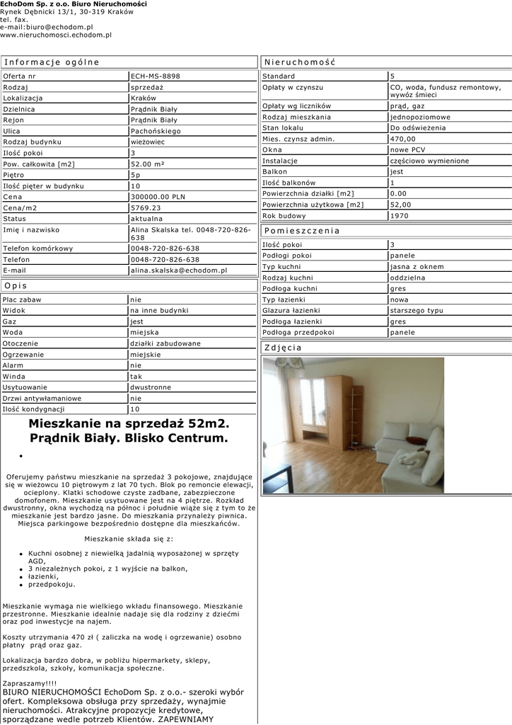 EchoDom Sp. z o.o. Biuro Nieruchomości Rynek Dębnicki 13/1, 30-319 Kraków tel. fax. e-mail:[email protected] www.nieruchomosci.echodom.pl Informacje ogólne Nieruchomość Oferta nr ECH-MS-8898 Standard 5 Rodzaj sprzedaż Opłaty w czynszu Lokalizacja Kraków CO, woda, fundusz remontowy, wywóz śmieci Dzielnica Prądnik Biały Opłaty wg liczników prąd, gaz Prądnik Biały Rodzaj mieszkania jednopoziomowe Ulica Pachońskiego Stan lokalu Do odświeżenia Rodzaj budynku wieżowiec Mies. czynsz admin. 470,00 3 Okna nowe PCV 52.00 m² Instalacje częściowo wymienione 5p Balkon jest 10 Ilość balkonów 1 Cena 300000.00 PLN Powierzchnia działki [m2] 0.00 Cena/m2 5769.23 Powierzchnia użytkowa [m2] 52,00 Status aktualna Rok budowy 1970 Imię i nazwisko Alina Skalska tel. 0048-720-826638 Pomieszczenia Telefon komórkowy 0048-720-826-638 Rejon Ilość pokoi Pow. całkowita [m2] Piętro Ilość pięter w budynku Telefon 0048-720-826-638 E-mail [email protected] Opis Ilość pokoi 3 Podłogi pokoi panele Typ kuchni jasna z oknem Rodzaj kuchni oddzielna Podłoga kuchni gres Plac zabaw nie Typ łazienki nowa Widok na inne budynki Glazura łazienki starszego typu Gaz jest Podłoga łazienki gres Woda miejska Podłoga przedpokoi panele Otoczenie działki zabudowane Ogrzewanie miejskie Alarm nie Winda tak Usytuowanie dwustronne Drzwi antywłamaniowe nie Ilość kondygnacji 10 Mieszkanie na sprzedaż 52m2. Prądnik Biały. Blisko Centrum. Oferujemy państwu mieszkanie na sprzedaż 3 pokojowe, znajdujące się w wieżowcu 10 piętrowym z lat 70 tych. Blok po remoncie elewacji, ocieplony. Klatki schodowe czyste zadbane, zabezpieczone domofonem. Mieszkanie usytuowane jest na 4 piętrze. Rozkład dwustronny, okna wychodzą na północ i południe wiąże się z tym to że mieszkanie jest bardzo jasne. Do mieszkania przynależy piwnica. Miejsca parkingowe bezpośrednio dostępne dla mieszkańców. Mieszkanie składa się z: Kuchni osobnej z niewielką jadalnią wyposażonej w sprzęty AGD, 3 niezależnych pokoi, z 1 wyjście na balkon, łazienki, przedpokoju. Mieszkanie wymaga nie wielkiego wkładu finansowego. Mieszkanie przestronne. Mieszkanie idealnie nadaje się dla rodziny z dziećmi oraz pod inwestycje na najem. Koszty utrzymania 470 zł ( zaliczka na wodę i ogrzewanie) osobno płatny prąd oraz gaz. Lokalizacja bardzo dobra, w pobliżu hipermarkety, sklepy, przedszkola, szkoły, komunikacja społeczne. Zapraszamy!!!! BIURO NIERUCHOMOŚCI EchoDom Sp. z o.o.- szeroki wybór ofert. Kompleksowa obsługa przy sprzedaży, wynajmie nieruchomości. Atrakcyjne propozycje kredytowe, sporządzane wedle potrzeb Klientów. ZAPEWNIAMY Zdjęcia PROFESJONALIZM I BEZPIECZEŃSTWO ZAWIERANYCH TRANSAKCJI. © Wszelkie prawa zastrzeżone - EchoDom