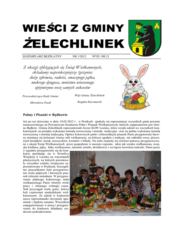 WIEŚCI Z GMINY ŻELECHLINEK EGZEMPLARZ BEZPŁATNY NR 1/2012 WYD. NR 21 Z okazji zbliżających się Świąt Wielkanocnych, składamy najserdeczniejsze życzenia: dużo zdrowia, radości, smacznego jajka, mokrego dyngusa, mnóstwo wiosennego optymizmu oraz samych sukcesów Przewodnicząca Rady Gminy Wójt Gminy Żelechlinek Mirosława Pasik Bogdan Kaczmarek Palmy i Pisanki w Będkowie Już po raz dziewiąty w dniu 18.03.2012 r. w Prażkach spotkały się reprezentacje wszystkich gmin powiatu tomaszowskiego na Powiatowym Konkursie Palm i Pisanek Wielkanocnych, których organizatorem jest Gmina Będków. Gminę Żelechlinek reprezentowało liczne KGW Lesisko, które wzięło udział we wszystkich konkurencjach: na pisankę wykonana metodą nowoczesną i metodą tradycyjna oraz na palmę wykonana metodą nowoczesną i metodą tradycyjną. Oprócz kolorowych palm i różnorodnych pisanek Panie przygotowały barwny mieniący się kolorami wiosny stół wielkanocny, na którym zgodnie z tradycją nie zabrakło owsa, pieczonych baranków, kurek, koszyczków, kwiatów z bibuły. Na stole znalazły się również potrawy przygotowywane z okazji Świąt Wielkanocnych przez gospodynie w naszym regionie, takie jak szynka wielkanocna, swojska kiełbasa, jajka, baby wielkanocne, mazurki serniki, drożdżowce i na lepsze trawienie nalewki. Panie przez 2 tygodnie przygotowały się do konkursu spotykając się w Świetlicy Wiejskiej w Lesisku na warsztatach plastycznych, na których powstawały wszystkie ozdoby świąteczne zaprezentowane w Prażkach. Szczególnie pracochłonne było przygotowanie wielu pięknych i barwnych pisanek różnymi metodami. W przygotowanie pięknego kolorowego stołu wielkanocnego Panie włożyły wiele pracy i własnego wolnego czasu. Stół przyciągał wielu gości, którzy byli częstowani smakołykami wielkanocnymi. Za udział w konkursie nasze reprezentantki otrzymały upominek i dyplom uznania. Wszystkim zaangażowanym w pracę i przygotowania do konkursu składamy serdeczne podziękowania. Żelechlinek, 30.03.2012r. INFORMACJA DLA ROLNIKÓW Wójt Gminy Żelechlinek informuje rolników o możliwości zgłaszania szkód w gospodarstwach rolnych spowodowanych ujemnymi skutkami przezimowania. Zgodnie z obowiązującymi procedurami szkody w oziminach mogą być szacowane dopiero po rozpoczęciu okresu wegetacji. Jednak w związku z koniecznością przesiewów niektórych upraw roślin ozimych konieczne jest dokonanie ich lustracji przez gminną komisję ds. szacowania szkód przed ich zaoraniem. W związku z powyższym proszę o zgłaszanie informacji o powierzchni upraw uszkodzonych w wyniku ujemnych skutków przezimowania. Z uwagi na charakter sprawy proszę o składanie informacji w możliwie najkrótszym terminie w Urzędzie Gminy w Żelechlinku w pok. nr 5. Jednocześnie informuję, że aby uzyskać pomoc, poziom szkód upraw rolnych musi być wyższy niż 30% średniej rocznej produkcji w gospodarstwie rolnym z trzech lat poprzedzających rok, w którym wystąpiły szkody (łącznie produkcja roślinna i zwierzęca). 1% dla ŁÓDZKIEGO Dzięki organizacjom pozarządowym nasze życie – także społeczne - jest ciekawsze, bogatsze i pełniejsze. Ich codzienna, często trudna i mozolna, praca to wypełnianie misji, z myślą o dobru wspólnym. To uporczywa walka o jakość społecznego życia. Wypełniając zeznanie podatkowe, przekażmy im Nasz 1%. Zróbmy to z pożytkiem dla siebie, sąsiadów, wszystkich mieszkańców regionu! W zeszłym roku, w ramach 1%, podatnicy z województwa łódzkiego przekazali 23 mln zł organizacjom pożytku publicznego. Niestety, tylko 9 mln z tej kwoty trafiło do organizacji z naszego regionu. Oznacza to, że jako województwo straciliśmy 14 mln zł, które służyć mogły naszym mieszkańcom, rozwiązywać nasze problemy. Chcemy to zmienić! W województwie łódzkim w tym roku do skorzystania ze wsparcia w ramach mechanizmu 1% uprawnione są 364 organizacje. Ich wykaz znajdą Państwo w bazie organizacji na naszej stronie oraz w urzędach skarbowych na terenie województwa. Zainteresujmy się organizacjami działającymi obok nas, a przede wszystkim dla Nas! Pomóżmy - przekazując im 1%, a wszyscy na tym zyskamy! Przekazując 1 proc. podatku „naszym” organizacjom, sprawimy, że te pieniądze w dużej części będą wspierać nasze inicjatywy, pomagać w rozwiązywaniu naszych problemów, a tym samym przyczyniać się do rozwoju naszego regionu. Kampania ta nie odniesie sukcesu bez Państwa pomocy i zaangażowania. Zachęcamy do oddania swojego 1% na organizacje pozarządowe z województwa łódzkiego! 2 Tłusty czwartek… oczywiście obficie i kalorycznie. W naszej polskiej tradycji tłusty czwartek to dzień, w którym nikt nie liczy kalorii i do dobrego tonu należy tego dnia zjeść jak najwięcej tłustych i kalorycznych pokarmów. Tego dnia wszyscy prześcigają się w jedzeniu pączków, których nie brakuje w żadnej cukierni i sklepie, a każda szanująca się gospodyni wypieka je dla swoich domowników. Tradycja mówi, że im więcej zjedzonych pączków tym większy dostatek i szczęście przez cały rok. Aby porównać smaki pączków, faworków i innych specjałów ostatkowych KGW Żelechlinek zorganizowało degustację tych wszystkich przysmaków w tym dniu w Gminnym Domu Kultury w Żelechlinku. Na degustację zaproszono przedstawicielki Kół Gospodyń z Gminy Żelechlinek. Stół zaczął zapełniać się różnego rodzaju pączka- mi, faworkami, różami karnawałowymi, bułeczkami drożdżowymi, ciastami. Panie zadbały również o bardziej konkretne potrawy, aby zbytnio się nie zasłodzić. Stoły uginały się pod przysmakami, wszyscy degustowali bez wyrzutów sumienia bo przecież jak degustacja to degustacja, trzeba spróbować wszystkiego. W końcu można sobie obiecać, że w czasie postu, będzie można pozbyć się nagromadzonych podczas karnawału kalorii. Dzień Kobiet 8 marca to dzień w który
