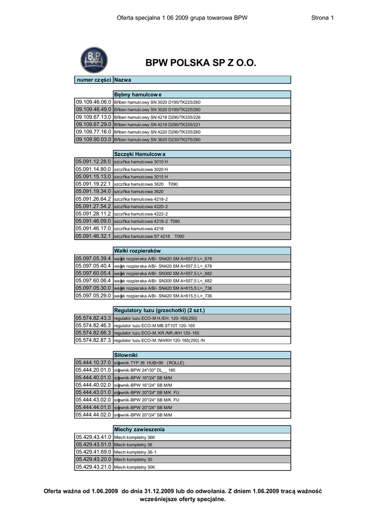Oferta specjalna 1 06 2009 grupa towarowa BPW