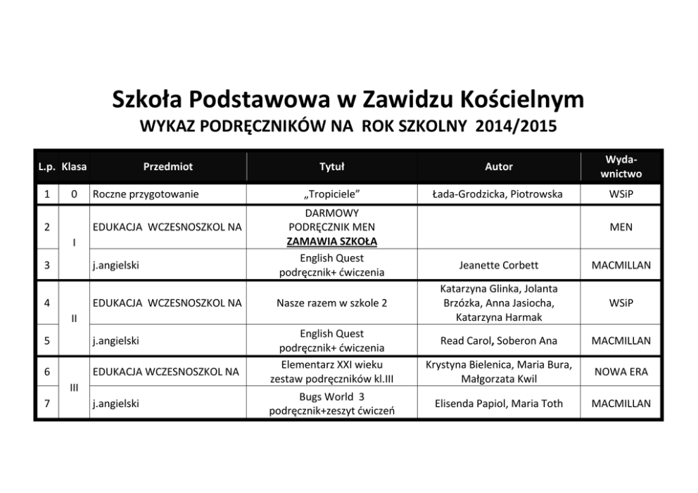 Szkoła Podstawowa w Zawidzu Kościelnym WYKAZ PODRĘCZNIKÓW NA ROK SZKOLNY 2014/2015 L.p. Klasa 1 0 2 Przedmiot Roczne przygotowanie EDUKACJA WCZESNOSZKOL NA I 3 j.angielski 4 EDUKACJA WCZESNOSZKOL NA Tytuł Autor Wydawnictwo „Tropiciele” Łada-Grodzicka, Piotrowska WSiP DARMOWY PODRĘCZNIK MEN ZAMAWIA SZKOŁA English Quest podręcznik+ ćwiczenia Nasze razem w szkole 2 II 5 j.angielski 6 EDUKACJA WCZESNOSZKOL NA III 7 j.angielski English Quest podręcznik+ ćwiczenia Elementarz XXI wieku zestaw podręczników kl.III Bugs World 3 podręcznik+zeszyt ćwiczeń MEN Jeanette Corbett MACMILLAN Katarzyna Glinka, Jolanta Brzózka, Anna Jasiocha, Katarzyna Harmak WSiP Read Carol, Soberon Ana MACMILLAN Krystyna Bielenica, Maria Bura, Małgorzata Kwil NOWA ERA Elisenda Papiol, Maria Toth MACMILLAN KLASA IV 8 IV j.polski 9 IV j.angielski 10 IV Matematyka 11 IV Przyroda 12 IV Historia 13 IV Plastyka/Muzyka 14 15 IV IV INFORMATYKA TECHNIKA „Teraz polski” Anna Klimowicz podręcznik+ zeszyt ćwiczeń NOWA ERA Today 1 Podręcznik i zeszyt ćwiczeń Dawid Todd, T.Thompson PEARSON Praca zbiorowa M.Dobrowolskiej GWO Matematyka z plusem- zgodna z nową podstawa programową Tajemnice przyrody Podręcznik + 2 zestawy ćwiczeń My i Historia Plastyka IV-VI, Muzyka i my -IV BEZ PODRĘCZNIKA BEZ PODRĘCZNIKA M. Marko. Worłowska Feliks Szlajfer, Joanna Stawarz Wiesława Surdyk-Fertsch, Bogumiła Olszewska K.Stopczyk / R.Rataj NOWA ERA PWN WSiP KLASA V 16 V j.polski 17 V j.angielski 18 V Matematyka 19 V 20 21 TERAZ POLSKI Steps In English 2 A.Klimowicz NOWA ERA Podręcznik + zeszyt ćwiczeń Matematyka z plusem Sylvia Wheeldon, Paul Shipton OXFORD Praca zbiorowa M.Dobrowolskiej GWO Przyroda „Tajemnice przyrody” Janina Ślusarczyk, Feliks Szlajfer NOWA ERA V Historia My i historia Wiesława Surdyn-Fertsh PWN V Muzyka Muzyka i my WSiP KLASA VI 22 VI j.polski „Teraz polski” 23 VI j.angielski 24 VI Matematyka 25 VI Przyroda 26 VI Historia A.Klimowicz NOWA ERA Steps In English 3 Sylvia Wheeldon, Paul Shipton Podręcznik +zeszyt ćwiczeń Matematyka z plusem Praca zbiorowa M.Dobrowolskiej „Tajemnice przyrody” Joanna Stawarz, Feliks Szlajfer, Podręcznik+ 2 cz. Zeszytu ćwiczeń Hanna Kowalczyk My i historia Wiesława Surdyn-Fertsh OXFORD GWO NOWA ERA PWN RELIGIA (podręczniki zamawiają katecheci) L.P. 27 KLASA TYTUŁ AUTOR Jesteśmy rodziną Boga A.Krasiński 28 I A.Krasiński 29 II Jesteśmy w rodzinie Pana Jezusa Kochamy Pana Jezusa 30 III Przyjmujemy Pana Jezusa A.Krasiński 31 IV V VI Zaproszeni przez Boga Bóg mnie kocha Bóg mnie przemienia Z.Marek E.Osewska, ks.J.Stala E.Osewska, ks.J.Stala 32 33 RELIGIA 0 A.Krasiński WYDAWNICTWO Płocki Instytut Wydawniczy Płocki Instytut Wydawniczy Płocki Instytut Wydawniczy Płocki Instytut Wydawniczy WAM Biblos Biblos