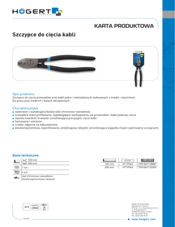 KARTA PRODUKTOWA Szczypce do cięcia kabli Opis produktu Szczypce do cięcia przewodów oraz kabli jedno i wielożyłowych wykonanych z miedzi i aluminium. Do pracy przy średnich i dużych obciążeniach. Charakterystyka wykonane z wysokogatunkowej stali chromowo-wanadowej krawędzie tnące profilowane, zapobiegające wyślizgiwaniu się przewodów i kabli podczas cięcia wysoka twardość krawędzi umożliwiająca precyzyjne cięcie kabli hartowane i ostrzone trwałe, odporne na odkształcenia dwukomponentowa, wyprofilowana, antyślizgowa rękojeść umożliwiająca wygodny chwyt i operowanie szczypcami Dane techniczne 160 mm 200 mm 1 szt. 160 mm 200 mm HT1P042 HT1P044 5901867128881 5901867125569 6 szt. stal chromowo-wanadowa dwukomponentowa rękojeść Högert Technik GmbH Dystrybucja w Polsce GTV Sp. z o. o. Dystrybucja S. K. A. ul. Przejazdowa 21 05-800 Pruszków, Polska tel. +48 22 444 73 44 fax +48 22 444 75 01 06.2015 www.hoegert.com