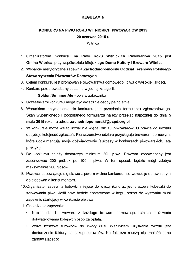 REGULAMIN KONKURS NA PIWO ROKU WITNICKICH PIWOWARIÓW 2015 20 czerwca 2015 r. Witnica 1. Organizatorem Konkursu na Piwo Roku Witnickich Piwowariów 2015 jest Gmina Witnica, przy współudziale Miejskiego Domu Kultury i Browaru Witnica. 2. Wsparcie merytoryczne zapewnia Zachodniopomorski Oddział Terenowy Polskiego Stowarzyszenia Piwowarów Domowych. 3. Celem konkursu jest promowanie piwowarstwa domowego i piwa o wysokiej jakości. 4. Konkurs przeprowadzony zostanie w jednej kategorii: ◦ Golden/Summer Ale - opis w załączniku 5. Uczestnikami konkursu mogą być wyłącznie osoby pełnoletnie. 6. Warunkiem przystąpienia do konkursu jest przesłanie formularza zgłoszeniowego. Skan wypełnionego i podpisanego formularza należy przesłać najpóźniej do dnia 5 maja 2015 roku na adres: [email protected] 7. W konkursie może wziąć udział nie więcej niż 10 piwowarów. O prawie do udziału decyduje kolejność zgłoszeń. Pierwszeństwo udziału przysługuje browarom domowym, które udokumentują swoje doświadczenie (sukcesy w konkursach piwowarskich, lata praktyki). 8. Do konkursu należy dostarczyć minimum 20L piwa. Piwowar zobowiązany jest zaserwować 200 próbek po 100ml piwa. W ten sposób będzie mógł zdobyć maksymalnie 200 głosów. 9. Piwowar zobowiązuje się stawić z piwem w dniu konkursu i serwować je uprawnionym do głosowania konsumentom. 10. Organizator zapewnia lodówki, miejsce do wyszynku oraz jednorazowe kubeczki do serwowania piwa. Jeśli piwo będzie dostarczone w kegu, sprzęt do wyszynku musi zapewnić startujący w konkursie piwowar. 11. Organizator zapewnia: • Nocleg dla 1 piwowara z każdego browaru domowego. Istnieje możliwość dokwaterowania kolejnych osób za opłatą. • Zwrot kosztów surowców do kwoty 80zł. Warunkiem uzyskania zwrotu jest dostarczenie faktury na zakup surowców. Na fakturze muszą się znaleźć dane zamawiającego: Miejski Dom Kultury ul. Gorzowska 22 66-460 Witnica NIP: 599-295-16-39 • Zwrot kosztów dojazdu do kwoty 150zł (50gr za kilometr) w postaci talonów na paliwo. • Wyżywienie dla maksymalnie 2 osób z każdego browaru domowego. Warunkiem korzystania z powyższych uprawnień jest wypełnienie obowiązków wyszczególnionych w punktach 8 i 9. 12. Podczas Konkursu piwo będzie oceniane przez konsumentów. Wyklucza się by piwowar mógł oceniać własne, wystawione do Konkursu piwo. 13. W przypadku dwóch lub więcej piw, które otrzymają taką samą ilość punktów o rozstrzygnięciu zadecyduje 3-osobowe jury złożone z przedstawicieli Browaru Witnica, Gminy Witnica i Polskiego Stowarzyszenia Piwowarów Domowych. 14. Organizator zastrzega sobie prawo do odwołania konkursu, jeśli liczba zgłoszeń będzie mniejsza niż 5. 15. Uczestnicy zgadzają się na upublicznienie swojego imienia i nazwiska oraz zajętego miejsca. 16. Zwycięzca konkursu otrzyma Medal Piwo Roku Witnickich Piwowariów 2015 oraz nagrodę, autorzy pięciu kolejnych piw (miejsca 2-6) otrzymają nagrody, a pozostali uczestnicy upominki. 17. Wręczenie nagród odbędzie się w dniu konkursu. 18. Zwycięzca konkursu zobowiązuje się upublicznić recepturę zwycięskiego piwa. 19. Organizatorzy zastrzegają sobie prawo do zmiany Regulaminu w przypadku wystąpienia istotnych i nieprzewidzianych okoliczności zewnętrznych. KONKURS NA PIWO ROKU WITNICKICH PIWOWARIÓW 2015 20 czerwca 2015 r. Witnica FORMULARZ ZGŁOSZENIOWY Imię i nazwisko: ........................................................................................................... Nazwa browaru: ........................................................................................................... Ulica: ........................................................................................................... Miasto: ........................................................................................................... Kod pocztowy: ........................................................................................................... Telefon: ........................................................................................................... Adres e-mail: ........................................................................................................... Doświadczenie*: ........................................................................................................... ........................................................................................................... ........................................................................................................... ........................................................................................................... * Opisz swoje doświadczenie piwowarskie (lata doświadczeń, udział i sukcesy w konkursach, itp.) Oświadczenie: Oświadczam, że jestem twórcą zgłoszonych piw oraz osobą pełnoletnią. Akceptuję postanowienia Regulaminu KONKURS NA PIWO ROKU WITNICKICH PIWOWARIÓW 2015. _____________________________ Miejscowość, data i podpis Piwowara Golden Ale / Summer Ale Aromat: Aromaty chmielowe od niskiej do średniej intensywności, głównie z tradycyjnych brytyjskich odmian chmieli, chmiele amerykańskie też są dopuszczalne, lecz nie powinny dominować. Aromaty owocowe na poziomie od niskiego do średniego, ale raczej pochodzące od chmielu niż od estrów. Niska zawartość dwuacetylu jest akceptowalna. Barwa: Od słomkowej do ciemnozłotej, dobra klarowność. Biała piana, niekoniecznie obfita, aczkolwiek dobrze utrzymująca się. Smak: Goryczka od średniej do średnio-wysokiej, smaki chmielowe raczej niskie, niedominujące. Nuty słodowe powinny być chlebowe, biszkoptowe, słodowość na niskim poziomie. Smaki karmelowe generalnie nieobecne. Smaki owocowe są akceptowalne na poziomach od niskiego do średniego. Goryczka powinna dobrze balansować słodowość, a piwo nie może być odczuwane jako słodkie. Możliwy jest niski poziom dwuacetylu. Tekstu