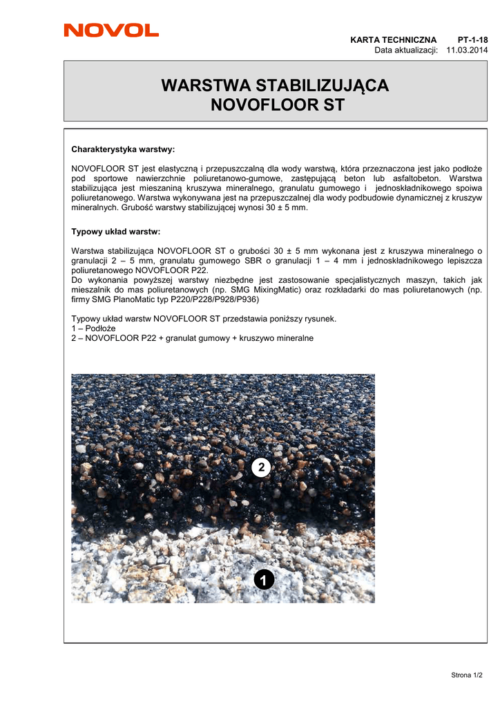 KARTA TECHNICZNA PT-1-18 Data aktualizacji: 11.03.2014 WARSTWA STABILIZUJĄCA NOVOFLOOR ST Charakterystyka warstwy: NOVOFLOOR ST jest elastyczną i przepuszczalną dla wody warstwą, która przeznaczona jest jako podłoże pod sportowe nawierzchnie poliuretanowo-gumowe, zastępującą beton lub asfaltobeton. Warstwa stabilizująca jest mieszaniną kruszywa mineralnego, granulatu gumowego i jednoskładnikowego spoiwa poliuretanowego. Warstwa wykonywana jest na przepuszczalnej dla wody podbudowie dynamicznej z kruszyw mineralnych. Grubość warstwy stabilizującej wynosi 30 ± 5 mm. Typowy układ warstw: Warstwa stabilizująca NOVOFLOOR ST o grubości 30 ± 5 mm wykonana jest z kruszywa mineralnego o granulacji 2 – 5 mm, granulatu gumowego SBR o granulacji 1 – 4 mm i jednoskładnikowego lepiszcza poliuretanowego NOVOFLOOR P22. Do wykonania powyższej warstwy niezbędne jest zastosowanie specjalistycznych maszyn, takich jak mieszalnik do mas poliuretanowych (np. SMG MixingMatic) oraz rozkładarki do mas poliuretanowych (np. firmy SMG PlanoMatic typ P220/P228/P928/P936) Typowy układ warstw NOVOFLOOR ST przedstawia poniższy rysunek. 1 – Podłoże 2 – NOVOFLOOR P22 + granulat gumowy + kruszywo mineralne 2 1 Strona 1/2 KARTA TECHNICZNA PT-1-18 Data aktualizacji: 11.03.2014 Konstrukcja podbudowy: Podbudowa z kruszywa łamanego powinna być zgodna z projektem technicznym oraz spełniać ogólne wymagania dotyczące wykonania i odbioru robót pod nawierzchnie boisk. Przykładowy układ warstw podbudowy: - grunt rodzimy - rury drenarskie zasypane kruszywem płukanym (8-16 mm) w gruncie rodzimym – grubość około 400mm - zagęszczona podsypka piaskowa – grubość około 100mm - kruszywo łamane (5-40mm) – grubość około 150mm - kruszywo łamane (0-6mm) – grubość około 50mm Kolejność wykonywania prac: Do mieszalnika typu MixingMatic wsypać odważone ilości kruszywa i granulatu gumowego SBR w odpowiednim stosunku wagowym. Dokładnie wymieszać. Do tak przygotowanej mieszanki kruszywa i granulatu dodać odpowiednią ilość lepiszcza poliuretanowego w zależności od typu warstwy jaką chcemy uzyskać. Zachować wagowy stosunek mieszania składników. Całość wymieszać przez około 5 minut. Gotową mieszaninę kruszywa, granulatu i lepiszcza poliuretanowego aplikować przy pomocy rozkładarki do mas poliuretanowych na przygotowanej wcześniej podbudowie. Warstwę stabilizującą pozostawić do utwardzenia. Czas wiązania spoiwa poliuretanowego zależy od wilgotności powietrza. W temperaturze 20ºC następne warstwy można nakładać po 24 godzinach. Pomiędzy wykonaniem podkładu stabilizującego a ułożeniem na nim nawierzchni sportowej nie powinno minąć więcej niż 48 godzin. W zależności od projektu technicznego podbudowy istnieje możliwość wykonania warstwy NOVOFLOOR ST jako twardej lub elastycznej. Tabela składu dla poszczególnych typów podkładu dla maksymalnej grubości warstwy 35 mm. Warstwa Skład Ilość kg/m Podkład stabilizujący elastyczny (przy grubości 35 mm) - kruszywo mineralne frakcja 2-5 mm 14.4 - granulat gumowy frakcja 1-4 mm 15.0 - NOVOFLOOR P22 2.6 Podkład stabilizujący twardy (przy grubości 35 mm) - kruszywo mineralne frakcja 2-5 mm 23.0 - granulat gumowy frakcja 1-4 mm 13.7 - NOVOFLOOR P22 2.3 2 Zalecana grubość warstwy NOVOFLOOR ST wynosi 25-35 mm. W celu wykonania zakładanej grubości warstwy ilości kruszywa oraz granulatu należy przeliczyć, zachowując wagowy stosunek mieszania składników. Inne informacje: Efektywność naszych systemów jest wynikiem badań laboratoryjnych oraz wieloletniego doświadczenia. Dane zawarte w niniejszym materiale są zgodne z aktualnym stanem wiedzy o naszych produktach i możliwościach ich stosowania. Gwarantujemy wysoką jakość pod warunkiem, że są spełnione nasze instrukcje i że praca jest wykonana zgodnie z zasadami dobrego rzemiosła. Konieczne jest wykonanie próbnego zastosowania produktu ze względu na potencjalnie różne zachowanie się wyrobu z różnymi materiałami. Nie ponosimy odpowiedzialności jeżeli na końcowy rezultat pracy miały wpływ czynniki znajdujące się poza naszą kontrolą. Strona 2/2