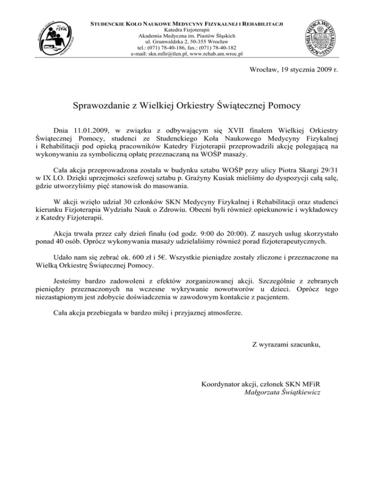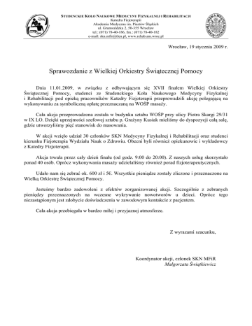 STUDENCKIE KOŁO NAUKOWE MEDYCYNY FIZYKALNEJ I REHABILITACJI Katedra Fizjoterapii Akademia Medyczna im. Piastów Śląskich ul. Grunwaldzka 2, 50-355 Wrocław tel.: (071) 78-40-186, fax.: (071) 78-40-182 e-mail: [email protected], www.rehab.am.wroc.pl Wrocław, 19 stycznia 2009 r. Sprawozdanie z Wielkiej Orkiestry Świątecznej Pomocy Dnia 11.01.2009, w związku z odbywającym się XVII finałem Wielkiej Orkiestry Świątecznej Pomocy, studenci ze Studenckiego Koła Naukowego Medycyny Fizykalnej i Rehabilitacji pod opieką pracowników Katedry Fizjoterapii przeprowadzili akcję polegającą na wykonywaniu za symboliczną opłatę przeznaczaną na WOŚP masaży. Cała akcja przeprowadzona została w budynku sztabu WOŚP przy ulicy Piotra Skargi 29/31 w IX LO. Dzięki uprzejmości szefowej sztabu p. Grażyny Kusiak mieliśmy do dyspozycji całą salę, gdzie utworzyliśmy pięć stanowisk do masowania. W akcji wzięło udział 30 członków SKN Medycyny Fizykalnej i Rehabilitacji oraz studenci kierunku Fizjoterapia Wydziału Nauk o Zdrowiu. Obecni byli również opiekunowie i wykładowcy z Katedry Fizjoterapii. Akcja trwała przez cały dzień finału (od godz. 9:00 do 20:00). Z naszych usług skorzystało ponad 40 osób. Oprócz wykonywania masaży udzielaliśmy również porad fizjoterapeutycznych. Udało nam się zebrać ok. 600 zł i 5€. Wszystkie pieniądze zostały zliczone i przeznaczone na Wielką Orkiestrę Świątecznej Pomocy. Jesteśmy bardzo zadowoleni z efektów zorganizowanej akcji. Szczególnie z zebranych pieniędzy przeznaczonych na wczesne wykrywanie nowotworów u dzieci. Oprócz tego niezastąpionym jest zdobycie doświadczenia w zawodowym kontakcie z pacjentem. Cała akcja przebiegała w bardzo miłej i przyjaznej atmosferze. Z wyrazami szacunku, Koordynator akcji, członek SKN MFiR Małgorzata Świątkiewicz STUDENCKIE KOŁO NAUKOWE MEDYCYNY FIZYKALNEJ I REHABILITACJI Katedra Fizjoterapii Akademia Medyczna im. Piastów Śląskich ul. Grunwaldzka 2, 50-355 Wrocław tel.: (071) 78-40-186, fax.: (071) 78-40-182 e-mail: [email protected], www.rehab.am.wroc.pl WOŚP 2009 Lista członków SKN MFiR i studentów kierunku Fizjoterapia biorących udział w akcji 1. Bogut Aleksandra 2. Ciurlik Karolina 3. Dutka Maciej 4. Gregorkiewicz Sonia 5. Gruzel Magda 6. Huminiak Paulina 7. Janiak Kuba 8. Janiszewski Paweł 9. Knuth Malwina 10. Kosowski Marcin 11. Kotecka Daria 12. Kraczko Wiktor 13. Kucia Marta 14. Kusibab Weronika 15. Kuźmińska Małgorzata 16. Kuźniar Kamila 17. Kwasek Marta 18. Litwinowa Inga 19. Małolepsza Anna 20. Mroczek Kornelia 21. Niemiec Urszula 22. Pietrusewicz Karolina 23. Roik Paulina 24. Sklarek Gosia 25. Szponer Magdalena 26. Suliga Magda 27. Świątkiewicz Małgorzata 28. Trościanko Ewelina 29. Warężak Paweł 30. Zembaty Michalina STUDENCKIE KOŁO NAUKOWE MEDYCYNY FIZYKALNEJ I REHABILITACJI Katedra Fizjoterapii Akademia Medyczna im. Piastów Śląskich ul. Grunwaldzka 2, 50-355 Wrocław tel.: (071) 78-40-186, fax.: (071) 78-40-182 e-mail: [email protected], www.rehab.am.wroc.pl WOŚP 2009 Lista pracowników Katedry Fizjoterapii biorących udział w akcji: 1. 2. 3. 4. 5. 6. 7. 8. mgr inż. Sławomir Jarząb mgr Michał Guła mgr Wojciech Tomasz Laber mgr Bożena Bogut mgr Roman Heider mgr Wojciech Laber mgr Ilias Dumas dr Żanna Fiodorenko-Dumas