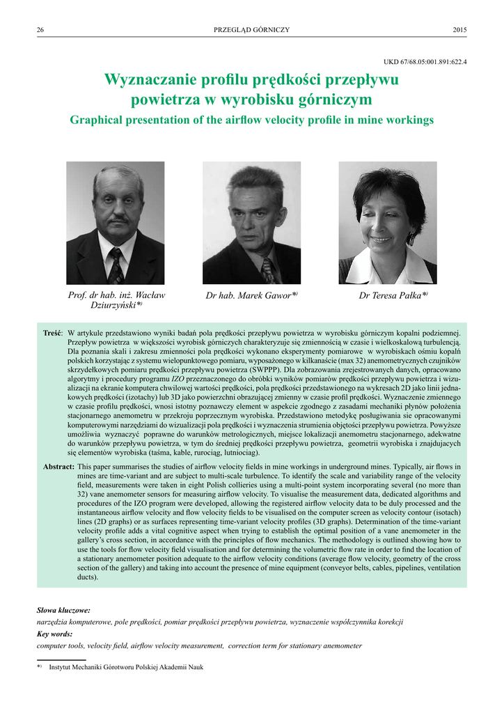 26 PRZEGLĄD GÓRNICZY 2015 UKD 67/68.05:001.891:622.4 Wyznaczanie profilu prędkości przepływu powietrza w wyrobisku górniczym Graphical presentation of the airflow velocity profile in mine workings Prof. dr hab. inż. Wacław Dziurzyński*) Dr hab. Marek Gawor*) Dr Teresa Pałka*) Treść: W artykule przedstawiono wyniki badań pola prędkości przepływu powietrza w wyrobisku górniczym kopalni podziemnej. Przepływ powietrza w większości wyrobisk górniczych charakteryzuje się zmiennością w czasie i wielkoskalową turbulencją. Dla poznania skali i zakresu zmienności pola prędkości wykonano eksperymenty pomiarowe w wyrobiskach ośmiu kopalń polskich korzystając z systemu wielopunktowego pomiaru, wyposażonego w kilkanaście (max 32) anemometrycznych czujników skrzydełkowych pomiaru prędkości przepływu powietrza (SWPPP). Dla zobrazowania zrejestrowanych danych, opracowano algorytmy i procedury programu IZO przeznaczonego do obróbki wyników pomiarów prędkości przepływu powietrza i wizualizacji na ekranie komputera chwilowej wartości prędkości, pola prędkości przedstawionego na wykresach 2D jako linii jednakowych prędkości (izotachy) lub 3D jako powierzchni obrazującej zmienny w czasie profil prędkości. Wyznaczenie zmiennego w czasie profilu prędkości, wnosi istotny poznawczy element w aspekcie zgodnego z zasadami mechaniki płynów położenia stacjonarnego anemometru w przekroju poprzecznym wyrobiska. Przedstawiono metodykę posługiwania sie opracowanymi komputerowymi narzędziami do wizualizacji pola prędkości i wyznaczenia strumienia objętości przepływu powietrza. Powyższe umożliwia wyznaczyć poprawne do warunków metrologicznych, miejsce lokalizacji anemometru stacjonarnego, adekwatne do warunków przepływu powietrza, w tym do średniej prędkości przepływu powietrza, geometrii wyrobiska i znajdujacych się elementów wyrobiska (taśma, kable, rurociąg, lutniociag). Abstract: This paper summarises the studies of airflow velocity fields in mine workings in underground mines. Typically, air flows in mines are time-variant and are subject to multi-scale turbulence. To identify the scale and variability range of the velocity field, measurements were taken in eight Polish collieries using a multi-point system incorporating several (no more than 32) vane anemometer sensors for measuring airflow velocity. To visualise the measurement data, dedicated algorithms and procedures of the IZO program were developed, allowing the registered airflow velocity data to be duly processed and the instantaneous airflow velocity and flow velocity fields to be visualised on the computer screen as velocity contour (isotach) lines (2D graphs) or as surfaces representing time-variant velocity profiles (3D graphs). Determination of the time-variant velocity profile adds a vital cognitive aspect when trying to establish the optimal position of a vane anemometer in the gallery’s cross section, in accordance with the principles of flow mechanics. The methodology is outlined showing how to use the tools for flow velocity field visualisation and for determining the volumetric flow rate in order to find the location of a stationary anemometer position adequate to the airflow velocity conditions (average flow velocity, geometry of the cross section of the gallery) and taking into account the presence of mine equipment (conveyor belts, cables, pipelines, ventilation ducts). Słowa kluczowe: narzędzia komputerowe, pole prędkości, pomiar prędkości przepływu powietrza, wyznaczenie współczynnika korekcji Key words: computer tools, velocity field, airflow velocity measurement, correction term for stationary anemometer *) Instytut Mechaniki Górotworu Polskiej Akademii Nauk Nr 7 PRZEGLĄD GÓRNICZY 27 1. Wprowadzenie 2. Założenia i opis funkcjonowania programu IZO Zagadnienie pomiaru parametrów charakteryzujących kopalnianą sieć wentylacyjną, w tym wyznaczenie strumienia objętości przepływu powietrza jest ciągle przedmiotem badań. Pojawiające się przyrządy pomiarowe nowej generacji umożliwiają przeprowadzenie badań eksperymentalnych i opracowanie nowych metod pomiarowych. Techniki pomiarowe stosowane w wentylacji kopalń dotyczyły na ogół tak zwanego stanu ustalonego przepływu powietrza w sieci wyrobisk [4, 5]. Jednak przepływ w większości wyrobisk górniczych charakteryzuje się zmiennością w czasie i wielkoskalową turbulencją [1, 2]). Badanie niestacjonarnego rozkładu prędkości przepływu powietrza w wyrobisku górniczym ma na celu: – poznanie, poprzez pomiar, niestacjonarnego przepływu powietrza w wyrobisku górniczym. – poznanie nowych możliwości pomiarowych z wykorzystaniem szybkich przetworników pomiarowych oraz szybkich profesjonalnych urządzeń rejestrujących a także zachowania sond pomiarowych (anemometrów, termoanemometrów) w silnie turbulentnym przepływie. W kopalniach podziemnych zastosowanie znajduje coraz więcej systemów automatycznego pomiaru w tym prędkości przepływu powietrza [9] oraz stężenia metanu [10]. Współczesne możliwości specjalistycznej aparatury do pomiaru i rejestracji pozwalają po raz pierwszy na zrealizowanie, równoczesnego pomiaru przez kilkanaście czujników prędkości przepływu powietrza w przekroju poprzecznym wyrobiska. Wyznaczanie strumienia objętości przepływu powietrza i gazów w wyrobiskach kopalnianych, tunelach i kanałach jest pomiarem złożonym. Strumień objętości przepływu jest określony iloczynem prędkości średniej i polem przekroju porzecznego, w którym prędkość wyznaczona jest poprzez pomiar w wyrobisku. Wyznaczenie pola predkości przepływu powietrza w wyrobisku górniczym umożliwia system wielopunktowego pomiaru prędkości przepływu powietrza (SWPPP – System Wielopunktowy Pomiaru Przepływu Powietrza), który wykorzystuje kilkanaście (max 32) anemometrycznych czujników skrzydełkowych [8]. Istotnym zagadnieniem prowadzonych badań z