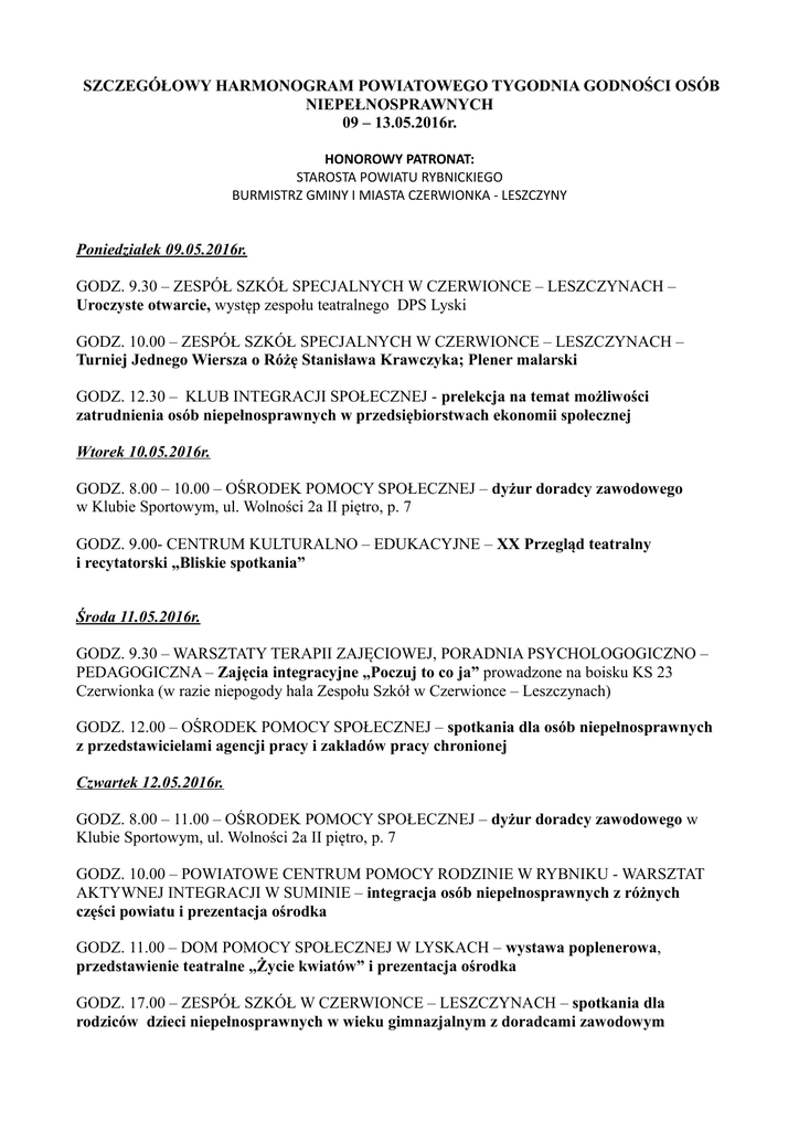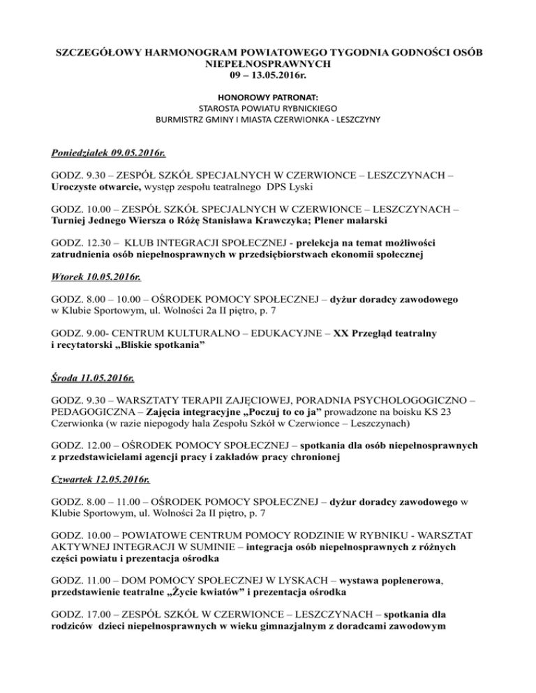 SZCZEGÓŁOWY HARMONOGRAM POWIATOWEGO TYGODNIA GODNOŚCI OSÓB NIEPEŁNOSPRAWNYCH 09 – 13.05.2016r. HONOROWY PATRONAT: STAROSTA POWIATU RYBNICKIEGO BURMISTRZ GMINY I MIASTA CZERWIONKA - LESZCZYNY Poniedziałek 09.05.2016r. GODZ. 9.30 – ZESPÓŁ SZKÓŁ SPECJALNYCH W CZERWIONCE – LESZCZYNACH – Uroczyste otwarcie, występ zespołu teatralnego DPS Lyski GODZ. 10.00 – ZESPÓŁ SZKÓŁ SPECJALNYCH W CZERWIONCE – LESZCZYNACH – Turniej Jednego Wiersza o Różę Stanisława Krawczyka; Plener malarski GODZ. 12.30 – KLUB INTEGRACJI SPOŁECZNEJ - prelekcja na temat możliwości zatrudnienia osób niepełnosprawnych w przedsiębiorstwach ekonomii społecznej Wtorek 10.05.2016r. GODZ. 8.00 – 10.00 – OŚRODEK POMOCY SPOŁECZNEJ – dyżur doradcy zawodowego w Klubie Sportowym, ul. Wolności 2a II piętro, p. 7 GODZ. 9.00- CENTRUM KULTURALNO – EDUKACYJNE – XX Przegląd teatralny i recytatorski „Bliskie spotkania” Środa 11.05.2016r. GODZ. 9.30 – WARSZTATY TERAPII ZAJĘCIOWEJ, PORADNIA PSYCHOLOGOGICZNO – PEDAGOGICZNA – Zajęcia integracyjne „Poczuj to co ja” prowadzone na boisku KS 23 Czerwionka (w razie niepogody hala Zespołu Szkół w Czerwionce – Leszczynach) GODZ. 12.00 – OŚRODEK POMOCY SPOŁECZNEJ – spotkania dla osób niepełnosprawnych z przedstawicielami agencji pracy i zakładów pracy chronionej Czwartek 12.05.2016r. GODZ. 8.00 – 11.00 – OŚRODEK POMOCY SPOŁECZNEJ – dyżur doradcy zawodowego w Klubie Sportowym, ul. Wolności 2a II piętro, p. 7 GODZ. 10.00 – POWIATOWE CENTRUM POMOCY RODZINIE W RYBNIKU - WARSZTAT AKTYWNEJ INTEGRACJI W SUMINIE – integracja osób niepełnosprawnych z różnych części powiatu i prezentacja ośrodka GODZ. 11.00 – DOM POMOCY SPOŁECZNEJ W LYSKACH – wystawa poplenerowa, przedstawienie teatralne „Życie kwiatów” i prezentacja ośrodka GODZ. 17.00 – ZESPÓŁ SZKÓŁ W CZERWIONCE – LESZCZYNACH – spotkania dla rodziców dzieci niepełnosprawnych w wieku gimnazjalnym z doradcami zawodowym Piątek 13.05.2016r. CENTRUM KULTURALNO – EDUKACYJNE – konferencja podsumowująca (konieczne wcześniejsze zapisy do dnia 29.04.2015r pod numerem telefonu 32 43 12 251 - liczba miejsc ograniczona) GODZ. 11.00- 11.30 – otwarcie konferencji i podsumowanie przeprowadzonych działań GODZ. 11.30 – 11.45 – prezentacja Społecznej Powiatowej Rady ds. Osób Niepełnosprawnych GODZ. 11.45 – 12.30 – wykład „Nie dać się depresji”, dr hab. n. med. Robert Pudlo, specjalista psychiatra, konsultant wojewódzki w dziedzinie psychiatrii GODZ. 12.30 – 12.45 – występ muzyczny GODZ. 12.45 – 13.45 –wykład „Funkcjonowanie osób z Zespołem Aspergera i autyzmem w szkole i środowisku społecznym” mgr Grzegorza Stano GODZ. 13.45 – 14.15 – poczęstunek GODZ. 14.15 – 17.00 – warsztaty z zakresu pracy z dziećmi z Zespołem Aspergera Konferencji towarzyszyć będzie spektakl teatralny pt. „Poznajmy się” w wykonaniu uczestników projektu „ŻYCIE MOJA SAMODZIELNA ROLA” realizowanego w ramach programu OBYWATELE DLA DEMOKRACJI finansowanego z funduszy EOG na który zaprasza Stowarzyszenie „Razem”,. WARSZTATY TERAPII ZAJECIOWEJ – warsztaty z doradcą zawodowym – 13.15 – 14.15 PATRONAT MEDIALNY: ORGANIZATORZY: Zespół Szkół Specjalnych im. W. Sherborne w Czerwionce – Leszczynach Zespół Szkół w Czerwionce – Leszczynach Poradnia Psychologiczno – Pedagogiczna w Czerwionce - Leszczynach Ośrodek Pomocy Społecznej w Czerwionce - Leszczynach Miejski Ośrodek Kultury w Czerwionce - Leszczynach Warsztaty Terapii Zajęciowej w Czerwionce - Leszczynach Powiatowe Centrum Pomocy Rodzinie Społeczna Powiatowa Rada ds. Osób Niepełnosprawnych Powiatowe Ognisko Pracy Pozaszkolnej Dom Pomocy Społecznej w Lyskach Stowarzyszenie „Jestem” Stowarzyszenie Pomocy „Feniks”