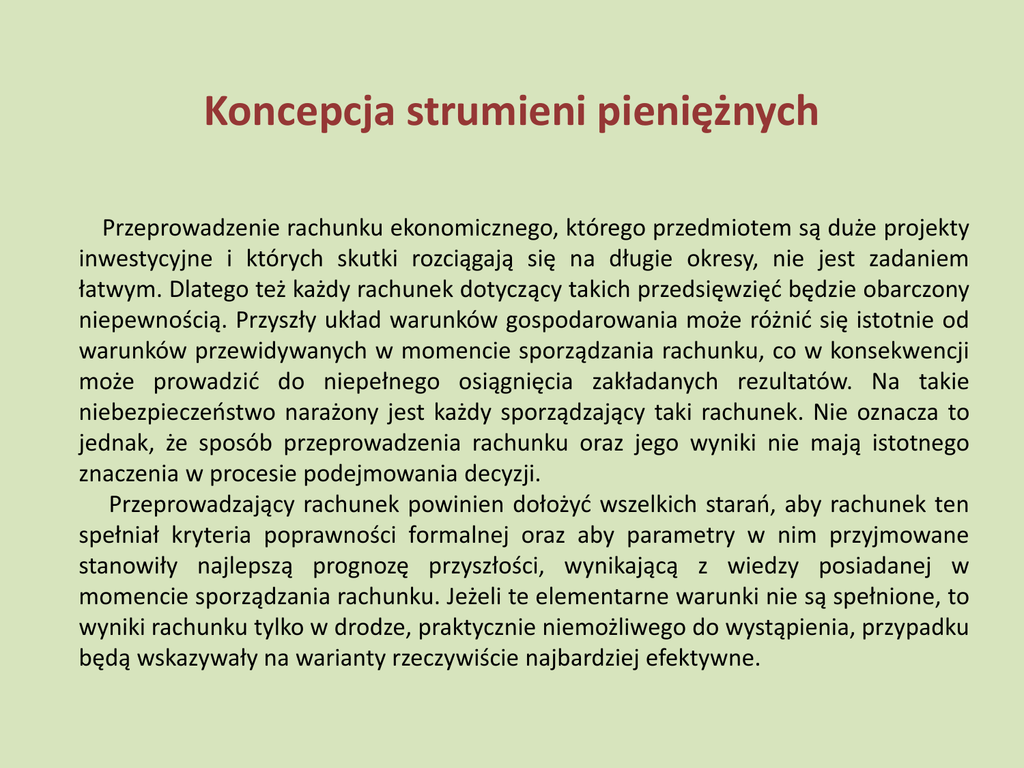Koncepcja strumieni pieniężnych Przeprowadzenie rachunku ekonomicznego, którego przedmiotem są duże projekty inwestycyjne i których skutki rozciągają się na długie okresy, nie jest zadaniem łatwym. Dlatego też każdy rachunek dotyczący takich przedsięwzięć będzie obarczony niepewnością. Przyszły układ warunków gospodarowania może różnić się istotnie od warunków przewidywanych w momencie sporządzania rachunku, co w konsekwencji może prowadzić do niepełnego osiągnięcia zakładanych rezultatów. Na takie niebezpieczeństwo narażony jest każdy sporządzający taki rachunek. Nie oznacza to jednak, że sposób przeprowadzenia rachunku oraz jego wyniki nie mają istotnego znaczenia w procesie podejmowania decyzji. Przeprowadzający rachunek powinien dołożyć wszelkich starań, aby rachunek ten spełniał kryteria poprawności formalnej oraz aby parametry w nim przyjmowane stanowiły najlepszą prognozę przyszłości, wynikającą z wiedzy posiadanej w momencie sporządzania rachunku. Jeżeli te elementarne warunki nie są spełnione, to wyniki rachunku tylko w drodze, praktycznie niemożliwego do wystąpienia, przypadku będą wskazywały na warianty rzeczywiście najbardziej efektywne. Celem omówienia metod oceny najpierw musimy zdefiniować pojęcie strumieni pieniężnych, które będą podstawą prowadzenia analizy i przedmiotem odpowiednich przekształceń. O wielkości tych wydatków i wpływów decydować będą właśnie wyznaczone przez analizującego wartości tzw. wolnych strumieni pieniężnych. Trzeba je wyznaczać osobno dla każdego okresu jakiego dotyczy inwestycja. Należy zaznaczyć, że długość okresów w jakich można dokonać analizy inwestycji zależy wyłącznie do analizującego. Najczęściej stosowanym jest okres roczny, ale większa szczegółowość jest zdecydowanie wskazana, zwłaszcza w przypadku działalności podatnej na dużą amplitudę wahań sezonowych, ale przede wszystkim dlatego, że pozwala lepiej zaobserwować elementy niewidoczne przy mniejszej szczegółowości analizy. Z tego właśnie względu, ale przy jednoczesnym uniknięciu zbędnej drobiazgowości w przypadku analizy miesięcznej, najbardziej optymalnym okresem analizy jest kwartał (za każdym razem trzeba oczywiście znaleźć złoty środek pomiędzy ilością pracy, którą chcemy i możemy poświęcić a potrzebami analizy). Aby jednak uzyskać lepszą przejrzystość i ułatwić obliczenia to stosować można podział na okresy roczne. Dla potrzeb oceny kolejne okresy powinny zostać kolejno ponumerowane (okres poniesienia pierwszych nakładów przyjmuje numer 0), np.: okres t0 t1 t2 t3 t4 okres 0 1 2 3 4 Strumień pieniężny (dla którego stosuje się często skrót CF, z ang. cash flow) z punktu widzenia wszystkich stron finansujących inwestycję w każdym kolejnym okresie może, z punktu widzenia ekonomii, przyjmować następującą postać: FCFF (z ang. free cash flows to firm, czyli wolne przepływy pieniężne dla właścicieli i wierzycieli) = Wynik netto to + Amortyzacja + Odsetki i inne koszty dotyczące kapitału obcego (np. prowizja za udzielenie kredytu inwestycyjnego) +/- Zmiana kapitału obrotowego netto - Nakład inwestycyjny finansowany kapitałem własnym - Nakład inwestycyjny finansowany kapitałem obcym + Wartość likwidacyjna (rezydualna) majątku. Najczęściej jednak równanie takie może być upraszczane do postaci: 𝑁𝐶𝐹 = 𝐶𝐹0 𝐶𝐹1 𝐶𝐹2 𝐶𝐹𝑛−1 𝐶𝐹𝑛 + + + ⋯ + + (1 + 𝑖)0 (1 + 𝑖)1 (1 + 𝑖)2 (1 + 𝑖)𝑛−1 (1 + 𝑖)𝑛 (1) lub ogólnie 𝑛 𝑁𝐶𝐹 = 𝑊𝑂𝑅 = 𝑗=0 𝐶𝐹𝑗 (1 + 𝑖)𝑗 (2) Przykład: Firma budowlana (np. deweloper) inwestuje 900 000 zł w budowę kilku domów jednorodzinnych. Spodziewa się uzyskać wpływy ze sprzedaży w 1, 2, 3 i 4 roku w wysokości 400 000 zł, 400 000 zł, 350 000 zł i 300 000 zł. Czy przedsięwzięcie takie jest opłacalne przy założeniu, że środki środki na inwestycję mogą przynieść w konkurencyjnym projekcie dochód w wysokości 4% rocznie? Przykład: Firma budowlana (np. deweloper) inwestuje w zakup działki budowlanej na której po roku zamierza wybudować mały blok wielorodzinny 1 000 000 zł. Spodziewa się uzyskać wpływy ze sprzedaży mieszkań w 1, 2, 3 i 4 roku w wysokości 500 000 zł, 400 000 zł, 300 000 zł i 300 000 zł, które następnie pragnie przeznaczyć na budowę następnego bloku na tej samej działce. W 1, 2 i 3 roku po rozpoczęciu drugiej inwestycji przewiduje sprzedać mieszkania za 450 000 tysięcy złotych. Czy budowa dwóch domów jest opłacalną przy założeniu, że środki na inwestycję w czasie budowy i sprzedaży mogą być ulokowane w konkurencyjnym projekcie i przynieść dochód w wysokości 4% rocznie, natomiast po czterech latach inny projekt będzie miał rentowność na poziomie 3% rocznie? 𝑛 𝐶𝐹 (1 + 𝑖)𝑛−𝑗 𝐹𝐶𝐹 = 𝑊𝑃𝑅 = 𝑗=0 (3) Strumienie równych płatności (Annuities) 𝑛 𝐹 = 𝐴1 1 + 𝑖 𝑛−1 + 𝐴2 1 + 𝑖 𝑛−2 𝐴𝑘 (1 + 𝑖)𝑘 + ⋯ + 𝐴𝑛 = (4) 𝑘=1 𝑃= 𝐴1 𝐴2 𝐴𝑛−1 𝐴𝑛 + + ⋯ + + = 1 2 𝑛−1 𝑛 (1 + 𝑖) (1 + 𝑖) (1 + 𝑖) (1 + 𝑖) 𝑛 𝑘=1 𝐴𝑘 (1 + 𝑖)𝑘 (5) Mnożąc obie strony równania (4) przez (1+i) otrzymujemy: 𝐹 1+𝑖 = 𝐴 1+𝑖 𝑛 +𝐴 1+𝑖 𝑛−1 + ⋯+ 𝐴 1 + 𝑖 3 +𝐴 1+𝑖 2 + 𝐴(1 + 𝑖) (6) Odejmując od (6) równanie (4) otrzymamy: 𝐹 1+𝑖 −𝐹 = 𝐴 1+𝑖 𝑛 −𝐴 (7) Stąd po przekształceniach otrzymamy: (1 + 𝑖)𝑛 −1 𝐹 =𝐴∙ =𝐴∙𝑠 𝑖 (8) gdzie s jest czynnikiem kapitalizującym równym: (1 + 𝑖)𝑛 −1 𝑠= 𝑖 (9) Oczywiście wartość jednakowych płatności rocznych A ponoszonych na koniec całego roku (okresu) , w ciągu n lat i procentowanych czynnikiem i oraz dających po n latch wartość F można zapisać jako: 𝐴=𝐹 𝑖 1 = 𝐹 ∙ (1 + 