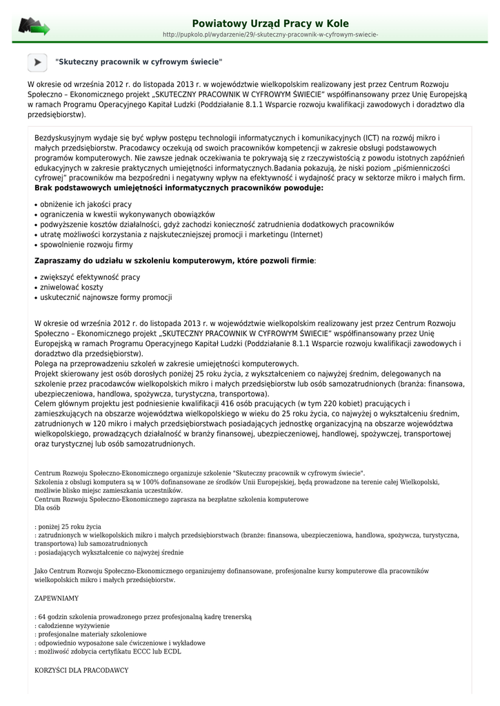 Powiatowy Urząd Pracy w Kole http://pupkolo.pl/wydarzenie/29/-skuteczny-pracownik-w-cyfrowym-swiecie- "Skuteczny pracownik w cyfrowym świecie" W okresie od września 2012 r. do listopada 2013 r. w województwie wielkopolskim realizowany jest przez Centrum Rozwoju Społeczno – Ekonomicznego projekt „SKUTECZNY PRACOWNIK W CYFROWYM ŚWIECIE” współfinansowany przez Unię Europejską w ramach Programu Operacyjnego Kapitał Ludzki (Poddziałanie 8.1.1 Wsparcie rozwoju kwalifikacji zawodowych i doradztwo dla przedsiębiorstw). Bezdyskusyjnym wydaje się być wpływ postępu technologii informatycznych i komunikacyjnych (ICT) na rozwój mikro i małych przedsiębiorstw. Pracodawcy oczekują od swoich pracowników kompetencji w zakresie obsługi podstawowych programów komputerowych. Nie zawsze jednak oczekiwania te pokrywają się z rzeczywistością z powodu istotnych zapóźnień edukacyjnych w zakresie praktycznych umiejętności informatycznych.Badania pokazują, że niski poziom „piśmienniczości cyfrowej” pracowników ma bezpośredni i negatywny wpływ na efektywność i wydajność pracy w sektorze mikro i małych firm. Brak podstawowych umiejętności informatycznych pracowników powoduje: ● ● ● ● ● obniżenie ich jakości pracy ograniczenia w kwestii wykonywanych obowiązków podwyższenie kosztów działalności, gdyż zachodzi konieczność zatrudnienia dodatkowych pracowników utratę możliwości korzystania z najskuteczniejszej promocji i marketingu (Internet) spowolnienie rozwoju firmy Zapraszamy do udziału w szkoleniu komputerowym, które pozwoli firmie: ● ● ● zwiększyć efektywność pracy zniwelować koszty uskutecznić najnowsze formy promocji W okresie od września 2012 r. do listopada 2013 r. w województwie wielkopolskim realizowany jest przez Centrum Rozwoju Społeczno – Ekonomicznego projekt „SKUTECZNY PRACOWNIK W CYFROWYM ŚWIECIE” współfinansowany przez Unię Europejską w ramach Programu Operacyjnego Kapitał Ludzki (Poddziałanie 8.1.1 Wsparcie rozwoju kwalifikacji zawodowych i doradztwo dla przedsiębiorstw). Polega na przeprowadzeniu szkoleń w zakresie umiejętności komputerowych. Projekt skierowany jest osób dorosłych poniżej 25 roku życia, z wykształceniem co najwyżej średnim, delegowanych na szkolenie przez pracodawców wielkopolskich mikro i małych przedsiębiorstw lub osób samozatrudnionych (branża: finansowa, ubezpieczeniowa, handlowa, spożywcza, turystyczna, transportowa). Celem głównym projektu jest podniesienie kwalifikacji 416 osób pracujących (w tym 220 kobiet) pracujących i zamieszkujących na obszarze województwa wielkopolskiego w wieku do 25 roku życia, co najwyżej o wykształceniu średnim, zatrudnionych w 120 mikro i małych przedsiębiorstwach posiadających jednostkę organizacyjną na obszarze województwa wielkopolskiego, prowadzących działalność w branży finansowej, ubezpieczeniowej, handlowej, spożywczej, transportowej oraz turystycznej lub osób samozatrudnionych. Centrum Rozwoju Społeczno-Ekonomicznego organizuje szkolenie "Skuteczny pracownik w cyfrowym świecie". Szkolenia z obslugi komputera są w 100% dofinansowane ze środków Unii Europejskiej, będą prowadzone na terenie całej Wielkopolski, możliwie blisko miejsc zamieszkania uczestników. Centrum Rozwoju Społeczno-Ekonomicznego zaprasza na bezpłatne szkolenia komputerowe Dla osób : poniżej 25 roku życia : zatrudnionych w wielkopolskich mikro i małych przedsiębiorstwach (branże: finansowa, ubezpieczeniowa, handlowa, spożywcza, turystyczna, transportowa) lub samozatrudnionych : posiadających wykształcenie co najwyżej średnie Jako Centrum Rozwoju Społeczno-Ekonomicznego organizujemy dofinansowane, profesjonalne kursy komputerowe dla pracowników wielkopolskich mikro i małych przedsiębiorstw. ZAPEWNIAMY : 64 godzin szkolenia prowadzonego przez profesjonalną kadrę trenerską : całodzienne wyżywienie : profesjonalne materiały szkoleniowe : odpowiednio wyposażone sale ćwiczeniowe i wykładowe : możliwość zdobycia certyfikatu ECCC lub ECDL KORZYŚCI DLA PRACODAWCY : zdobycie przez pracowników poświadczonych kwalifikacji w wykorzystaniu narzędzi informatycznych poświadczonych certyfikatem : pełne wykorzystanie potencjału pracowników w zakresie praktycznych umiejętności obsługi komputera : wzrost efektywności pracy oraz zaangażowania pracowników SZKOLENIE JEST W 100 % DOFINANSOWANE ZE ŚRODKÓW UNII EUROPEJSKIEJ PROGRAM SZKOLENIA 1. Podstawy technik informatycznych 2. Użytkowanie komputerów 3. MS Word – przetwarzanie tekstów 4. MS Excel – arkusze kalkulacyjne 5. MS Access – bazy danych 6. Grafika menedżerska i prezentacja 7. Prezentacja oraz usługi w sieciach informatycznych MIEJSCE SZKOLENIA Szkolenia odbywają się na terenie Wielkopolski w zależności od zapotrzebowania, po uzbieraniu się grupy około 16 osób. Staramy się organizować kursy możliwie blisko miejsca zamieszkania lub pracy uczestników w dniach i godzinach zgodnie z preferencjami zebranej grupy. Jeśli spełniasz wszystkie kryteria, nie czekaj! ZAPISZ SIĘ NA SZKOLENIE!!! ZDOBĄDŹ EUROPEJSKIE KOMPUTEROWE PRAWO JAZDY SZCZEGÓŁOWE INFORMACJE Biuro Projektu w Poznaniu: (czynne poniedziałek - piątek w godz. 8.00 - 16.00) ul. Sienkiewicza 22, pok. 603 60-818 Poznań tel. 61 662 84 22 kom. 604 724 468 [email protected] www.skutecznypracownik.org.pl
