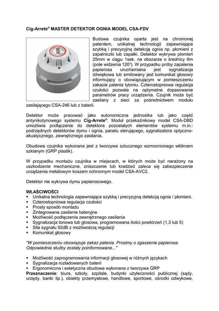 Cig-Arrete® MASTER DETEKTOR OGNIA MODEL CSA-FDV Budowa czujnika oparta jest na chronionej patentem, unikalnej technologii zapewniające szybką i precyzyjną detekcję ognia np. płomieni z zapalniczki lub zapałki. Detektor wykrywa płomień 25mm w ciągu 1sek. na obszarze o średnicy 6m (pole widzenia 120o). W przypadku próby zapalenia papierosa uruchamiana jest sygnalizacja dźwiękowa lub emitowany jest komunikat głosowy informujący o obowiązującym w pomieszczeniu zakazie palenia tytoniu. Czterostopniowa regulacja czułości pozwala na optymalne dopasowanie parametrów pracy urządzenia. Czujnik może być zasilany z sieci za pośrednictwem modułu zasilającego CSA-246 lub z baterii. Detektor może pracować jako autonomiczna jednostka lub jako część antynikotynowego systemu Cig-Arrete®. Moduł przekaźnikowy model CSA-DBD umożliwia podłączenie do detektora pozostałych elementów systemu m.in.: podrzędnych detektorów dymu i ognia, panelu sterującego, sygnalizatora optycznoakustycznego, zewnętrznego zasilania. Obudowa czujnika wykonana jest z tworzywa sztucznego wzmocnionego włóknem szklanym (GRP plastik). W przypadku montażu czujnika w miejscach, w których może być narażony na uszkodzenie mechaniczne, zniszczenie lub kradzież zaleca się zabezpieczenie urządzenia metalowym koszem ochronnym model CSA-AVC2. Detektor nie wykrywa dymu papierosowego. WŁAŚCIWOŚCI Unikalna technologia zapewniająca szybką i precyzyjną detekcją ognia / płomieni. Czterostopniowa regulacja czułości Prosty sposób montażu Zintegrowane zasilanie bateryjne Możliwość podłączenia zewnętrznego zasilania Sygnalizacja tonowa lub głosowa, programowana ilości powtórzeń (1,3 lub 5) Siła sygnału 92dB z możliwością regulacji Komunikat głosowy "W pomieszczeniu obowiązuje zakaz palenia. Prosimy o zgaszenie papierosa. Odpowiednie służby zostały poinformowane..." Możliwość zaprogramowania informacji głosowej w różnych językach Sygnalizacja rozładowanych baterii Ergonomiczna i estetyczna obudowa wykonana z tworzywa GRP Przeznaczenie: biura, szkoły, szpitale, budynki użyteczności publicznej (sądy, urzędy, banki itp.), obiekty przemysłowe, handlowe, sportowe, ośrodki odwykowe, restauracje, pomieszczenia, w których przygotowywane są posiłki, puby, kasyna, kluby nocne, porty lotnicze i morskie, terminale transportowe oraz wszystkie inne pomieszczenia, w których obowiązuje zakaz palenia. PARAMETRY TECHNICZNE Zasilanie 1x9V DC, bateria alkaliczna typ 6LR61 / 6F22 lub 4x1.5V baterie alkaliczne typ AA lub za pośrednictwem modułu zasilającego CSA-246 Napięcie zasilania 4 – 12 V DC Pobór prądu 100μA w stanie czuwania, 600mA w stanie alarmu dla 6V DC Temperatura pracy -10°C do 50°C Wilgotność 0-95% bez kondensacji Sposób montażu sufit / ściana (śruby montażowe w zestawie) Progi czułości b. wysoki, wysoki, średni lub niski Alarm Akustyczny 92dB z możliwością regulacji lub komunikat głosowy: "W pomieszczeniu obowiązuje zakaz palenia. Prosimy o zgaszenie papierosa. Odpowiednie służby zostały poinformowane..." Sygnalizacja Niskiego poziomu zasilania (rozładowania baterii): krótki, wysoki sygnał dźwiękowy co 150sek. Zdjęcia głowicy czujnika: krótki, niski sygnał dźwiękowy co 150sek. Wymiary Średnica - 112 mm, wysokość - 85 mm Waga 245g bez baterii Obudowa plastik GRP, tworzywo sztuczne wzmocnione włóknem szklanym kolor biały Kompatybilność Znak CE elektromagnetyczna Żadna część powyższego opracowania, zarówno w całości jak i we fragmentach, nie może być kopiowana, modyfikowana, ani przetwarzana w jakikolwiek sposób elektroniczny, fotograficzny, mechaniczny oraz inny, bez pisemnej zgody firmy AISKO. Firma AISKO zastrzega sobie prawo zmiany podanych parametrów urządzenia bez wcześniejszego uprzedzenia.