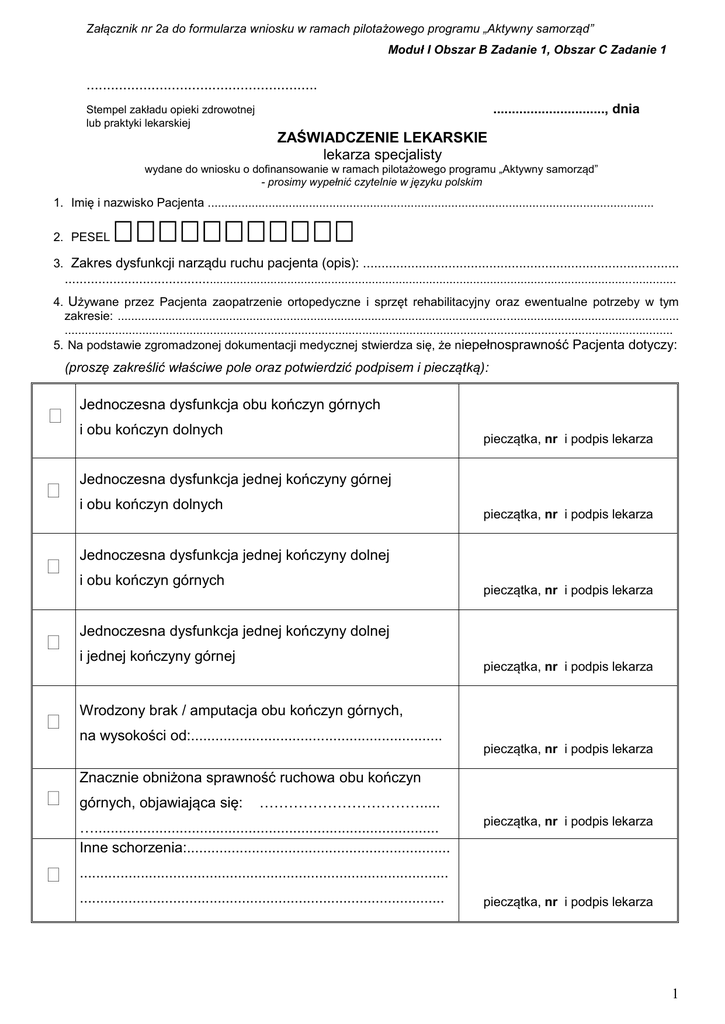 Załącznik nr 2a do formularza wniosku w ramach pilotażowego programu „Aktywny samorząd” Moduł I Obszar B Zadanie 1, Obszar C Zadanie 1 ......................................................... Stempel zakładu opieki zdrowotnej lub praktyki lekarskiej .............................., dnia ZAŚWIADCZENIE LEKARSKIE lekarza specjalisty wydane do wniosku o dofinansowanie w ramach pilotażowego programu „Aktywny samorząd” - prosimy wypełnić czytelnie w języku polskim 1. Imię i nazwisko Pacjenta .................................................................................................................................... 2. PESEL 3. Zakres dysfunkcji narządu ruchu pacjenta (opis): ..................................................................................... ................................................................................................................................................................................. 4. Używane przez Pacjenta zaopatrzenie ortopedyczne i sprzęt rehabilitacyjny oraz ewentualne potrzeby w tym zakresie: ...................................................................................................................................................................... .................................................................................................................................................................................... 5. Na podstawie zgromadzonej dokumentacji medycznej stwierdza się, że niepełnosprawność Pacjenta dotyczy: (proszę zakreślić właściwe pole oraz potwierdzić podpisem i pieczątką): Jednoczesna dysfunkcja obu kończyn górnych i obu kończyn dolnych pieczątka, nr i podpis lekarza Jednoczesna dysfunkcja jednej kończyny górnej i obu kończyn dolnych pieczątka, nr i podpis lekarza Jednoczesna dysfunkcja jednej kończyny dolnej i obu kończyn górnych pieczątka, nr i podpis lekarza Jednoczesna dysfunkcja jednej kończyny dolnej i jednej kończyny górnej pieczątka, nr i podpis lekarza Wrodzony brak / amputacja obu kończyn górnych, na wysokości od:.............................................................. Znacznie obniżona sprawność ruchowa obu kończyn górnych, objawiająca się: ……………………………..... …..................................................................................... Inne schorzenia:................................................................. pieczątka, nr i podpis lekarza pieczątka, nr i podpis lekarza ........................................................................................... .......................................................................................... pieczątka, nr i podpis lekarza 1 Załącznik nr 2a do formularza wniosku w ramach pilotażowego programu „Aktywny samorząd” Moduł I Obszar B Zadanie 1, Obszar C Zadanie 1 6. Ponadto (pole obowiązkowe w przypadku Pacjenta ubiegającego się o dofinansowanie w ramach obszaru C programu) - na podstawie zgromadzonej dokumentacji medycznej stwierdza się, że: proszę zakreślić właściwe pola 1. Pacjent może poruszać się samodzielnie przy pomocy wózka inwalidzkiego o napędzie ręcznym: tak nie 2. Korzystanie z wózka o napędzie elektrycznym jest wskazane z punktu widzenia procesu rehabilitacji (nie spowoduje wstrzymania lub pogorszenia tego procesu): tak nie 3. Korzystanie z wózka o napędzie elektrycznym wpłynie niekorzystnie na sprawność kończyn: tak nie 4. Przeciwwskazania do korzystania z wózka o napędzie elektrycznym (np. utraty przytomności, epilepsja): .................................................................. ............................................................................................................................ ............................................ ............................... brak przeciwwskazań pieczątka, nr i podpis lekarza Dotyczy wyłącznie Wnioskodawców ubiegających się o zwiększenie kwoty dofinansowania na zakup wózka inwalidzkiego o napędzie elektrycznym Pacjent z uwagi na indywidualne potrzeby zdrowotne, ograniczenia funkcjonalne, stan i zakres dysfunkcji narządu ruchu powodującej niepełnosprawność wymaga zakupu wózka inwalidzkiego o napędzie elektrycznym z ponadstandardowym wyposażeniem, w tym: (proszę zakreślić właściwe pola ) niestandardowe sterowniki umożliwiające sterowanie wózkiem za pomocą jedynie władnych części ciała jak np.: ręki, palca, brody, stopy, warg lub wdechu i wydechu powietrza itp. urządzenia umożliwiające prowadzenie wózka także przez osobę towarzyszącą (hamulec, sterownik itp.) niestandardowe siedzisko (np. z windą podnoszącą, rehabilitacyjne, zapewniające maksymalną stabilizację, przeciwodleżynowe, itp.) specjalne, regulowane (w tym elektrycznie i w różnych płaszczyznach): podnóżki, podłokietniki lub oparcia nadgarstków kliny zapobiegające zsuwaniu się Pacjenta z wózka lub podpórki boczne, peloty piersiowe zagłówek stabilizujący głowę i szyję (w kształcie litery U) specjalne pasy bezpieczeństwa (np. dwupunktowe zapinane na biodrach, czteropunktowe) taki sposób, aby wózek był indywidualnie dopasowany do sylwetki Pacjenta (np. w przypadku niestandardowego wzrostu czy wagi Pacjenta) inne elementy i urządzenia (np. umożliwiające podłączenia joysticka wózka do komputera i posługiwanie się nim jak myszką), jakie: ........................................, dnia .............. (miejscowość ) ............................................... pieczątka, nr i podpis lekarza 2