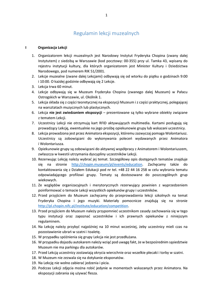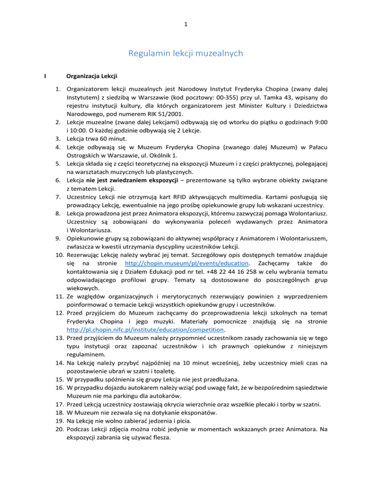 Regulamin lekcji muzealnych - Narodowy Instytut Fryderyka Chopina