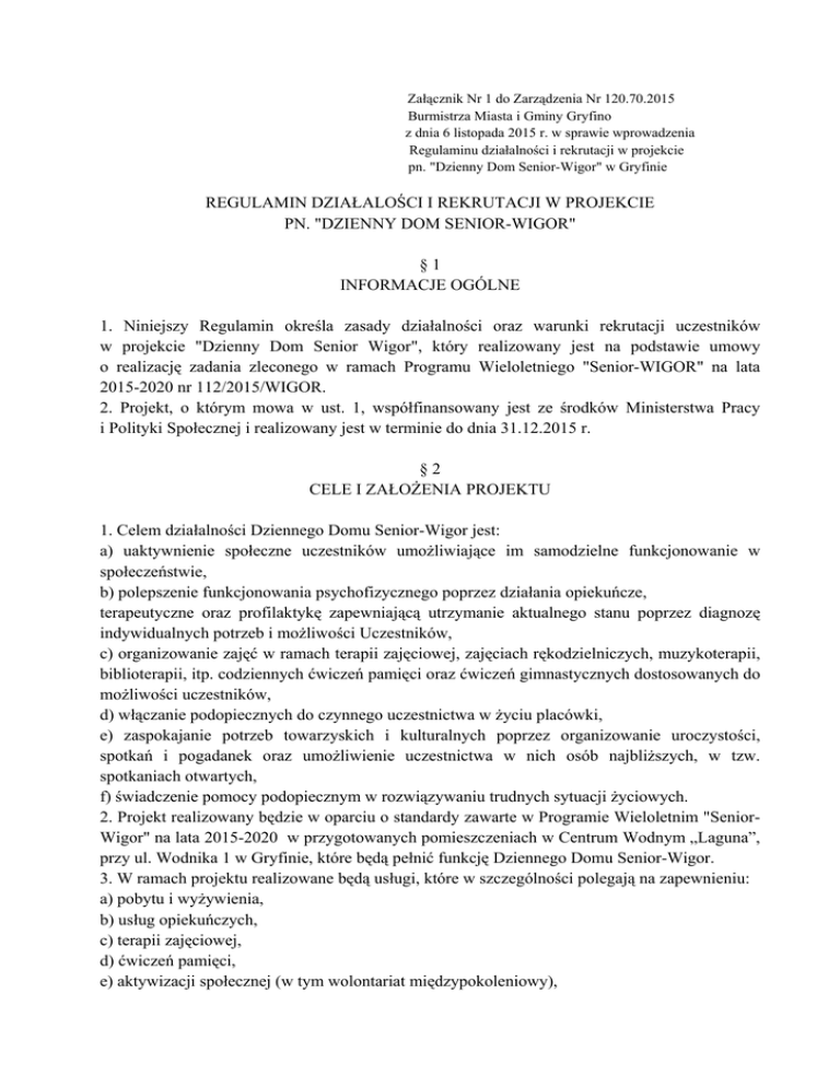 Załącznik Nr 1 do Zarządzenia Nr 120.70.2015 Burmistrza Miasta i Gminy Gryfino z dnia 6 listopada 2015 r. w sprawie wprowadzenia Regulaminu działalności i rekrutacji w projekcie pn. "Dzienny Dom Senior-Wigor" w Gryfinie REGULAMIN DZIAŁALOŚCI I REKRUTACJI W PROJEKCIE PN. "DZIENNY DOM SENIOR-WIGOR" §1 INFORMACJE OGÓLNE 1. Niniejszy Regulamin określa zasady działalności oraz warunki rekrutacji uczestników w projekcie "Dzienny Dom Senior Wigor", który realizowany jest na podstawie umowy o realizację zadania zleconego w ramach Programu Wieloletniego "Senior-WIGOR" na lata 2015-2020 nr 112/2015/WIGOR. 2. Projekt, o którym mowa w ust. 1, współfinansowany jest ze środków Ministerstwa Pracy i Polityki Społecznej i realizowany jest w terminie do dnia 31.12.2015 r. §2 CELE I ZAŁOŻENIA PROJEKTU 1. Celem działalności Dziennego Domu Senior-Wigor jest: a) uaktywnienie społeczne uczestników umożliwiające im samodzielne funkcjonowanie w społeczeństwie, b) polepszenie funkcjonowania psychofizycznego poprzez działania opiekuńcze, terapeutyczne oraz profilaktykę zapewniającą utrzymanie aktualnego stanu poprzez diagnozę indywidualnych potrzeb i możliwości Uczestników, c) organizowanie zajęć w ramach terapii zajęciowej, zajęciach rękodzielniczych, muzykoterapii, biblioterapii, itp. codziennych ćwiczeń pamięci oraz ćwiczeń gimnastycznych dostosowanych do możliwości uczestników, d) włączanie podopiecznych do czynnego uczestnictwa w życiu placówki, e) zaspokajanie potrzeb towarzyskich i kulturalnych poprzez organizowanie uroczystości, spotkań i pogadanek oraz umożliwienie uczestnictwa w nich osób najbliższych, w tzw. spotkaniach otwartych, f) świadczenie pomocy podopiecznym w rozwiązywaniu trudnych sytuacji życiowych. 2. Projekt realizowany będzie w oparciu o standardy zawarte w Programie Wieloletnim "SeniorWigor" na lata 2015-2020 w przygotowanych pomieszczeniach w Centrum Wodnym „Laguna”, przy ul. Wodnika 1 w Gryfinie, które będą pełnić funkcję Dziennego Domu Senior-Wigor. 3. W ramach projektu realizowane będą usługi, które w szczególności polegają na zapewnieniu: a) pobytu i wyżywienia, b) usług opiekuńczych, c) terapii zajęciowej, d) ćwiczeń pamięci, e) aktywizacji społecznej (w tym wolontariat międzypokoleniowy), f) form terapii ruchowej, g) zorganizowaniu czasu wolnego w bezpieczny i godny sposób. 4. Dzienny Dom będzie współpracował z innymi instytucjami i organizacjami w celu rozszerzenia oferty na usługi świadczone poza siedzibą. 5. Pobyt w Dziennym Domu Senior-Wigor jest bezpłatny w okresie trwania projektu, tj. do dnia 31.12.2015 r. §3 REKRUTACJA UCZESTNIKÓW PROJEKTU 1. Uczestnikami projektu będzie 15 osób z terenu gminy Gryfino w wieku 60+ nieaktywnych zawodowo. Kryterium kwalifikacyjnym będzie głównie: wiek, stan zdrowia, stopień sprawności psychofizycznej oraz sytuacja rodzinna. W przypadku zgłoszenia się większej liczby Uczestników spełniających wszystkie kryteria niż wolnych miejsc, o przyjęciu zadecyduje losowanie. 2. Przyjęcie do Dziennego Domu odbywa się na podstawie złożonego wniosku, który dostępny jest w Urzędzie Miasta i Gminy w Gryfinie, Ośrodku Pomocy Społecznej w Gryfinie bądź na stronach internetowych www.gryfino.pl lub www.ops.gryfino.pl. Termin do którego należy składać wnioski zostanie podany w ogłoszeniach. 3. Wnioski należy składać w Ośrodku Pomocy Społecznej, przy ul. Łużyckiej 12 w Gryfinie. 4. Decyzję o wyborze uczestników Projektu podejmuje Zespół rekrutacyjny. 5. Osoby, które spełnią wymogi, ale nie zostaną zakwalifikowane do uczestnictwa w projekcie z powodu braku miejsc, zostaną umieszczone na liście rezerwowej. Osoby te będą kwalifikowane w przypadku rezygnacji osób z listy podstawowej. §4 SPRAWY ORGANIZACYJNE 1. Dziennym Domem kieruje Kierownik. 2. Dzienny Dom czynny jest w dni robocze od poniedziałku do piątku w godzinach 7.30 - 15.30. (poza dnami ustawowo wolnymi). 3. W ramach pobytu uczestnikowi zapewnione są dwa posiłki: II śniadanie oraz obiad (jedno gorące danie). 4. Na teren Dziennego Domu nie będą wpuszczane osoby nietrzeźwe bądź będące pod wpływem środków odurzających. 5. Na terenie Dziennego Domu zabronione jest spożywanie alkoholu i innych środków odurzających. §5 DOKUMENTACJA W placówce gromadzona jest dokumentacja dotycząca Uczestników: a) oświadczenie o zapoznaniu się Uczestnika/opiekuna ustawowego z niniejszym Regulaminem, b) oświadczenie Uczestnika/opiekuna ustawowego o wyrażeniu zgody na przetwarzanie danych osobowych oraz udostępnianiu wizerunku, c) dokumentacja służąca monitorowaniu jego stanu psychofizycznego, d) ankieta poznawcza wypełniona przez Uczestnika/opiekuna ustawowego ogólnego stanu zdrowia oraz zleceń i przeciwwskazań lekarskich. dotycząca jego §6 PRAWA I OBOWIĄZKI UCZESTNIKA PROJEKTU 1. Uczestnik zobowiązany jest do: a) punktualnego i aktywnego uczestnictwa w zajęciach, b) potwierdzania uczestnictwa w zajęciach każdorazowo na liście obecności, c) wypełnianie ankiet ewaluacyjnych itp. 2. Każdy Uczestnik ma prawo do: a) udziału w projekcie, zgodnie z postanowieniami niniejszego Regulaminu, b) zgłaszania uwag dotyczących realizacji projektu bezpośrednio Kierownikowi Domu, c) oceny organizacji zajęć oraz jakości merytorycznej i organizacyjnej oferowanego wsparcia, d) otrzymania materiałów i narzędzi i innych pomocy niezbędnych do prawidłowej realizacji zajęć i warsztatów, e) zapewnienia ciepłego posiłku w trakcie zajęć. 3. Uczestnik ma obowiązek do informowania pracowników projektu o jakiejkolwiek zmianie, w tym danych osobowych. 4. Dzienny Dom zastrzega sobie możliwość do wykorzystania wizerunku i nagrania uczestnika do celów informacyjnych i promocyjnych, pod warunkiem, że fotografia lub nagranie zostało wykonane podczas zajęć w ramach projektu. 5. W przypadku rezygnacji z zajęć projektu, Uczestnik zobowiązany j