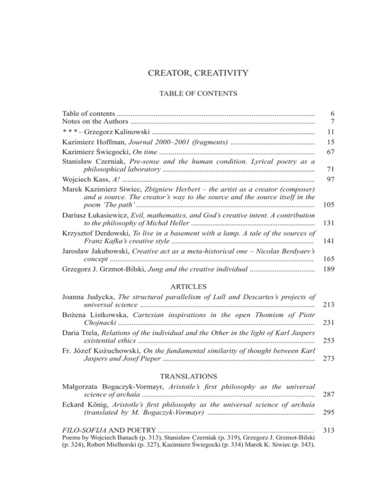 CREATOR, CREATIVITY TABLE OF CONTENTS Table of contents ....................................................................................................... Notes on the Authors ................................................................................................ 6 7 * * * – Grzegorz Kalinowski ..................................................................................... Kazimierz Hoffman, Journal 2000–2001 (fragments) ............................................ Kazimierz Świegocki, On time ................................................................................. Stanisław Czerniak, Pre-sense and the human condition. Lyrical poetry as a philosophical laboratory ...................................................................................... Wojciech Kass, A! ............................................................................................................. Marek Kazimierz Siwiec, Zbigniew Herbert – the artist as a creator (composer) and a source. The creator’s way to the source and the source itself in the poem ‘The path’ ............................................................................................. Dariusz Łukasiewicz, Evil, mathematics, and God’s creative intent. A contribution to the philosophy of Michał Heller ...................................................................... Krzysztof Derdowski, To live in a basement with a lamp. A tale of the sources of Franz Kafka’s creative style .......................................................................... Jarosław Jakubowski, Creative act as a meta-historical one – Nicolas Berdyaev’s concept .......................................................................................................... Grzegorz J. Grzmot-Bilski, Jung and the creative individual .................................. 11 15 67 ARTICLES Joanna Judycka, The structural parallelism of Lull and Descartes’s projects of universal science ........................................................................................... Bożena Listkowska, Cartesian inspirations in the open Thomism of Piotr Chojnacki ...................................................................................................... Daria Trela, Relations of the individual and the Other in the light of Karl Jaspers existential ethics ............................................................................................ Fr. Józef Kożuchowski, On the fundamental similarity of thought between Karl Jaspers and Josef Pieper ...................................................................................... 71 97 105 131 141 165 189 213 231 253 273 TRANSLATIONS Małgorzata Bogaczyk-Vormayr, Aristotle’s first philosophy as the universal science of archaía .......................................................................................... Eckard König, Aristotle’s first philosophy as the universal science of archaía (translated by M. Bogaczyk-Vormayr) ........................................................ 287 FILO-SOFIJA AND POETRY ................................................................................. 313 Poems by Wojciech Banach (p. 313), Stanisław Czerniak (p. 319), Grzegorz J. Grzmot-Bilski (p. 324), Robert Mielhorski (p. 327), Kazimierz Świegocki (p. 334) Marek K. Siwiec (p. 343). 295