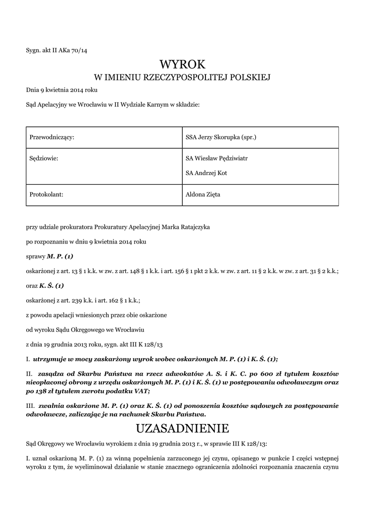 Sygn. akt II AKa 70/14 WYROK W IMIENIU RZECZYPOSPOLITEJ POLSKIEJ Dnia 9 kwietnia 2014 roku Sąd Apelacyjny we Wrocławiu w II Wydziale Karnym w składzie: Przewodniczący: SSA Jerzy Skorupka (spr.) Sędziowie: SA Wiesław Pędziwiatr SA Andrzej Kot Protokolant: Aldona Zięta przy udziale prokuratora Prokuratury Apelacyjnej Marka Ratajczyka po rozpoznaniu w dniu 9 kwietnia 2014 roku sprawy M. P. (1) oskarżonej z art. 13 § 1 k.k. w zw. z art. 148 § 1 k.k. i art. 156 § 1 pkt 2 k.k. w zw. z art. 11 § 2 k.k. w zw. z art. 31 § 2 k.k.; oraz K. Ś. (1) oskarżonej z art. 239 k.k. i art. 162 § 1 k.k.; z powodu apelacji wniesionych przez obie oskarżone od wyroku Sądu Okręgowego we Wrocławiu z dnia 19 grudnia 2013 roku, sygn. akt III K 128/13 I. utrzymuje w mocy zaskarżony wyrok wobec oskarżonych M. P. (1) i K. Ś. (1); II. zasądza od Skarbu Państwa na rzecz adwokatów A. S. i K. C. po 600 zł tytułem kosztów nieopłaconej obrony z urzędu oskarżonych M. P. (1) i K. Ś. (1) w postępowaniu odwoławczym oraz po 138 zł tytułem zwrotu podatku VAT; III. zwalnia oskarżone M. P. (1) oraz K. Ś. (1) od ponoszenia kosztów sądowych za postępowanie odwoławcze, zaliczając je na rachunek Skarbu Państwa. UZASADNIENIE Sąd Okręgowy we Wrocławiu wyrokiem z dnia 19 grudnia 2013 r., w sprawie III K 128/13: I. uznał oskarżoną M. P. (1) za winną popełnienia zarzuconego jej czynu, opisanego w punkcie I części wstępnej wyroku z tym, że wyeliminował działanie w stanie znacznego ograniczenia zdolności rozpoznania znaczenia czynu oraz pokierowania swoim postępowaniem i za to na podstawie art. 14 § 1 k.k. w zw. z art. 148 § 1 k.k. i w zw. z art. 11 § 3 k.k. wymierzył jej karę 8 (ośmiu) lat pozbawienia wolności; II. uznał oskarżoną K. Ś. (1) za winną popełnienia zarzuconych jej czynów, opisanych w punktach II i III części wstępnej wyroku przyjmując w zakresie czynu III, iż mogła udzielić pokrzywdzonemu pomocy bez narażania siebie lub innej osoby na niebezpieczeństwo utraty życia albo ciężkiego uszczerbku na zdrowiu, poprzez niezwłoczne wezwanie Pogotowia (...) i wymierzył jej kary: za czyn II na postawie art. 239 § 1 k.k., zaś za czyn III na podstawie art. 162 § 1 k.k. - po 6 (sześć) miesięcy pozbawienia wolności; III. na podstawie art. 85 k.k. i art. 86 § 1 k.k. połączył kary pozbawienia wolności wymierzone K. Ś. (1) i orzekł wobec tej oskarżonej karę łączną 8 (ośmiu) miesięcy pozbawienia wolności; IV. na podstawie art. 69 § 1 k.k. i art. 70 § 1 pkt 1 k.k. wykonanie orzeczonej kary łącznej pozbawienia wolności warunkowo zawiesił oskarżonej K. Ś. (1) na okres próby lat 2 (dwóch); V. na podstawie art. 63 § 1 k.k. na poczet wymierzonej kary pozbawienia wolności zaliczył oskarżonej M. P. (1) okres jej zatrzymania i tymczasowego aresztowania od dnia 8 listopada 2012 r. do dnia 19 grudnia 2013 r.; VI. na podstawie art. 63 § 1 k.k. na poczet wymierzonej kary łącznej pozbawienia wolności zaliczył oskarżonej K. Ś. (1) okres jej zatrzymania od dnia 8 listopada 2012 r. do dnia 9 listopada 2012 r.; VII. na podstawie art. 44 § 2 k.k. orzekł przepadek przez zniszczenie dowodu rzeczowego w postaci noża kuchennego, opisanego w wykazie nr I/471/12 k. 199, poz. 1; VIII. na podstawie art. 230 § 2 k.p.k. zwrócił oskarżonej M. P. (1) dowody rzeczowe, opisane w wykazach nr I/471/12, k. 199, poz. 2-9, nr II/472/12, k. 201, poz. 11-13, 16-20, nr IV/474/12 k. 205, poz. 31-34; IX. na podstawie art. 230 § 2 k.p.k. zwrócił oskarżonej K. Ś. (1) dowody rzeczowe, opisane w wykazie nr III/473/12, k. 203, poz. 21-29, X. na podstawie art. 192a § 1 k.p.k. orzekł przepadek przez zniszczenie dowodów, opisanych w wykazach nr II/472/12, k. 201, poz. 10, 14 i 15, nr IV/474/12, k. 205, poz. 35 i 36 oraz nr V/91/13, k. 370, poz. 37-45, a nadto przepadek przez pozostawienie w aktach sprawy dowodów w postaci płyt CD, opisanych w wykazie nr V/91/13, k. 370, poz. 46-48; XI. zasądził od Skarbu Państwa na rzecz adw. A. S. z Kancelarii Adwokackiej we W. kwotę 2.583,00 zł brutto tytułem zwrotu kosztów nieopłaconej obrony z urzędu oskarżonej M. P. (1); XII. zasądził od Skarbu Państwa na rzecz adw. K. C. z Kancelarii Adwokackiej we W. kwotę 2.214,00 zł brutto tytułem zwrotu kosztów nieopłaconej obrony z urzędu oskarżonej K. Ś. (1); XIII. zwolnił oskarżone od ponoszenia kosztów sądowych, zaliczając je na rachunek Skarbu Państwa. Apelację od tego wyroku wywiódł obrońca oskarżonej M. P. (1) adw. A. S., zaskarżając wyrok w całości i zarzucając: I. obrazę przepisów postępowania mającą wpływ na treść orzeczenia, a to: 1. art. 4 KPK w zw. z art. 7 KPK poprzez uwzględnienie jedynie okoliczności przemawiających na niekorzyść oskarżonej, wyrażających się w budowaniu przekonania o winie oskarżonej w oparciu o jednostronne i bezkrytyczne przyjęcie opinii psychiatrycznej z dnia 25.09.2013 r. niekorzystnej dla oskarżonej, przy jednoczesnej negatywnej ocenie opinii psychiatrycznej z dnia 25.09.2013 r.; nadto poprzez bezkrytyczne przyjęcie jednego z wielu składanych przez oskarżoną wyjaśnień, w których przyznała się do popełnienia zarzuconego jej czynu, bez rozważenia oceny wiarygodności wszystkich jej wyjaśnień, w których do zarzucanego jej czynu nie przyznała się; ponadto przez dowolną a nie swobodną ocenę dowodów polegającą na: • błędnym przyjęciu, że oskarżona działała w zamiarze bezpośrednim pozbawienia życia swojego konkubenta S. W., podczas gdy taką okoliczność można było ustalić wyłącznie o zeznania pokrzywdzonego, którym sąd odmówił wiarygodności oraz wyjaśnienia oskarżonej, która tylko raz, będąc pod wpływem leków wyjaśniła, że chciała zabić pokrzywdzonego, czego później nie podtrzymała, • nieuzasadnionej i jednostronnej ocenie, że opinia biegłych N. B. (1) i C. P. (1) z 25 września 2013 r. jest spójna i precyzyjna i zasługuje n