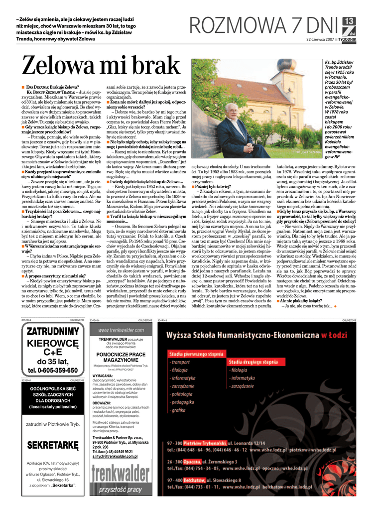 ROZMOWA 7 DNI – Zelów się zmienia, ale ja ciekawy jestem raczej ludzi niż miejsc, choć w Warszawie mieszkam 30 lat, to tego miasteczka ciągle mi brakuje – mówi ks. bp Zdzisław Tranda, honorowy obywatel Zelowa 22 czerwca 2007 đ TYGODNIK Zelowa mi brak đ EWA DRZAZGA: Brakuje Zelowa? KS. BISKUP ZDZISŁAW TRANDA: – Już się przyzwyczaiłem. Mieszkam w Warszawie prawie od 30 lat, ale kiedy miałem się tam przeprowadzić, obawiałem się aglomeracji. Bo choć wychowałem się w dużym mieście, to pracowałem zawsze w niewielkich miasteczkach, takich jak Zelów. Tu czuję się bardziej swojsko. đ Gdy wraca ksiądz biskup do Zelowa, rozpoznaje jeszcze przechodniów? – Poznaję, poznaję, ale wiele osób pamiętam jeszcze z czasów, gdy bawiły się w piaskownicy. Teraz już z ich rozpoznaniem miewam kłopoty. Kiedy wręczano mi tytuł Honorowego Obywatela spotkałem takich, którzy za moich czasów w Zelowie dziećmi już nie byli i kto jest kim, wiedziałem bezbłędnie. đ Każdy przyjazd to sprawdzanie, co zmieniło się w ulubionych miejscach? – Zawsze przejdę się uliczkami, ale ja ciekawy jestem raczej ludzi niż miejsc. Tego, co u nich słychać, jak się miewają, co i jak myślą. Przyjeżdżam tu kilka razy do roku. Ale na przechadzkę czas zawsze muszę znaleźć. Samo miasteczko też się zmienia. đ Trzydzieści lat poza Zelowem… czego najbardziej brakuje? – Samego miasteczka i ludzi z Zelowa. No i mrkwanców oczywiście. To takie kluski z ziemniaków, nadziewane marchewką. Mogą być też z mięsem mielonym lub serem, ale marchewka jest najlepsza. đ W Warszawie żadna restauracja tego nie serwuje? – Chyba żadna w Polsce. Nigdzie poza Zelowem się z tą potrawą nie spotkałem. A na emeryturze czy nie, na mrkwance zawsze mam apetyt. đ À propos emerytury: nie nudzi się? – Kiedyś pewien emerytowany biskup powiedział, że nigdy nie był tak zapracowany jak na emeryturze, tylko że, jak mówił, teraz robi to co chce i co lubi. Wiem, o co mu chodziło, bo w moim przypadku jest podobnie. Mam sporo zajęć, które zmuszają mnie do dyscypliny. Cza3351044 OGŁOSZENIE ZATRUDNIMY KIEROWCĘ C+E do 35 lat, tel. 0-605-359-650 3333961 OGŁOSZENIE OGÓLNOPOLSKA SIEĆ SZKÓŁ ZAOCZNYCH DLA DOROSŁYCH (licea i szkoły policealne) zatrudni w Piotrkowie Tryb. SEKRETARKĘ Aplikacje (CV, list motywacyjny) prosimy składać w Biurze Ogłoszeń, Piotrków Tryb., ul. Słowackiego 16 z dopiskiem „Sekretarka”. sami sobie żartuję, że z zawodu jestem przewodniczącym. Teraz pełnię tę funkcję w trzech organizacjach. đ Żona nie mówi: dałbyś już spokój, odpoczniemy sobie wreszcie? – Dobrze wie, że bardzo by mi tego ruchu i aktywności brakowało. Mam ciągle przed oczyma to, co powiedział Jean Pierre Norbiln: „Głaz, który się nie toczy, obrasta mchem”. Ja muszę się toczyć, tylko przy okazji uważać, żeby się nie stoczyć. đ Nie było nigdy ochoty, żeby założyć nogę na nogę i powiedzieć: dzisiaj nic nie będę robił… – Raczej mi się to nie zdarza. Był co prawda taki okres, gdy chorowałem, ale wtedy zająłem się spisywaniem wspomnień. „Doszedłem” już do końca wojny. Ale teraz mam dłuższą przerwę. Będę się chyba musiał wkrótce zabrać za ciąg dalszy… đ I wtedy dojdzie ksiądz biskup do Zelowa… – Kiedy już będę na 1952 roku, owszem. Bo choć jestem honorowym obywatelem miasta, to przecież z Zelowa nie pochodzę. Do 1939 roku mieszkałem w Poznaniu. Potem była Rawa Mazowiecka, Radom. Moja pierwsza placówka po studiach to właśnie Zelów. đ Trafił tu ksiądz biskup w nieszczególnym momencie… – Owszem. Bo fenomen Zelowa polegał na tym, że do wojny narodowość determinowała tutaj wyznanie: Polak to katolik, a Czech – ewangelik. Po 1945 roku ponad 75 proc. Czechów wyjechało do Czechosłowacji. Objąłem parafię, gdy spory i konflikty jeszcze nie wygasły. Zanim tu przyjechałem, słyszałem o aktach wandalizmu czy napadach, które przyczyniły się do większej emigracji. Pomyślałem sobie, że skoro jestem w parafii, w której dochodziło do takich wydarzeń, powinienem „szczypać” katolików. Aż po jednym z nabożeństw, podczas którego też coś drażliwego powiedziałem, przyszedł do mnie członek rady parafialnej i powiedział: proszę księdza, u nas tak nie można. My mamy sąsiadów katolików, pracujemy z katolikami, nasze dzieci wspólnie 3342656 13 OGŁOSZENIE TRENKWALDER poszukuje dla swojego Klienta osób na stanowisko: POMOCNICZE PRACE MAGAZYNOWE Miejsce pracy: Wolbórz okolice Piotrkowa Tryb. Nr ref.: PPM/PIO/0607 WYMAGANIA: dyspozycyjność, wykształcenie min. zasadnicze zawodowe, dobry stan zdrowia, chęć do pracy, mile widziane uprawnienie do obsługi wózków widłowych i książeczka Sanepid. OBOWIĄZKI: prace fizyczne (pomoc przy załadunkach i rozładunkach), segregacja palet, podział, foliowanie, etykietowanie. Możliwość stałego zatrudnienia u naszego Klienta, transport do miejsca pracy. Trenkwalder & Partner Sp. z o.o., 97-300 Piotrków Tryb., ul. Młynarska 2 pok. 208 Tel./fax: (+48) 44 649 99 21 [email protected] 3349145 FOT., EWA DRZAZGA się bawią i chodzą do szkoły. U nas trzeba miłości. To był 1952 albo 1953 rok, sam początek mojej pracy i najlepsza lekcja ekumenii, jaką otrzymałem. đ Później było łatwiej? – Z każdym rokiem, z tym, że czasami dochodziło do zabawnych nieporozumień, bo przecież jestem Polakiem, o czym nie wszyscy wiedzieli. No i zdarzały się takie śmieszne sytuacje, jak choćby ta u fryzjera. Usiadłem na fotelu, a fryzjer zagaja rozmowę o sporcie: no i cóż, księdza rodak zwyciężył. Ja na to: nie, mój był na czwartym miejscu. A on na to: jak to, przecież wygrał Vesely. Myślał, że skoro jestem proboszczem w „czeskiej” parafii, to sam też muszę być Czechem! Dla mnie najbardziej niesamowite w mojej zelowskiej historii było to odczuwanie, że jestem stopniowo akceptowany również p