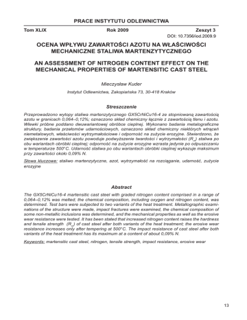 PRACE INSTYTUTU ODLEWNICTWA Tom XLIX Rok 2009 Zeszyt 3 DOI: 10.7356/iod.2009.9 OCENA WPŁYWU ZAWARTOŚCI AZOTU NA WŁAŚCIWOŚCI MECHANICZNE STALIWA MARTENZYTYCZNEGO AN ASSESSMENT OF NITROGEN CONTENT EFFECT ON THE MECHANICAL PROPERTIES OF MARTENSITIC CAST STEEL Mieczysław Kuder Instytut Odlewnictwa, Zakopiańska 73, 30-418 Kraków Streszczenie Przeprowadzono wytopy staliwa martenzytycznego GX5CrNiCu16-4 ze stopniowaną zawartością azotu w granicach 0,064–0,12%; oznaczono skład chemiczny łącznie z zawartością tlenu i azotu. Wlewki próbne poddano dwuwariantowej obróbce cieplnej. Wykonano badania metalograficzne struktury, badania przełomów udarnościowych, oznaczono skład chemiczny niektórych wtrąceń niemetalowych, właściwości wytrzymałościowe i odporność na zużycie erozyjne. Stwierdzono, że zwiększenie zawartości azotu powoduje podwyższenie twardości i wytrzymałości (Rm) staliwa po obu wariantach obróbki cieplnej; odporność na zużycie erozyjne wzrasta jedynie po odpuszczaniu w temperaturze 500°C. Udarność staliwa po obu wariantach obróbki cieplnej wykazuje maksimum przy zawartości około 0,09% N. Słowa kluczowe: staliwo martenzytyczne, azot, wytrzymałość na rozciąganie, udarność, zużycie erozyjne Abstract The GX5CrNiCu16-4 martensitic cast steel with graded nitrogen content comprised in a range of 0,064–0,12% was melted; the chemical composition, including oxygen and nitrogen content, was determined. Test bars were subjected to two variants of the heat treatment. Metallographic examinations of the structure were made, impact fractures were examined, the chemical composition of some non-metallic inclusions was determined, and the mechanical properties as well as the erosive wear resistance were tested. It has been stated that increased nitrogen content raises the hardness and tensile strength (Rm) of cast steel after both variants of the heat treatment; the erosive wear resistance increases only after tempering at 500°C. The impact resistance of cast steel after both variants of the heat treatment has its maximum at a content of about 0,09% N. Keywords: martensitic cast steel, nitrogen, tensile strength, impact resistance, erosive wear 13 13 Mieczysław Kuder Prace IO 3/2009 Wprowadzenie Wysokostopowe staliwa martenzytyczne łączą wysoką wytrzymałość na rozciąganie, twardość, udarność, charakterystyczną dla materiałów martenzytycznych z wysoką odpornością korozyjną, na poziomie gatunków austenitycznych typu 18-8. Wykazują one dobrą odporność na erozyjne oddziaływanie mediów zawierających jony chlorkowe i siarczanowe, zanieczyszczonych cząstkami stałymi. Znajdują one szerokie zastosowanie w produkcji odlewów - elementów instalacji przemysłowych; typu pompy, zawory, kształtki w systemach odwadniania kopalń węgla, medzi, siarki, jak również w środowisku wody morskiej [1]. Staliwo tego typu poddawane jest najczęściej dwustopniowej obróbce cieplnej. Po pierwszym etapie obróbki cieplnej, przesycaniu, uzyskuje się strukturę martenzytyczną o wysokiej wytrzymałości na rozciąganie lecz niskiej udarności i czułą na korozję naprężeniową. Drugi etap, odpuszczanie, powoduje „zmiękczenie" martenzytu i równoczesne pojawienie się wydzieleń międzymetalicznych m.in. fazy ε, bogatej w Cu, jak też Nb(C,N) wzmacniających stop. Ze wzrostem temperatury odpuszczania do 620°C, spada wytrzymałość na rozciąganie i granica plastyczności, lecz zwiększa się wydłużenie, udarność i odporność na korozję szczelinową i wżerową. Gatunkiem martenzytycznego staliwa wysokostopowego, utwardzanego wydzieleniowo, ujętego w aktualnej polskiej normie PN-EN 10283:2002 Odlewy ze staliwa odpornego na korozję, jest gatunek GX5CrNiCu16-4 (nr 1.4525). Wymagania ww. normy dotyczą składu chemicznego i właściwości wytrzymałościowych po dwuwariantowej obróbce cieplnej. Azot, w temperaturze 1600°C, rozpuszcza się w ciekłym żelazie w ilości ok. 0,04%; w temperaturze otoczenia (stan stały) - w ilości 0,002–0,008%. W staliwie, znajduje się on w postaci azotków i częściowo w roztworze stałym. Z żelazem, azot tworzy nietrwałe azotki, jednak z wieloma innym pierwiastkami stosowanymi w stalownictwie tworzy związki trwałe. Mikrododatki pierwiastków takich, jak: Ti, Zr, Nb, V, Ce są często stosowane jako modyfikatory dla uzyskania rozdrobnienia ziarna, najczęściej po końcowym odtlenieniu staliwa przy użyciu Al i/lub Ca. Zwiększenie zawartości azotu w stali, szczególnie przy odtlenianiu kąpieli przy pomocy aluminium, zwiększa Rm i Rp0,2 oraz twardość, lecz równocześnie silnie obniża wydłużenie stopu i podwyższa temperaturę przejścia plastyczno-kruchego [2]. Maksymalna rozpuszczalność azotu w staliwie jest zależna od ilości składników stopowych [3, 4]; dla staliwa węglowego wynosi około 0,033%, niskostopowego Ni-Cr-Mo – 0,038%, zaś wysokostopowego Cr-Ni – nawet 0,21%. Jednak przy wyższej zawartości C i Si silnie zmniejszających rozpuszczalność azotu w żelazie, zwykle występujących w stopach żelaza i z uwagi na zjawisko segregacji, w grubszych ściankach odlewu może dojść do wydzielenia azotków żelaza lub nawet gazu cząsteczkowego, utworzenia pęcherzy i innych wad pochodzenia gazowego. Dodatkowym zagadnieniem jest użycie azotu jako pierwiastka stopowego w staliwie nierdzewnym. Jest on coraz częściej stosowany wprzypadku gatunków „duplex" i „superaustenitycznych" o wysokiej zawartości Cr (powyżej 20%) i Ni. W „oszczędnościowych" gatunkach staliwa częściowo zastępuje nikiel. W przypadku, gdy występuje on w roztworze jako pierwiastek międzywęzłowy w sieci krystalicznej, tworzy liczne dyslokacje wywołując efekt utwardzający; korzystnie oddziaływując na właściwości mechaniczne; podnosi on również w sposób zauważalny odporność staliwa na korozję wżerową. 14 Prace IO 3/2009 Ocena wpływu zawartości azotu na właś