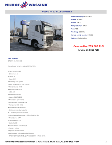 VOLVO FH 13 GLOBETROTTER Nr referencyjny: 419/2016 Marka: VOLVO Model: FH 13 Rok produkcji: 2015 Moc: 460 Przebieg: 180401 Norma emisji spalin: EURO6 Kabina: Globetrotter Cena netto: 295 000 PLN brutto: 362 850 PLN Opis pojazdu: OFERTA NR 419/2016 Specyfikacja Volvo FH 460 GLOBETROTTER • Typ: Volvo FH 460 • Silnik: Euro-6 • Tacho 2c • Kolor: biały • Przebieg : 180 tys km • Data pierwszej rej.: 2015-04-30 • Rok produkcji: 2015 • Kabina: Globetrotter • ABS, ASR • Radio-odtwarzacz • Opony: 315/70/22,5 • Niezależne ogrzewanie • Klimatyzacja automatyczna • Tempomat ECO-ROLL • Volvo Engine Brake VEB+ • Elektryczne szyby i lusterka • 2 Zbiorniki paliwa 570l +900l • Skrzynia biegów automat I-Shift z funkcją I See • Przełożenie : 2,47 • Tylne światła LED • Lodówka 33l • Automatyczna klimatyzacja • Spoilery kabiny • Spoilery międzyosiowe • Lakierowane osłony zderzaka i lusterek • FABRYCZNA KLIMATYZACJA PARKINGOWA - I-PARK COOL CENTRUM SAMOCHODÓW UŻYWANYCH ul. Holenderska 3, 99-300 Kutno,Tel.:(+48) 24 35 70 134 1 Zobacz kto opiekuje się Twoim województwem: Marcin - wielkopolskie, lubuskie, dolnośląskie - +48 603 650 034 Zbyszek- łódzkie, mazowieckie, podlaskie, lubelskie, świętokrzyskie, opolskie, śląskie, małopolskie, podkarpackie-+48 723 987 432 Przemek - zachodnio-pomorskie, pomorskie, kujawsko-pomorskie, mazursko-warmińskie - +48 609 150 025 ZAPRASZAMY Powyższe dane pojazdu zostały zamieszczone w dobrej wierze. Zastrzegamy sobie jednak prawo do pomyłki w specyfikacji technicznej czy opisie stanu technicznego. Aktualność specyfikacji, ceny oraz dostępność pojazdu musi zostać potwierdzona przez bezpośredni kontakt z naszym pracownikiem. Zapraszamy. CENTRUM SAMOCHODÓW UŻYWANYCH ul. Holenderska 3 99-300 Kutno Tel.:(+48) 24 35 70 134 Fax.:(+48) 24 35 70 135 OSOBY DO KONTAKTU: Zbigniew Lachowicz tel. (+48) 723 987 432 e-mail: [email protected] Marcin Napieralski tel. (+48) 603 650 034 e-mail: [email protected] CENTRUM SAMOCHODÓW UŻYWANYCH ul. Holenderska 3, 99-300 Kutno,Tel.:(+48) 24 35 70 134 2 CENTRUM SAMOCHODÓW UŻYWANYCH ul. Holenderska 3, 99-300 Kutno,Tel.:(+48) 24 35 70 134 3 CENTRUM SAMOCHODÓW UŻYWANYCH ul. Holenderska 3, 99-300 Kutno,Tel.:(+48) 24 35 70 134 4 CENTRUM SAMOCHODÓW UŻYWANYCH ul. Holenderska 3, 99-300 Kutno,Tel.:(+48) 24 35 70 134 5 http://ciezarowki-uzywane.pl/volvo-fh-13-globetrotter-c324.html CENTRUM SAMOCHODÓW UŻYWANYCH ul. Holenderska 3, 99-300 Kutno,Tel.:(+48) 24 35 70 134 6