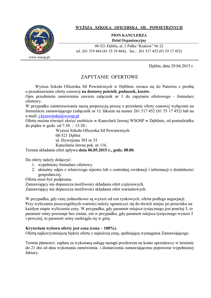 WYŻSZA SZKOŁA OFICERSKA SIŁ POWIETRZNYCH PION KANCLERZA Dział Organizacyjny 08-521 Dęblin, ul. 2 Pułku “Kraków” Nr 22 tel. 261 519 464 (81 55 19 464); fax.: 261 517 452 (81 55 17 452) www.wsosp.pl Dęblin, dnia 29.04.2015 r. ZAPYTANIE OFERTOWE Wyższa Szkoła Oficerska Sił Powietrznych w Dęblinie zwraca się do Państwa z prośbą o przedstawienie oferty cenowej na dostawę pościeli, poduszek, koców. Opis przedmiotu zamówienia zawiera załącznik nr 1 do zapytania ofertowego - formularz ofertowy. W przypadku zainteresowania naszą propozycją proszę o przesłanie oferty cenowej wyłącznie na formularzu zamawiającego (załącznik nr 1): faksem na numer 261 517 452 (81 55 17 452) lub na e-mail: [email protected] Ofertę można również złożyć osobiście w Kancelarii Jawnej WSOSP w Dęblinie, od poniedziałku do piątku w godz. od 7.30. – 15.30.: Wyższa Szkoła Oficerska Sił Powietrznych 08-521 Dęblin ul. Dywizjonu 303 nr 35 Kancelaria Jawna pok. nr 116. Termin składania ofert upływa dnia 06.05.2015 r., godz. 08.00. Do oferty należy dołączyć: 1. wypełniony formularz ofertowy 2. aktualny odpis z właściwego rejestru lub z centralnej ewidencji i informacji o działalności gospodarczej. Oferta musi być podpisana. Zamawiający nie dopuszcza możliwości składania ofert częściowych. Zamawiający nie dopuszcza możliwości składania ofert wariantowych. W przypadku, gdy ceny jednostkowe są wyższe od cen rynkowych, oferta podlega negocjacji. Przy wyliczaniu poszczególnych wartości należy ograniczyć się do dwóch miejsc po przecinku na każdym etapie wyliczenia ceny. W przypadku, gdy parametr miejsca tysięcznego jest poniżej 5, to parametr setny pozostaje bez zmian, zaś w przypadku, gdy parametr miejsca tysięcznego wynosi 5 i powyżej, to parametr setny zaokrągla się w górę. Kryterium wyboru oferty jest cena (cena – 100%). Ofertą najkorzystniejszą będzie oferta z najniższą ceną, spełniającą wymagania Zamawiającego. Termin płatności: zapłata za wykonaną usługę nastąpi przelewem na konto sprzedawcy w terminie do 21 dni od dnia wykonania zamówienia i dostarczenia zamawiającemu poprawnie wypełnionej faktury. Osobą upoważnioną do kontaktów z Wykonawcami jest: a) w sprawach merytorycznych: Beata Stoń, tel. 261 517 708 (81 55 17 708) lub 603 989 275. b) w sprawach proceduralnych: Joanna Krzewińska, tel. 261 519 464 (81 55 19 464) W załączeniu 1. Opis przedmiotu zamówienia (formularz ofertowy: załącznik nr 1) 2. Wzór umowy (załącznik nr 2). KANCLERZ mgr Waldemar BIENIEK Załącznik nr 1 FORMULARZ OFERTOWY W odpowiedzi na zapytanie składamy ofertę. Szczegółowy opis przedmiotu zamówienia Przedmiotem zamówienia są: pościel, poduszki, koce (zgodnie z opisem w tabeli). Wykonawca: .............................................................................................................................. Siedziba/adres:..................................................................................................................................... ................................................................................................................................................ Nr telefonu:...................................................... Nr faksu: …................................................... e-mail: …………………………………………………………………………………….. Nr NIP: ........................................................ Nr REGON: ................................................... W odpowiedzi na zapytanie Wyższej Szkoły Oficerskiej Sił Powietrznych w Dęblinie składamy niniejszą ofertę oświadczając, że akceptujemy w całości treści zawarte w szczegółowym opisie przedmiotu zamówienia oraz wszystkie warunki zawarte w projekcie umowy. Oświadczamy, że zapoznaliśmy się z postanowieniami umowy i zobowiązujemy się, w przypadku wyboru naszej oferty, do zawarcia umowy zgodnej z niniejszą ofertą, w miejscu i terminie wyznaczonym przez Zamawiającego. W przypadku wyboru mojej oferty jako najkorzystniejszej, osobą upoważnioną do podpisania umowy jest .................................................................................................................................. Po zapoznaniu się z opisem przedmiotu zamówienia, oferujemy wykonanie zamówienia po następujących cenach: L.p. Nazwa przedmiotu Iloś ć szt. A B C 1. 2. PODUSZKA Rozmiar 70/80 cm. Materiał- mikrofibra z fizeliną. Wypełnieniesylikonowy, sprężysty granulat kulkowy z możliwością prania w temp. 40⁰C KOC Rozmiar 210 x 160 cm. Anilana z bawełną -85%/15%, obszyta lamówką z możliwością wielokrotnego prania. 300 300 Cena jednostkowa netto zł Wartość netto (zł) stawka VAT % Kwota VAT (zł) Wartość zamówienia brutto (zł) D E=Cx D F G=Fx E H=E+G 3. 4. 5. PRZEŚCIERADŁO – Rozmiar 200/160 cm, bawełna 100%, gramatura 160g/m 2, kolor biały, obszycie z dwóch stron, kurczliwość do 5%, temp. prania do 950C. POSZEWKA Rozmiar 70x80 cm, bawełna 100%, gramatura 150/m2, kolor jasny wzorzysty, nie odbarwiająca się na skutek prania, zapięcie – zakład hotelowy 20 cm POSZWA Rozmiar 210x160 cm, bawełna 100%, gramatura 150/m2, kolor jasny wzorzysty, nie odbarwiająca się na skutek prania, zapięcie – zakład hotelowy 30 cm, kurczliwość do 5%, temp. prania do 60°C; 300 300 300 RAZEM Cena brutto ……………………. PLN (słownie: …………………………………………………… ……………………………………………………………………………………………………….) Termin dostawy: do 08.05.2015 r. Koszt dostawy po stronie wykonawcy: wliczony w cenę towaru. Dostawa jednorazowa. Okres związania ofertą wynosi 30 dni licząc od upływu terminu składania ofert. Zobowiązuję się wykonać usługę zgodnie z umową i/lub formularzem ofertowym. ……………………………….…… 