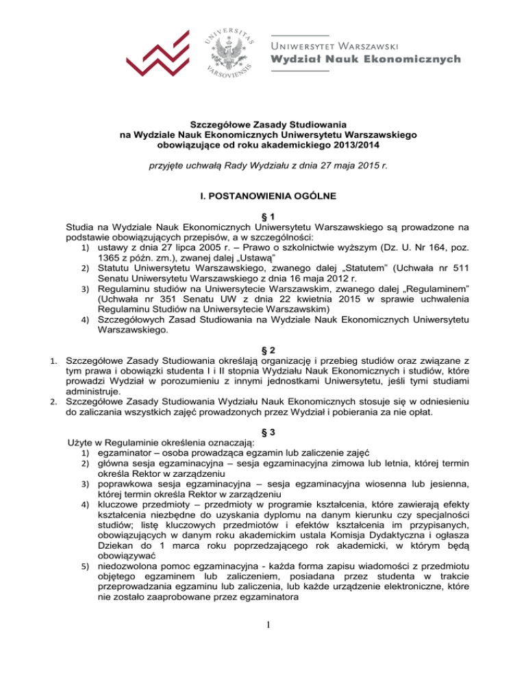 Szczegółowe Zasady Studiowania na Wydziale Nauk Ekonomicznych Uniwersytetu Warszawskiego obowiązujące od roku akademickiego 2013/2014 przyjęte uchwałą Rady Wydziału z dnia 27 maja 2015 r. I. POSTANOWIENIA OGÓLNE §1 Studia na Wydziale Nauk Ekonomicznych Uniwersytetu Warszawskiego są prowadzone na podstawie obowiązujących przepisów, a w szczególności: 1) ustawy z dnia 27 lipca 2005 r. – Prawo o szkolnictwie wyższym (Dz. U. Nr 164, poz. 1365 z późn. zm.), zwanej dalej „Ustawą” 2) Statutu Uniwersytetu Warszawskiego, zwanego dalej „Statutem” (Uchwała nr 511 Senatu Uniwersytetu Warszawskiego z dnia 16 maja 2012 r. 3) Regulaminu studiów na Uniwersytecie Warszawskim, zwanego dalej „Regulaminem” (Uchwała nr 351 Senatu UW z dnia 22 kwietnia 2015 w sprawie uchwalenia Regulaminu Studiów na Uniwersytecie Warszawskim) 4) Szczegółowych Zasad Studiowania na Wydziale Nauk Ekonomicznych Uniwersytetu Warszawskiego. §2 1. Szczegółowe Zasady Studiowania określają organizację i przebieg studiów oraz związane z tym prawa i obowiązki studenta I i II stopnia Wydziału Nauk Ekonomicznych i studiów, które prowadzi Wydział w porozumieniu z innymi jednostkami Uniwersytetu, jeśli tymi studiami administruje. 2. Szczegółowe Zasady Studiowania Wydziału Nauk Ekonomicznych stosuje się w odniesieniu do zaliczania wszystkich zajęć prowadzonych przez Wydział i pobierania za nie opłat. §3 Użyte w Regulaminie określenia oznaczają: 1) egzaminator – osoba prowadząca egzamin lub zaliczenie zajęć 2) główna sesja egzaminacyjna – sesja egzaminacyjna zimowa lub letnia, której termin określa Rektor w zarządzeniu 3) poprawkowa sesja egzaminacyjna – sesja egzaminacyjna wiosenna lub jesienna, której termin określa Rektor w zarządzeniu 4) kluczowe przedmioty – przedmioty w programie kształcenia, które zawierają efekty kształcenia niezbędne do uzyskania dyplomu na danym kierunku czy specjalności studiów; listę kluczowych przedmiotów i efektów kształcenia im przypisanych, obowiązujących w danym roku akademickim ustala Komisja Dydaktyczna i ogłasza Dziekan do 1 marca roku poprzedzającego rok akademicki, w którym będą obowiązywać 5) niedozwolona pomoc egzaminacyjna - każda forma zapisu wiadomości z przedmiotu objętego egzaminem lub zaliczeniem, posiadana przez studenta w trakcie przeprowadzania egzaminu lub zaliczenia, lub każde urządzenie elektroniczne, które nie zostało zaaprobowane przez egzaminatora 1 6) osoba uprawniona do wystawienia oceny z zajęć – nauczyciel prowadzący zajęcia, a jeśli jest ich kilku – koordynator przedmiotu 7) Uniwersytet – Uniwersytet Warszawski 8) USOS – elektroniczny Uniwersytecki System Obsługi Studentów 9) Wydział – Wydział Nauk Ekonomicznych Uniwersytetu Warszawskiego 10) zajęcia ponadplanowe – zajęcia nie objęte planem studiów kierunku lub specjalności, na które student jest zapisany. 11) MSEM – Międzykierunkowe Studia Ekonomiczno-Matematyczne 12) MSEMEN - Międzykierunkowe Studia Ekonomiczno-Menedżerskie II. PODEJMOWANIE STUDIÓW 1. 2. 3. 4. 5. 6. 7. 8. 1. 2. 3. 4. §4 Studia na Wydziale można podjąć w trybie rekrutacji, przeniesienia z innej uczelni albo z innej jednostki Uniwersytetu, studiów równoległych lub wznowienia studiów. Szczegółowe zasady przyjęć na studia w trybie rekrutacji, przeniesień z innego kierunku studiów prowadzonego na Uniwersytecie lub ze studiów na innej uczelni są określone w uchwale rekrutacyjnej Senatu Uniwersytetu obowiązującej w danym cyklu dydaktycznym. Przeniesienia mogą być dokonywane na II rok studiów I stopnia i II stopnia. Studenci kierunków MSEM i MSEMEN prowadzonych przez Wydział wspólnie z innymi jednostkami Uniwersytetu mają prawo przenieść się na kierunki prowadzone samodzielnie przez Wydział na każdym etapie studiów. Zgodę na przeniesienie wydaje Dziekan ds. studenckich wydziału przyjmującego, który przy takim przeniesieniu może wyznaczyć różnice programowe. Wznowienia mogą być dokonywane od II roku na studia stacjonarne lub od I roku na studia niestacjonarne, jeśli są na nich wolne miejsca. Wymóg wolnych miejsc nie dotyczy wznawiania studiów na dzień egzaminu dyplomowego. Warunkiem przeniesienia na studia prowadzone przez Wydział jest uzupełnienie różnic programowych, wyznaczonych przez Dziekana na podstawie efektów kształcenia wymienionych w planie studiów, na które student się przenosi. Warunkiem wznowienia studiów jest uzupełnienie różnic programowych, wyznaczonych przez Dziekana. Różnice programowe obejmują najbardziej zaawansowane przedmioty z zakresu mikroekonomii i makroekonomii obowiązujące na danym stopniu studiów, seminarium dyplomowe oraz przedmioty lub praktyki, których student nie zaliczał w trakcie studiów lub których program, w tym efekty kształcenia, zmienił się. Dziekan może zwolnić studenta z wybranych różnic programowych, jeśli jego przerwa w studiowaniu jest krótsza niż 2 lata, z wyłączeniem sytuacji opisanej w § 36 ust.6. Decyzje o przeniesieniu lub wznowieniu studiów podejmuje Dziekan wyznaczając termin, w jakim studia mają być podjęte. §5 Wybór kierunku i specjalności studiów na studiach I stopnia dla studentów przyjętych na WNE bez kierunku następuje po I roku studiów na podstawie deklaracji wyboru kierunku i specjalności studiów oraz średniej ocen, obliczanej jako średnia arytmetyczna ocen końcowych z przedmiotów, uzyskanych do dnia składania deklaracji. W przypadku nieterminowego złożenia deklaracji wyboru o przydziale kierunku lub specjalności decyduje Dziekan kierując się w szczególności liczbą wolnych miejsc. Wybór kierunku lub specjalności studiów na studiach II stopnia następuje podczas rekrutacji. Wybór specjalności na kierunku MSEM, jednej bądź obu, następuje po trzecim semestrze. Student studiów prowadzonych przez Wydział może przenieść się na studia innego kierunku lub sp