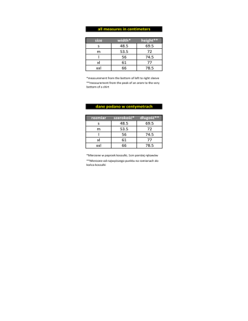all measures in centimeters size s m l xl xxl width* 48.5 53.5 56 61 66 height** 69.5 72 74.5 77 78.5 *measurement from the bottom of left to right sleeve **measurement from the peak of an arom to the very bottom of a shirt dane podano w centymetrach rozmiar s m l xl xxl szerokość* 48.5 53.5 56 61 66 długość** 69.5 72 74.5 77 78.5 *Mierzone w poprzek koszulki, 1cm poniżej rękawów **Mierzone od najwyższego punktu na ramionach do końca koszulki