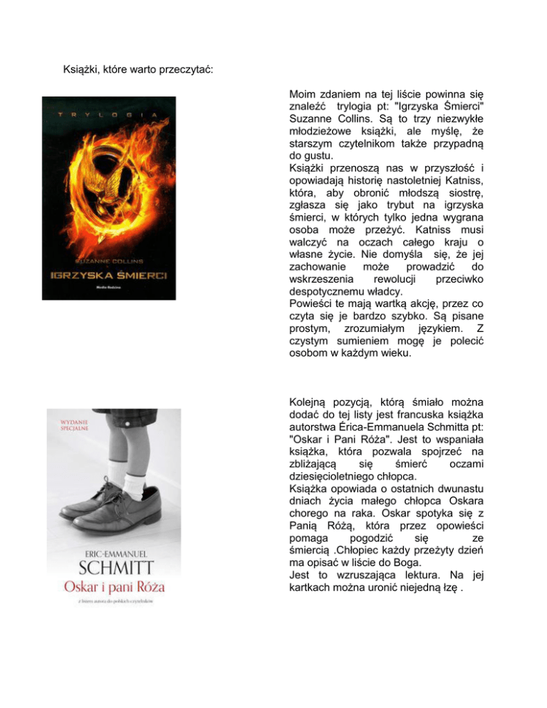 Książki, które warto przeczytać: Moim zdaniem na tej liście powinna się znaleźć trylogia pt: "Igrzyska Śmierci" Suzanne Collins. Są to trzy niezwykłe młodzieżowe książki, ale myślę, że starszym czytelnikom także przypadną do gustu. Książki przenoszą nas w przyszłość i opowiadają historię nastoletniej Katniss, która, aby obronić młodszą siostrę, zgłasza się jako trybut na igrzyska śmierci, w których tylko jedna wygrana osoba może przeżyć. Katniss musi walczyć na oczach całego kraju o własne życie. Nie domyśla się, że jej zachowanie może prowadzić do wskrzeszenia rewolucji przeciwko despotycznemu władcy. Powieści te mają wartką akcję, przez co czyta się je bardzo szybko. Są pisane prostym, zrozumiałym językiem. Z czystym sumieniem mogę je polecić osobom w każdym wieku. Kolejną pozycją, którą śmiało można dodać do tej listy jest francuska książka autorstwa Érica-Emmanuela Schmitta pt: "Oskar i Pani Róża". Jest to wspaniała książka, która pozwala spojrzeć na zbliżającą się śmierć oczami dziesięcioletniego chłopca. Książka opowiada o ostatnich dwunastu dniach życia małego chłopca Oskara chorego na raka. Oskar spotyka się z Panią Różą, która przez opowieści pomaga pogodzić się ze śmiercią .Chłopiec każdy przeżyty dzień ma opisać w liście do Boga. Jest to wzruszająca lektura. Na jej kartkach można uronić niejedną łzę . Bardzo biała wrona" polskiej autorki Ewy Nowak to książka skierowana do młodzieży. Autorka porusza temat przemocy psychicznej. Główną bohaterką jest Natalia, którą poznajemy, kiedy zaczyna uczyć się w liceum. Dziewczyna poznaje bardzo sympatycznego na pozór Norberta, który od razu zaczyna ją podrywać. Gdy już zostają parą, Natalia zauważa, że Norbert jednak nie jest księciem. Jest niebezpieczny. Książka ta zdecydowanie zalicza się do moich "naj". Jest napisana współczesnym językiem. Każdą stronę pochłania się bardzo szybko. Następną lekturą wartą przeczytania jest "Intruz" Stephenie Meyer. Powieść ta należy do science fiction/romans. Przedstawiony jest świat w przyszłości, który opanowały dusze. Dusze te zamieszkują ludzi, którzy przez nowych mieszkańców w swoich ciałach tracą kontrolę i stają się tylko żywicielami niewidzialnych wrogów. Poznajemy duszę o imieniu Wagabunda, która zamieszkała ciało Melanii i która stara się we wspomnieniach Melanii znaleźć trop prowadzący do pozostałych ludzi bez dusz. Jednak Wagabunga nie przejmuje tylko ciała dziewczyny, ale i uczucia. Powieść ta przenosi nas w świat fantasty i odrywa od świata rzeczywistego. Mimo że książka ta zdecydowanie należy do tych "gruubych", to czyta się ją łatwo, szybko i przyjemnie. Jedną z książek, które przypadły mi do gustu jest " Pomiędzy światami" Jessica Warman. Ta pozycja także należy do fantasty. Elizabeth poznajemy w ranek dzień po jej osiemnastych urodzinach. Dziewczyna nie żyje. Nikt jej nie widzi i nie słyszy prócz pewnego Alexa. Utknęła między światami. Elizabeth nie pamięta, jak umarła i z pomocą Alexa, a także powracających wspomnień próbuje ustalić przyczynę śmierci. W czasie śledztwa poznają różne tajemnice rodziny i przyjaciół dziewczyny, ale też związku za życia Elizabeth i Alexa. Jest to udana powieść z nutką tajemniczości. Napisana jest w taki sposób, że czytelnik do końca, wraz z narratorką, zastanawia się nad rozwiązaniem zagadki. Odpowiedź okazuje się zaskakująca. Ostatnia pozycja, to powieść Ewy Barańskiej pt: " Nie odchodź, Julio". Jest to kolejna książka pisana z myślą o młodzieży. Utwór ten opowiada historię nastoletniej Julii, która żyje w cieniu swojej starszej siostry. Julia na jednej z imprez siostry poznaje Mateusza. Dzięki kolejnym, lecz przypadkowym spotkaniom między bohaterami dochodzi do zbliżenia. Rodzi się uczucie, którego nie są w stanie powstrzymać, jednak jak zawsze istnieje jedno "ale". Mateusz ma dziewczynę, zaś bohaterka zapada na ciężką chorobę. Jest to wzruszająca powieść, która bardzo mnie poruszyła. Napisana jest prosto, ale inteligentnie. Medyczne terminy, występujące w książce, są wyjaśnione. Czyta się łatwo i szybko. Poleca Dominika Sargalska Odnalezione przypadkiem stare zdjęcie kryje wstydliwą rodzinna tajemnicę, którą próbuje rozwikłać piętnastoletnia Linka. Jakby tego jeszcze było mało - Linkę czeka trudny egzamin gimnazjalny, konflikt z przyjaciółką i miłość, na którą nie jest jeszcze gotowa. Linka niedawno dowiedziała się, że ma siostrę, którą mama oddała kiedyś do domu dziecka. Ma też ojczyma, z którym nie do końca potrafi się porozumieć. No i braciszka, który ciężko przeżywa rozstanie rodziców. W dodatku Linka idzie do liceum i po wakacjach musi odnaleźć się w nowej rzeczywistości i nowej klasie. Nie jest łatwo, szczególnie, że jej chłopak wyjechał do Londynu. Czy uda jej się znaleźć pracę i zarobić na czesne w szkole marzeń? Czy związek z Adrianem przetrwa? Związek, który nie zawsze smakuje jak czekolada mleczna. Częściej ma smak czekolady z chilli. Dalsze losy Linki z Kawy z kardamonem. Powieść dla nastolatków o miłości, przyjaźni i przeżywaniu bolesnych spraw. Alicja – do niedawna "Bardzo Rozpieszczona Jedynaczka" – staje przed koniecznością uporządkowania sobie świata na nowo po rozwodzie rodziców. Powoli dojrzewa do akceptacji nowej partnerki ojca i ułożenia trudnych relacji z matką. W jej życiu rodzi się pierwsza miłość, pojawia się też konieczność dokonywania wyborów. W swoim otoczeniu Alicja spotyka się z problemem anoreksji, narkotyków, wyboru między "mieć" i "być". Tym jednak, co najbardziej wpływa na jej życie, jest ciężka choroba przyrodniego braciszka. Alicja uczy się towarzyszyć w cierpieniu małemu Fryderykowi-Jaszczurce i jego mamie, tak nielubianej dotąd Miss Lata. Au