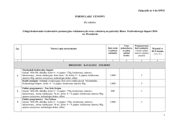 Załącznik nr 4 do SIWZ FORMULARZ CENOWY dla zadania: Usługi drukowania wydawnictw promocyjno–reklamowych wraz z dostawą na potrzeby Biura Festiwalowego Impart 2016 we Wrocławiu Lp. Nazwa i opis asortymentu Ilość sztuk w jednym nakładzie Cena jednostkowa za jeden nakład brutto Prognozowana ilość nakładów ( każdy nakład stanowi odrębny projekt) Wartość w PLN brutto (4x5) 1 2 3 4 5 6 BROSZURY KATALOGI FOLDERY 1 2 3 Niezbędnik Kulturalny Impart format: 180x180, okładka: kolor 4 + 4, papier: 170g, kredowany, matowy, lakierowany, strony redakcyjne: ilość stron - 36, kolor: 4 + 4, papier: kredowany matowy 80g, oprawa zeszytowa, technologia druku: offset Każde następne 4 strony zwiększające ilość stron redakcyjnych Niezbędnika Kulturalnego Impart , kolor: 4 + 4, papier: kredowany matowy 80g Folder programowy: Non Sola Scripta format: 180x180, okładka: kolor 4 + 4, papier: 170g, kredowany, matowy, lakierowany, strony redakcyjne: 36 str., kolor: 4 + 4, papier: kredowany matowy 80g, oprawa zeszytowa, technologia druku: offset Folder programowy: Via Cultura format: 180x180, okładka: kolor 4 + 4, papier: 170g/, kredowany, matowy, lakierowany, strony redakcyjne: 36 str., kolor: 4 + 4, papier: kredowany matowy 80g, oprawa zeszytowa, technologia druku: offset 3.000 3 3.000 3 800 1 2.000 1 1 4 5 6 Katalogi wystaw plastycznych: Łukasz Huculak – malarstwo, Christhoper Nowicki – grafika warsztatowa format: A4, okładka: kolor 4+4, kreda matowa 300g, folia matowa jednostronnie, lakier UV jednostronnie, strony redakcyjne: kolor 4 +4, kreda matowa 170g, 40 stron oprawa zeszytowa, technologia druku: offset Katalog wystawy: Ramka śląska format A4 pion, okładka: kolor 4+4, kreda matowa 300g, folia matowa jednostronnie, lakier UV wybiórczo na zewnątrz, strony redakcyjne: kolor 4 +4, kreda matowa 170g, 60 stron, oprawa: szyta nićmi i klejona, miękka, technologia druku: offset Folder programowy: Prometeusz format gotowego produktu: 210x99 , kolor 4 + 4, papier: 130g, kredowany, połysk, ilość: 8 stron, sposób łączenia: zeszytowe, technologia druku: offset 100 2 300 1 5.000 1 150 2 500 1 200 1 PLAKATY 7 Plakat: Bask format gotowego produktu: 506x1006, papier: kreda błysk 120g, kolor 4+0, technologia druku: offset 8 Plakat: Europejska Noc Literatury format B1, papier: kreda mat. 150g, kolor 4+0, technologia druku: offset 9 Plakaty repertuarowe B1 kolor: 4+0, papier: kreda mat. 135g, technologia druku: offset 150 5 10 Plakat: Wybory Literackie format B1, kolor: 4+0, papier: kreda błysk 135g, technologia druku: offset 250 1 11 Plakaty repertuarowe format B2, kolor: 4+0, papier: offset 135g, technologia druku: offset 150 10 12 Plakat: Wybory Literackie, Społeczna Akademia Kultury format B2, kolor: 4+0, papier: kreda błysk/mat 135g, technologia druku: offset 100 5 150 7 13 Plakaty repertuarowe format: 320x350, kolor: 4+0, papier: kreda mat. 135 g, technologia druku: offset 2 ULOTKI POCZTÓWKI ZAPROSZENIA NAKLEJKI 14 15 16 17 18 19 20 21 22 23 Ulotka Europejska Noc Literatury format: DL (210x99), kolor: 4 + 4, papier: kreda mat. 135g technologia druku: offset Ulotka repertuarowa format: DL (210x99), kolor: 4 + 4, papier: kreda mat. 135g technologia druku: offset Ulotka: Wybory Literackie, Kampania promocyjna, Wrocławski Sound, Wrocławski Teatr Dla Dzieci format: A4 (210x297), składana do 3xDL , kolor: 4 + 4, papier: kreda błysk/mat. 135 g, technologia druku: offset Ulotka: Via Cultura, Halo Echo format: A4 (210x297), składana na 2 do 210x148, kolor: 4 + 4, papier: kreda mat. 135 g, technologia druku: offset Ulotka: Eugeniusz Get Stankiewicz format: A4 (210x297), składana do 3xDL (3x210x99), kolor: 4 + 4, papier: kreda mat. 300 g, technologia druku: offset Ulotka: Filmowy Wrocław format: 592x148 składany na 4 do 148x148, kolor 4+4, papier: kreda błysk 200 g, technologia druku: offset Pocztówka: Bask format 116x216, kolor 4+1, papier 250-260g, jednostronnie lakier offsetowy, technologia druku: offset Pocztówka: Europejska Noc Literatury format: DL (210x99), karton GC1 z białym spodem, 250-260g, jednostronnie lakier offsetowy, kolor 4+1, technologia druku: offset Pocztówki: Pozdrowienia z Wrocławia i repertuarowe Format: A6, karton GC1 z białym spodem, 250-260g, jednostronnie lakier offsetowy, kolor 4+1, technologia druku: offset Zaproszenie: Europejska Noc Literatury format DL (210x99), kolor 4+1, papier kreda mat. 300g, technologia druku: offset 15.000 1 5.000 4 3.000 2 5.000 4 3.000 1 5.000 1 500 1 100 3 2.000 1 1.000 1 10.000 1 1.000 1 200 1 3 DRUKI FIRMOWE 24 Teczka firmowa: BF Impart 2016, ESK format: A4, kolor 4+0, grzbiet ok. 3mm, tektura 250-300g, folia matowa zewnętrznie, dwa wewnętrzne skrzydełka, nacięcie na wizytówki (opcjonalnie ) 1.000 1 500 2 25 Koperty DL Format 110x220, biała z nadrukiem 2+0, papier 80-90g, samoprzylepne 1.000 1 26 Koperty C4 Format 229x324, biała z nadrukiem 2+0, papier 80-90g, samoprzylepne 1.000 1 Suma wszystkich wierszy kolumny 6 = CENA OFERTY 1.Cena oferty musi być wyliczona zgodnie z tabelą Formularza cenowego, przy czym: - ceny jednostkowe brutto winny zawierać wszelkie koszty niezbędne dla prawidłowego i pełnego wykonania przedmiotu zamówienia oraz uwzględniać inne opłaty i podatki, a także ewentualne upusty i rabaty zastosowane przez wykonawcę, - cena jednostkowa brutto ( kolumna 4 ), wartość brutto ( kolumna 6 ) oraz suma wszystkich wierszy z kolumny 6 – CENA OFERTOWA ( zaciemnione pole ) muszą być podane do 2 miejsc po przecinku, - zamawiający wymaga, aby wykonawca wycenił każdy asortyment opisany w tabeli, żadna z pozycji niniejszego Formularza cenowego nie może być określona wartością 0,00 zł, - cenę oferty należy wyliczyć sumując wszystkie wartości podane w kolumnie 6 i wpisać w zaciemnione pole. - cenę oferty należy wpisać cyfrowo w Formularzu ofertowym – załącznik nr 1 do SIWZ oraz podać w % stawkę podatku VAT. 2. Ilości wskazane w kolumnie 5 tabeli są ilo