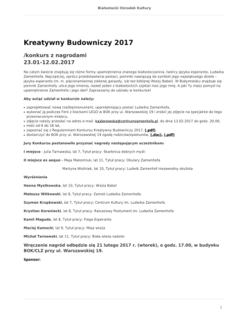 Białostocki Ośrodek Kultury Kreatywny Budowniczy 2017 /konkurs z nagrodami 23.01-12.02.2017 Na całym świecie znajdują się różne formy upamiętnienia znanego białostoczanina, twórcy języka esperanto, Ludwika Zamenhofa. Najczęściej, oprócz przedstawienia postaci, pomniki nawiązują do symboli jego największego dzieła – języka esperanto (m. in. pięcioramiennej zielonej gwiazdy, lub też biblijnej Wieży Babel). W Białymstoku znajduje się pomnik Zamenhofa, ulica jego imienia, nawet jeden z białostockich szpitali nosi jego imię. A jaki Ty masz pomysł na upamiętnienie Zamenhofa i jego idei? Zapraszamy do udziału w konkursie! Aby wziąć udział w konkursie należy: ● ● ● ● ● ● zaprojektować nową rzeźbę/monument, upamiętniający postać Ludwika Zamenhofa, wykonać ją podczas Ferii z klockami LEGO w BOK przy ul. Warszawskiej 19 i zrobić jej zdjęcie na specjalnie do tego przeznaczonym miejscu, zdjęcie należy przesłać na adres e-mail: [email protected], do dnia 13.02.2017 do godz. 20.00, mieć od 6 do 16 lat, zapoznać się z Regulaminem Konkursu Kreatywny Budowniczy 2017, (.pdf) dostarczyć do BOK przy ul. Warszawskiej 19 zgodę rodziców/opiekunów, (.doc), (.pdf) Jury Konkursu postanowiło przyznać nagrody następującym uczestnikom: I miejsce - Julia Tarnawska, lat 7, Tytuł pracy: Skarbnica dobrych myśli II miejsce ex aequo - Maja Maksimiuk, lat 11, Tytuł pracy: Okulary Zamenhofa Martyna Woźniak, lat 10, Tytuł pracy: Ludwik Zamenhof niezawodny okulista Wyróżnienia Hanna Mystkowska, lat 10, Tytuł pracy: Wieża Babel Mateusz Witkowski, lat 8, Tytuł pracy: Zamek Ludwika Zamenhofa. Szymon Krupkowski, lat 7, Tytuł pracy: Centrum Kultury im. Ludwika Zamenhofa Krystian Koroniecki, lat 8, Tytuł pracy: Ratuszowy Postument im. Ludwika Zamenhofa Kamil Maguda, lat 8, Tytuł pracy: Flaga Esperanto Maciej Kamocki, lat 9, Tytuł pracy: Moja wieża Michał Tarnawski, lat 11, Tytuł pracy: Biała wieża nadziei Wręczenie nagród odbędzie się 21 lutego 2017 r. (wtorek), o godz. 17.00, w budynku BOK/CLZ przy ul. Warszawskiej 19. Sponsor: 1 Białostocki Ośrodek Kultury 2