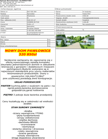 Agencja Nieruchomosci "ALTERNATYWA" os. Sikorskiego 65, 44-240 Żory tel. +48 500 440 600 e-mail: [email protected] NIP: 651-153-63-31 Informacje ogólne Nieruchomość Oferta nr ALT-DS-344 Garaż w budynku Rodzaj sprzedaż Okna nowe PCV Lokalizacja Pawłowice Powierzchnia działki [m2] 358.00 Ilość pokoi 5 Zagosp. działki niezagospodarowana Pow. całkowita [m2] 164.44 m² Kształt działki kwadrat Cena 320850.00 PLN Powierzchnia użytkowa [m2] 128,28 Cena/m2 1951.17 Stan budynku do wykończenia Status aktualna Imię i nazwisko Krystian Stanik Telefon +48 500 440 600 E-mail [email protected] Pomieszczenia Ilość pokoi Zdjęcia Opis Plac zabaw nie Alarm nie Winda nie Drzwi antywłamaniowe nie NOWY DOM PAWŁOWICE 320 850zł Serdecznie zachęcamy do zapoznania się z ofertą nowoczesnego osiedla,kompleks dwunastu jednorodzinnych domów w zabudowie bliźniaczej z garażami i dodatkowym miejscem parkingowym.Budynki wykonane są w najwyższym standardzie przy użyciu materiałów renomowanych producentów. Domy o powierzchni 164,44m2(128m2 pow.użytkowa),posiadają dwie kondygnacje. UKŁAD POMIESZCZEŃ PARTER kuchnia,salon z wyjściem na patio i na ogród,pokój,łazienka pomieszczenie gospodarcze,garaż kotłownia PIĘTRO 3 pokoje duża łazienka przedpokój Ceny kształtują się w zależności od wielkości działek: STAN SUROWY ZAMKNIĘTY -działka -ściany wewnętrzne YTONG -płyta fundamentowa -stropy żelbetonowe -więźba dachowa -dachówka BRASS -orynnowanie -wentylacja -stolarka okienna i drzwiowa -rolety zewnętrzne -brama garażowa -schody wewnętrzne -droga dojazdowa utwardzona 5 -ogrodzenie zewnętrzne całego osiedla -przyłącza wodne,kanalizacyjne,energetyczne,gazowe -monitoring działka działka działka działka 364m2-322.040zł 358m2-320.850zł 406m2-322.380zł 632m2-366.920zł STAN DEWELOPERSKI -działka -ściany zewnętrzne YTONG -płyta fundamentowa -stropy żelbetonowe filigranowe -więźba dachowa -dachówka BRASS -wentylacja -ocieplenie budynku -orynnowanie -stolarka okienna i drzwiowa -rolety zewnętrzne -brama garażowa -schody wewnętrzne betonowe -droga doojazdowa -kostka brukowa -ogrodzenie zewnętrzne całego osiedla -przyłącza wodne,kanalizacyjne,energetyczne,gazowe -wewnętrzne instalacje wodkan,elektryczna,gazowa wraz z kotłem dwufunkcyjnym i system ogrzewania podłogowego -RTV -monitoring działka działka działka działka 364m2-441.000zł 358m2-440.000zł 406m2-442.000zł 632m2-483.000zł Zapraszamy na prezentację. Zapewniamy Państwu przeprowadzenie transakcji od momentu prezentacji do chwili przekazania nieruchomości, oraz pomoc w uzyskaniu najdogodniejszego kredytu hipotecznego. Zapraszamy do odwiedzin naszej strony. www.alternatywa-nieruchomosci.pl Kontakt: Krystian Stanik tel. 500 440 600 [email protected] ( licencja zawodowa nr 21811 ) Nieruchomości "Alternatywa" Os. Sikorskiego 65 ( za sklepem meble Bodzio ) 44-240 Żory www.alternatywa-nieruchomosci.pl Agencja Nieruchomosci "ALTERNATYWA" os. Sikorskiego 65, 44-240 Żory tel. +48 500 440 600 e-mail: [email protected] NIP: 651-153-63-31