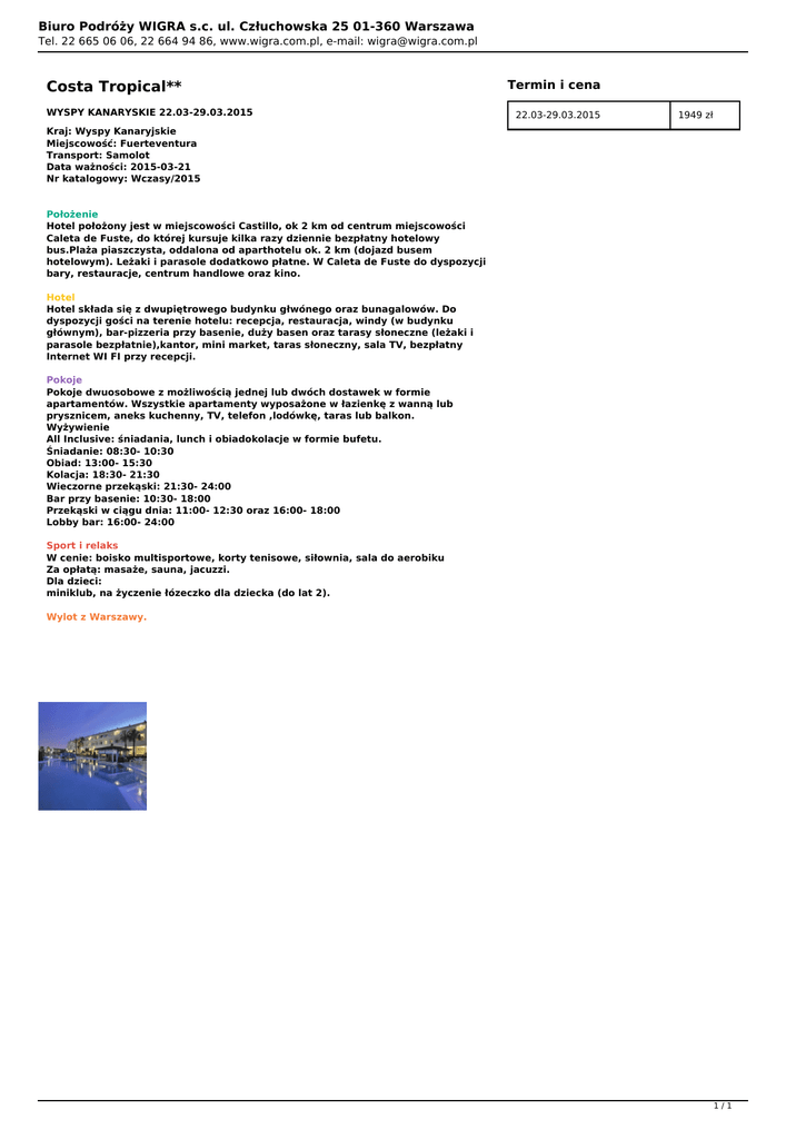 Biuro Podróży WIGRA s.c. ul. Człuchowska 25 01-360 Warszawa Tel. 22 665 06 06, 22 664 94 86, www.wigra.com.pl, e-mail: [email protected] Costa Tropical** WYSPY KANARYSKIE 22.03-29.03.2015 Termin i cena 22.03-29.03.2015 1949 zł Kraj: Wyspy Kanaryjskie Miejscowość: Fuerteventura Transport: Samolot Data ważności: 2015-03-21 Nr katalogowy: Wczasy/2015 Położenie Hotel położony jest w miejscowości Castillo, ok 2 km od centrum miejscowości Caleta de Fuste, do której kursuje kilka razy dziennie bezpłatny hotelowy bus.Plaża piaszczysta, oddalona od aparthotelu ok. 2 km (dojazd busem hotelowym). Leżaki i parasole dodatkowo płatne. W Caleta de Fuste do dyspozycji bary, restauracje, centrum handlowe oraz kino. Hotel Hotel składa się z dwupiętrowego budynku głwónego oraz bunagalowów. Do dyspozycji gości na terenie hotelu: recepcja, restauracja, windy (w budynku głównym), bar-pizzeria przy basenie, duży basen oraz tarasy słoneczne (leżaki i parasole bezpłatnie),kantor, mini market, taras słoneczny, sala TV, bezpłatny Internet WI FI przy recepcji. Pokoje Pokoje dwuosobowe z możliwością jednej lub dwóch dostawek w formie apartamentów. Wszystkie apartamenty wyposażone w łazienkę z wanną lub prysznicem, aneks kuchenny, TV, telefon ,lodówkę, taras lub balkon. Wyżywienie All Inclusive: śniadania, lunch i obiadokolacje w formie bufetu. Śniadanie: 08:30- 10:30 Obiad: 13:00- 15:30 Kolacja: 18:30- 21:30 Wieczorne przekąski: 21:30- 24:00 Bar przy basenie: 10:30- 18:00 Przekąski w ciągu dnia: 11:00- 12:30 oraz 16:00- 18:00 Lobby bar: 16:00- 24:00 Sport i relaks W cenie: boisko multisportowe, korty tenisowe, siłownia, sala do aerobiku Za opłatą: masaże, sauna, jacuzzi. Dla dzieci: miniklub, na życzenie łózeczko dla dziecka (do lat 2). Wylot z Warszawy. 1/1 Powered by TCPDF (www.tcpdf.org)