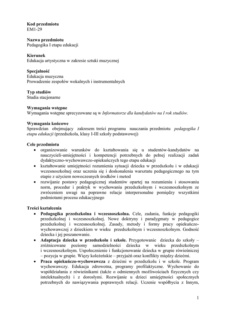 Kod przedmiotu EM1-29 Nazwa przedmiotu Pedagogika I etapu edukacji Kierunek Edukacja artystyczna w zakresie sztuki muzycznej Specjalność Edukacja muzyczna Prowadzenie zespołów wokalnych i instrumentalnych Typ studiów Studia stacjonarne Wymagania wstępne Wymagania wstępne sprecyzowane są w Informatorze dla kandydatów na I rok studiów. Wymagania końcowe Sprawdzian obejmujący zakresem treści programu nauczania przedmiotu pedagogika I etapu edukacji (przedszkola, klasy I-III szkoły podstawowej) Cele przedmiotu organizowanie warunków do kształtowania się u studentów-kandydatów na nauczycieli-umiejętności i kompetencji potrzebnych do pełnej realizacji zadań dydaktyczno-wychowawczo-opiekuńczych tego etapu edukacji kształtowanie umiejętności rozumienia sytuacji dziecka w przedszkolu i w edukacji wczesnoszkolnej oraz uczenia się i doskonalenia warsztatu pedagogicznego na tym etapie z użyciem nowoczesnych środków i metod rozwijanie postawy pedagogicznej studentów opartej na rozumieniu i stosowaniu norm, procedur i praktyk w wychowaniu przedszkolnym i wczesnoszkolnym ze zwróceniem uwagi na poprawne relacje interpersonalne pomiędzy wszystkimi podmiotami procesu edukacyjnego Treści kształcenia Pedagogika przedszkolna i wczesnoszkolna. Cele, zadania, funkcje pedagogiki przedszkolnej i wczesnoszkolnej. Nowe doktryny i paradygmaty w pedagogice przedszkolnej i wczesnoszkolnej. Zasady, metody i formy pracy opiekuńczowychowawczej z dzieckiem w wieku przedszkolnym i wczesnoszkolnym. Godność dziecka i jej poszanowanie. Adaptacja dziecka w przedszkolu i szkole. Przygotowanie dziecka do szkoły – zróżnicowane poziomy samodzielności dziecka w wieku przedszkolnym i wczesnoszkolnym. Uspołecznienie i funkcjonowanie dziecka w grupie rówieśniczej – pozycja w grupie. Więzy koleżeńskie – przyjaźń oraz konflikty między dziećmi. Praca opiekuńczo-wychowawcza z dziećmi w przedszkolu i w szkole. Program wychowawczy. Edukacja zdrowotna, programy profilaktyczne. Wychowanie do współdziałania z rówieśnikami (także o odmiennych możliwościach fizycznych czy intelektualnych) i z dorosłymi. Rozwijanie u dzieci umiejętności społecznych potrzebnych do nawiązywania poprawnych relacji. Uczenie współbycia z Innym, 1 integracja. Kształtowanie umiejętności samoobsługowych, nawyków higienicznych i kulturalnych. Kształtowanie odporności emocjonalnej. Dojrzałość szkolna. Pojęcie – składniki – diagnozowanie. Kontrowersje wokół problemu. Bezpieczeństwo dzieci w przedszkolu, szkole, poza terenem placówek edukacyjnych. Ochrona zdrowia dziecka i edukacja dla bezpieczeństwa własnego oraz innych. Współpraca szkoły ze środowiskiem i nauczyciela z rodzicami uczniów. Dziecko XXI wieku – odmienność epoki – akceleracja przemian – przejawy i rezultaty. Zamierzone efekty kształcenia Po ukończeniu 30h cyklu nauczania przedmiotu edukacja przedszkolna i I etap edukacyjny (klasy I-III szkoły podstawowej) w semestrze letnim I roku studiów I stopnia studenci powinni: w zakresie wiedzy EM_W12 – posiadać podstawową wiedzę o funkcjonowaniu dziecka w różnych środowiskach wychowawczych, rozumieć specyfikę pracy z dziećmi w przedszkolu i szkole podstawowej, – znać subdyscypliny pedagogiki związane z różnymi etapami rozwoju dziecka, – mieć elementarną wiedzę o metodyce realizacji zadań typowych – o normach, procedurach i dobrych praktykach stosowanych w edukacji przedszkolnej i wczesnoszkolnej, – znać zasady bezpieczeństwie i higieny pracy w przedszkolu i w edukacji wczesnoszkolnej w odniesieniu do wszystkich uczestników procesu edukacyjnego; w zakresie umiejętności – potrafić samodzielnie poszukiwać wiedzy z różnych źródeł i aktywnie rozwijać swe umiejętności pedagogiczne – umieć obserwować a następnie diagnozować sytuację i problemy dziecka w danym momencie jego funkcjonowania w przedszkolu i szkole, potrafi sformułować wnioski i propozycje działań wychowawczych, EM_U20 - potrafić dobrać i wykorzystać dostępne rozwiązania, metody i środki dla efektywnego realizowania zadań i rozwiązywania problemów; w zakresie kompetencji społecznych EM_K01 – wykazywać potrzebę uczenia się przez całe życie – mieć świadomość konieczności i być wstępnie przygotowanym do prowadzenia indywidualizowanych działań dydaktyczno-wychowawczo-opiekuńczych, w tym wobec uczniów ze specjalnymi potrzebami edukacyjnymi, EM_K09 - być świadomymi etycznego wymiaru diagnozowania i oceniania uczniów, pracy pedagogicznej własnej i innych, – odpowiedzialnie przygotowywać się do swojej pracy, projektować i realizować zadania dydaktyczno-wychowawcze i opiekuńcze. Formy kształcenia Wykład zbiorowy Nakład pracy studenta niezbędny do osiągnięcia zamierzonych efektów kształcenia Rok I II III Semestr 1 2 3 4 5 6 Punkty ECTS 2 Liczba godzin 2 w tygodniu Rodzaj zaliczenia s Legenda s – zaliczenie ze stopniem 2 Kryteria oceny 1.Obecność na zajęciach; 2. Poziom przygotowania do zajęć, podejmowanie zadań indywidualnych; 3.Pozytywne oceny ze sprawdzianów-kartkówek. Literatura* /fragmenty/: 1. Klus-Stańska, D., (red.), Szczepska, M., (red.), Pedagogika wczesnoszkolna – dyskursy-problemy-rozwiązania, Wyd. ŁośGraf, 2011. 2. Kwiatowska, M., (red), Podstawy pedagogiki przedszkolnej, WSiP ,W-wa 1985. 3. Janowski, A., Poznawanie uczniów. Zdobywanie informacji w pracy wychowawczej. Wyd. Fraszka Edukacyjna, 2002. 4. Kossowski, P., Dziecko i reklama telewizyjna, Wyd.Akad.”Żak” W-wa 1999. 5. Kwieciński, Z.,/Red./ Zagrożenia, możliwości i potrzeby wspomagania rozwoju. Toruń 1985. 6. Lubomirska,K., Przedszkole - rzeczywistość i szansa, Wyd.”Żak”, W-wa 1997. 7. Łaciak, B., Świat społeczny dziecka. Wyd. Akademickie ‘Żak’, W-wa 1998. 8. Pankowska, D., Badanie ukrytego programu szkoły w pracy nauczyciela – refleksyjnego praktyka. „Przegląd Badań Edukacyjnych”, 2006, nr 2