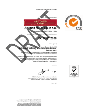 Tłumaczenie certyfikatu HU11/5965 System zarządzania funkcjonujący w Artimed NZOZ Sp. z o.o. ul. Paderewskiego 4b, 25-017 Kielce, Polska został oceniony i certyfikowany jako spełniający wymagania zawarte w ISO 9001:2008 Zakres rejestracji Świadczenie usług medycznych w zakresie ambulatoryjnej opieki specjalistycznej, rehabilitacji, podstawowej opieki zdrowotnej, medycyny pracy. W celu uzyskania dalszych wyjaśnień dotyczących zakresu certyfikacji i zastosowania wymogów normy ISO 9001:2008 proszę skontaktować się z Organizacją Certyfikat ważny od 1 sierpnia 2011 do 31 lipca 2014 oraz pozostaje ważny z zastrzeżeniem uzyskiwania pozytywnych wyników auditów nadzoru. Audit recertyfikacyjny należy przeprowadzić przed 23 lipca 2014 Wydanie 1. Certyfikowany od 1 sierpnia 2011 Autoryzacja SGS United Kingdom Ltd□Systems & Services Certification Rossmore Business Park□Ellesmere Port□Cheshire□CH65 3EN□UK t +44 (0)151 350-6666□f +44 (0)151 350-6600□www.sgs.com Strona 1 z 1 Niniejszy dokument został wydany przez Firmę zgodnie z jej Ogólnymi Warunkami Certyfikacji dostępnymi na www.sgs.com/terms_and_conditions.htm. Należy zwrócić uwagę na ograniczenia odpowiedzialności, kwestie dotyczące odszkodowania oraz jurysdykcji, w nich określone. Autentyczność niniejszego dokumentu można zweryfikować na http://www.sgs.com/clients/certified_clients.htm. Wszelkie nieautoryzowane zmiany, fałszowanie, podrabianie treści lub formy niniejszego dokumentu jest niezgodne z prawem, a sprawcy będą ścigani w najszerszym zakresie prawa.