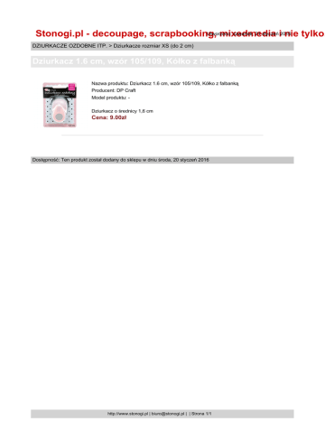 Utworzono: czwartek, 21 styczeń i2016 Stonogi.pl - decoupage, scrapbooking, mixedmedia nie tylko. DZIURKACZE OZDOBNE ITP. > Dziurkacze rozmiar XS (do 2 cm) Dziurkacz 1.6 cm, wzór 105/109, Kółko z falbanką Nazwa produktu: Dziurkacz 1.6 cm, wzór 105/109, Kółko z falbanką Producent: DP Craft Model produktu: Dziurkacz o średnicy 1,6 cm Cena: 9.00zł Dostępność: Ten produkt został dodany do sklepu w dniu środa, 20 styczeń 2016 http://www.stonogi.pl | [email protected] | | Strona 1/1
