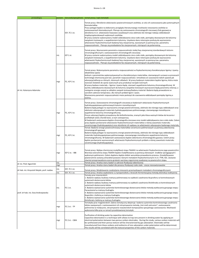 Strona 1 z 18 prowadzący poziom kierunek/specjalność temat pracy / opis tematyki ICP, TC 1 st. inż. mgr ICP 1 st. TC, ICP 2 st. dr inż. Katarzyna Adamska dr inż. Piotr Agaciński dr hab. inż. Krzysztof Alejski, prof. nadzw. mgr TC, ICP 2 st. mgr TC, ICP 2 st. mgr ICP 2 st. - IBB inż. mgr inż. ICP, TC 1 st. inż. ICP, TC 1 st. inż. TC 1 st. mgr TC 2 st. - TP prof. dr hab. inż. Ewa Andrzejewska mgr TC 2 st. - C&N Temat pracy: Określenie właściwości powierzchniowych zeolitów, w celu ich zastosowania jako potencjalnych biomateriałów Praca polegać będzie na dokonaniu przeglądu literaturowego możliwości stosowania zeolitów w zastosowaniach biomedycznych. Planuje się zastosowanie chromatografii cieczowej i/lub gazowej w określenia m.in. właściwości kwasowo-zasadowych oraz zdolności do różnego rodzaju oddziaływań międzycząsteczkowych wybranych zeolitów. W pracy zostanie wykorzystany model oddziaływania ciecz-ciało stałe, pomiędzy dozowanymi do kolumny związkami testowymi, a wypełnieniem kolumny. Uzyskane dane retencyjne posłużą do wyznaczenia właściwości fizykochemicznych badanej fazy stacjonarnej, wyrażanych za pomocą tzw. parametru rozpuszczalności. Planuje się przebadanie faz stacjonarnych, różniących się polarnością. Temat pracy: Wyznaczanie parametru rozpuszczalności stałej fazy stacjonarnej standardowych kolumn chromatograficznych z zastosowaniem chromatografii cieczowej W pracy zostanie wykorzystany model oddziaływania ciecz-ciało stałe, pomiędzy dozowanymi do kolumny związkami testowymi, a wypełnieniem kolumny. Uzyskane dane retencyjne posłużą do wyznaczenia właściwości fizykochemicznych badanej fazy stacjonarnej, wyrażanych za pomocą tzw. parametru rozpuszczalności. Planuje się przebadanie faz stacjonarnych, różniących się polarnością. Temat pracy: Wykorzystanie parametru rozpuszczalności w fizykochemicznej charakterystyce ligniny i żywicy składników spoiw Jednym z parametrów wykorzystywanych w charakterystyce materiałów, stanowiących surowce w procesach technologii chemicznej jest tzw. parametr rozpuszczalności. Umożliwia on szacowanie takich zjawisk jak adsorpcja/adhezja w różnych, złożonych układach. W pracy badanym materiałem będzie lignina, która może stanowić dodatek do spoiw żywicznych przy produkcji narzędzi ściernych. W pracy badane materiały – lignina i żywica będą stanowić wypełnienie kolumny chromatograficznej. W wyniku oddziaływania dozowanych do kolumny związków testowych wyznaczone będą parametry retencji, a następnie energia sorpcji w układzie związek testowy/badany materiał. Badania będą prowadzone w szerokim zakresie temperatur, dla różnych próbek lignin i żywic. Wyznaczony parametr rozpuszczalności może posłużyć do szacowania oddziaływań pomiędzy ligniną a żywicą. Temat pracy: Zastosowanie chromatografii cieczowej w badaniach właściwości fizykochemicznych hydroksyapatytowo-polimerowych kolumn monolitycznych Badania będą polegać na wyznaczeniu energii powierzchniowej, zdolności do różnego typu oddziaływań oraz zdolności adsorpcyjnych materiału hydroksyapatytowo-polimerowego, stanowiącego monolityczne wypełnienie kolumny chromatograficznej. Proces adsorpcji będzie prowadzony dla bisfosfonianów, znanych jako klasa ważnych leków do leczenia i profilaktyki wielu chorób kości, w tym osteoporozy. W badaniach zastosowana będzie chromatografia cieczowa oraz model oddziaływania ciecz-ciało stałe. Celem pracy będzie porównanie właściwości fizykochemicznych materiałów o różnej zawartości materiału ceramicznego (hydroksyapatytu) oraz określenie ich wpływu na właściwości adsorpcyjne badanego materiału. Temat: Badanie energii powierzchniowej materiałów ceramiczno-polimerowych za pomocą odwróconej chromatografii gazowej Badania będą polegać na wyznaczeniu energii powierzchniowej, zdolności do różnego typu oddziaływań materiału hydroksyapatytowo-polimerowego, stanowiącego monolityczne wypełnienie kolumny chromatograficznej. W badaniach zastosowana będzie odwrócona chromatografia gazowa. Celem pracy będzie porównanie wyznaczonych właściwości fizykochemicznych próbek o różnej zawartości materiału ceramicznego (hydroksyapatytu). Temat pracy: Wpływ chemicznej modyfikacji stopu Ti6Al4V na właściwości fizykochemiczne jego powierzchni. Warstwa wierzchnia stopu Ti6Al4V będzie modyfikowana za pomocą silanowych środków sprzęgających i wybranym polimerem. Celem dyplomu będzie dobór warunków prowadzenia procesu. Zmodyfikowane powierzchnie zostaną scharakteryzowane różnymi metodami fizykochemicznymi m.in. FTIR, IGC. Zostanie również przeprowadzona ocena grubości warstwy organicznej osadzonej na powierzchni stopu. Temat pracy: Analiza stanu badań w zakresie fluidyzacji odwróconej Temat pracy: Analiza stanu badań dla procesu fluidyzacji ciało stałe - ciecze nienewtonowskie Temat pracy: Modelowanie rozdzielania mieszanin przemysłowymi metodami chromatograficznymi Temat pracy: Analiza wydzielania 1,3-propanodiolu z brzeczki fermentacyjnej metodą ekstrakcji reaktywnej Tematy prac inżynierskich: 1. Badanie wpływu budowy matrycy polimerowej na szybkość uwalniania Ibuprofenu w kontrolowanych systemach dostarczania leków 2. Badanie wpływu budowy matrycy polimerowej na szybkość uwalniania Diclofenaku w kontrolowanych systemach dostarczania leków 3. Badania wytwarzania systemów kontrolowanego dostarczania leków metodą wytłaczania gorącego stopu: Paracetamol w matrycy Eudragitu 4. Badania wytwarzania systemów kontrolowanego dostarczania leków metodą wytłaczania gorącego stopu: Ibuprofen z kofeiną w matrycy Eudragitu 5. Badania wytwarzania systemów kontrolowanego dostarczania leków metodą wytłaczania gorącego stopu: Diclofenak z kofeiną w matrycy Eudragitu Tematyka prac magisterskich: Zakres tematyczny obejmuje badania systemów kontrolowanego uwalniania