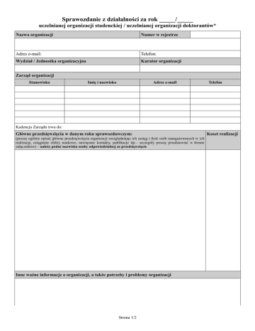 Sprawozdanie z działalności za rok _____/_____ uczelnianej organizacji studenckiej / uczelnianej organizacji doktorantów* Nazwa organizacji Numer w rejestrze Adres e-mail: Telefon: Wydział / Jednostka organizacyjna Kurator organizacji Zarząd organizacji Stanowisko Imię i nazwisko Adres e-mail Telefon Kadencja Zarządu trwa do: Główne przedsięwzięcia w danym roku sprawozdawczym: (proszę ogólnie opisać główne przedsięwzięcia organizacji uwzględniając ich zasięg i ilość osób zaangażowanych w ich realizację, osiągnięte efekty naukowe, nawiązane kontakty, publikacje itp.– szczegóły proszę przedstawiać w formie załączników) – należy podać nazwisko osoby odpowiedzialnej za przedsięwzięcie Inne ważne informacje o organizacji, a także potrzeby i problemy organizacji Strona 1/2 Koszt realizacji Aktualna lista członków organizacji (jeśli liczba członków przekracza 40 należy załączyć dodatkową kartę) Lp. Imię Nazwisko Wydział/Jednostka Rok studiów Nr albumu Podpis 1 2 3 4 5 6 7 8 9 10 11 12 13 14 15 16 17 18 19 20 21 22 23 24 25 26 27 28 29 30 31 32 33 34 35 36 37 38 39 40 podpis reprezentanta organizacji podpis kuratora Strona 2/2 podpis prodziekana ds. studenckich