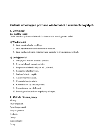 Zadania utrwalające poznane wiadomości o ułamkach zwykłych 1. Cele lekcji Cel ogólny lekcji: Umieć stosować poznane wiadomości o ułamkach do rozwiązywania zadań. a) Wiadomości 1. Znać pojęcie ułamka zwykłego. 2. Znać pojęcie rozszerzania i skracania ułamków. 3. Znać reguły dodawania i odejmowania ułamków o równych mianownikach. b) Umiejętności 1. Odczytywać wartość ułamka z rysunku. 2. Rysować ułamek o danej wartości. 3. Rozpoznawać ułamki większe od 1, równe 1. 4. Rozszerzać ułamki zwykłe. 5. Dodawać ułamki zwykłe. 6. Analizować treści zadań. 7. Uzasadniać swoje zdanie. 8. Komunikować się z nauczycielem. 9. Komunikować się z kolegami. 10. Rozwiązywać zadania we współpracy z innymi. 2. Metoda i forma pracy Metody: Pracy z tekstem. Pytań i odpowiedzi. Pracy w grupach. Dyskusji. Dramy. Burzy mózgów. Formy: Zbiorowa. Grupowa. Indywidualna. 3. Środki dydaktyczne 1. Zestawy zadań – „Opowiadanie o pięknej księżniczce Algebrze”. 2. Karta oceny pracy ucznia. 4. Przebieg lekcji 1. Powitanie, sprawy organizacyjne. 2. Powtórzenie wiadomości – pytania i odpowiedzi. 3. Wprowadzenie do tematu – przypomnienie zasad pracy. 4. Rozwinięcie tematu: Omówienie zasad pierwszej zabawy: - nauczyciel rozdaje przygotowane zestawy zadań (zał. nr1) oraz karty oceny pracy ucznia (zał. nr2) - uczniowie rozwiązują zadania parami, a następnie na tablicy - uczniowie samodzielnie wpisują punkty do karty oceny pracy - uczniowie sami się oceniają zgodnie z podanymi kryteriami. 5. Podsumowanie i ocena uczniów. 6. Ewaluacja: dzieci opowiadają swoje wrażenia z lekcji. 7. Omówienie pracy domowej. 1. Bibliografia 1. Brudnik E., Moszyńska A., Owczarska B., Ja i mój uczeń pracujemy aktywnie, zakład wydawniczy SFS, Kielce 2000. 2. Jeleński Sz., Śladami Pitagorasa, wydawnictwo PZWS, Warszawa 1961. 6. Załączniki a) Karta pracy ucznia ZAŁĄCZNIK NR 1 Opowiadanie o mądrej księżniczce Algebrze i dzielnym rycerzu herbu Czwarta Klasa. Dawno, dawno temu w przepięknej krainie zwanej Matematyka żyła mądra i śliczna księżniczka Algebra. Niestety złe trolle uwięziły ją w głębi starego Zamczyska . Rozesłano wici na wszystkie strony Świata. Nagrodą za uwolnienie księżniczki miała być jej najpiękniejsza dwórka – SZÓSTKA. Tego zadania podjął się dzielny rycerz, Uczeń herbu Czwarta Klasa. 1. Aby wejść do zamku Uczeń musiał znaleźć szyfr do bramy. W tym celu należy wybrać wszystkie liczby równe liczbie w środku. 1 3 2 2 4 1 3 5 1 6 6 1 8 4 8 7 7 2. Żeby przejść przez pierwszą salę rycerz musi wskazać flagę krainy MATEMATYKA wiedząc, że jedna trzecia flagi jest biała, a dwie trzecie czerwone. I II IV V III VI 3. Rycerz Uczeń jest w wielkiej sali. Na posadzce znajduje się gwiazda o ośmiu ramionach skierowanych na osiem drzwi. Tylko jednymi drzwiami można przejść bezpiecznie, pozostałe prowadzą do jaskini smoka o siedmiu głowach. Drzwi właściwe oznaczone są ułamkiem większym od 1. Należy wskazać ten ułamek i narysować go. 7 9 4 3 3 4 2 7 1 2 1 3 4 4 6 7 4. Rycerz jest w ogromnej komnacie, w której są cztery drzwi oznaczone literami: K, D, M, Z . Za trzema z nich znajdują się zapadnie. Tylko jedne prowadzą do księżniczki. Które z nich? Dojść do nich można, przechodząc od ułamka do ułamka w ten sposób, że każdy następny rozszerzamy dwa razy. Pierwszym ułamkiem jest jedna druga. M K 16 32 4 5 4 8 2 4 8 16 1 8 1 2 D 6 12 Z 2 6 5. Już tylko ostatnia sala, a w niej strome schody dzielą rycerza od ALGEBRY. Jak wspiąć się po schodach ? Należy dodać ułamki zapisane na stopniach schodów. 1 1 18 4 18 1 18 3 18 ZWYCIĘSTWO !!! Rycerz Uczeń doszedł do ALGEBRY. Jeszcze tylko musi pokonać złe trolle i piękna SZÓSTKA jest Jego. Trolle ulegną Rycerzowi, jeżeli ten odkryje ich tajemnicę. Trolle bardzo lubią słodycze. Jeden zjada 1/2 tortu orzechowego i 1/4 tortu migdałowego na śniadanie, 1 1/2 tortu orzechowego i 2 torty migdałowe na obiad oraz 3/4 tortu waniliowego na kolację. Tajemnicą trolli jest ile tortów dziennie zjada każdy z nich ? ZAŁĄCZNIK NR 2 KARTA OCENY PRACY UCZNIA: L.p. Uczeń: (umiejętności) Ilość punktów Ilość punktów max. osiągnięta Dodatkowe punkty 1. Zna pojęcie ułamka zwykłego. 3 (równego 1) 2. Wybiera rysunek przedstawiający 3 dany ułamek. 3. Zna pojęcie ułamka większego 4 od 1. Rysuje ułamek. 4. Rozszerza ułamki. 4 5. Dodaje ułamki o takim samym mianowniku. 4 6* Dodaje ułamki o różnych mianownikach. Ocena uczniów odbywa się w oparciu o kartę oceny pracy ucznia. Propozycje norm oceny: 18pkt + zad. dodatkowe – jesteś najlepszy z ułamków zwykłych; 18pkt -17pkt – jesteś bardzo dobry; 16pkt -14pkt – jest dobrze – „ale” ; 13pkt -10pkt – jest dostatecznie – mogło być lepiej; 9pkt - 5pkt – dopuszczająco – od jutra się poprawisz; 4pkt - 0pkt – niedostatecznie – co teraz zrobię? b) Zadanie domowe „Sprawdź czy umiesz” z działu ułamki zwykłe. 7. Czas trwania lekcji 45 minut. 8. Uwagi do scenariusza Brak.