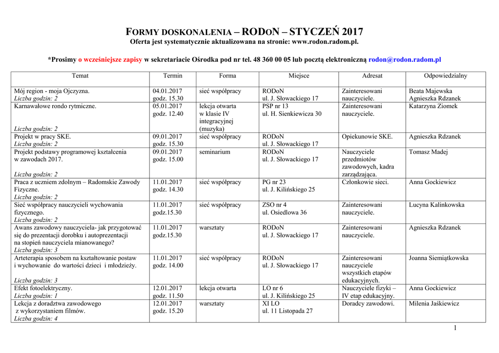 FORMY DOSKONALENIA – RODON – STYCZEŃ 2017 Oferta jest systematycznie aktualizowana na stronie: www.rodon.radom.pl. *Prosimy o wcześniejsze zapisy w sekretariacie Ośrodka pod nr tel. 48 360 00 05 lub pocztą elektroniczną [email protected] Temat Mój region - moja Ojczyzna. Liczba godzin: 2 Karnawałowe rondo rytmiczne. Liczba godzin: 2 Projekt w pracy SKE. Liczba godzin: 2 Projekt podstawy programowej kształcenia w zawodach 2017. Liczba godzin: 2 Praca z uczniem zdolnym – Radomskie Zawody Fizyczne. Liczba godzin: 2 Sieć współpracy nauczycieli wychowania fizycznego. Liczba godzin: 2 Awans zawodowy nauczyciela- jak przygotować się do prezentacji dorobku i autoprezentacji na stopień nauczyciela mianowanego? Liczba godzin: 3 Arteterapia sposobem na kształtowanie postaw i wychowanie do wartości dzieci i młodzieży. Liczba godzin: 3 Efekt fotoelektryczny. Liczba godzin: 1 Lekcja z doradztwa zawodowego z wykorzystaniem filmów. Liczba godzin: 4 Termin 04.01.2017 godz. 15.30 05.01.2017 godz. 12.40 09.01.2017 godz. 15.30 09.01.2017 godz. 15.00 Forma sieć współpracy lekcja otwarta w klasie IV integracyjnej (muzyka) sieć współpracy seminarium Miejsce Adresat Odpowiedzialny RODoN ul. J. Słowackiego 17 PSP nr 13 ul. H. Sienkiewicza 30 Zainteresowani nauczyciele. Zainteresowani nauczyciele. Beata Majewska Agnieszka Rdzanek Katarzyna Ziomek RODoN ul. J. Słowackiego 17 RODoN ul. J. Słowackiego 17 Opiekunowie SKE. Agnieszka Rdzanek Nauczyciele przedmiotów zawodowych, kadra zarządzająca. Członkowie sieci. Tomasz Madej 11.01.2017 godz. 14.30 sieć współpracy PG nr 23 ul. J. Kilińskiego 25 11.01.2017 godz.15.30 sieć współpracy ZSO nr 4 ul. Osiedlowa 36 Zainteresowani nauczyciele. Lucyna Kalinkowska 11.01.2017 godz.15.30 warsztaty RODoN ul. J. Słowackiego 17 Zainteresowani nauczyciele. Agnieszka Rdzanek 11.01.2017 godz. 14.00 sieć współpracy RODoN ul. J. Słowackiego 17 Joanna Siemiątkowska 12.01.2017 godz. 11.50 12.01.2017 godz. 15.20 lekcja otwarta LO nr 6 ul. J. Kilińskiego 25 XI LO ul. 11 Listopada 27 Zainteresowani nauczyciele wszystkich etapów edukacyjnych. Nauczyciele fizyki – IV etap edukacyjny. Doradcy zawodowi. warsztaty Anna Gockiewicz Anna Gockiewicz Milenia Jaśkiewicz 1 Radomskie Zawody Geograficzne „Z mapą dookoła świata.” Propozycja zadań na etap II finałowy. Liczba godzin: 3 Metody aktywizujące w pracy z Pismem Św. Liczba godzin: 2 Projekt klasyfikacji zawodów szkolnictwa zawodowego 2017. Liczba godzin: 2 Igrzyska matematyczne dla przedszkolaków (opracowanie zadań konkursowych). Liczba godzin: 4 Edukacja kulturalna. Liczba godzin: 4 Doskonalenie podań i chwytów piłki. Nauka rzutu z wyskoku. (Piłka ręczna). Liczba godzin: 2 Wzajemne położenie prostych i odcinków. Liczba godzin: 2 Metody aktywizujące w edukacji przedszkolnej i wczesnoszkolnej z użyciem języka angielskiego. Liczba godzin: 2 Nowa podstawa programowa z fizyki w 8-letniej szkole podstawowej. Liczba godzin: 3 Praca na katechezie z wykorzystaniem metod aktywizujących. Liczba godzin: 5 Kształcenie w formach pozaszkolnych w perspektywie reformy systemu oświaty. Liczba godzin: 2 12.01.2017 godz. 15.00 zespół zadaniowy PG nr 23 ul. J. Kilińskiego 25 Zespół zadaniowy. Beata Majewska 13.01.2017 godz. 16.15 sieć współpracy Wydział Katechetyczny ul. J. Malczewskiego 1 Nauczyciele religii. Ewa Majcher 16.01.2017 godz. 15.00 seminarium RODoN ul. J. Słowackiego 17 Tomasz Madej 16.01.2017 godz. 12.00 sieć współpracy PP nr 1 ul. J. Zientarskiego 3 Nauczyciele przedmiotów zawodowych, kadra zarządzająca. Zainteresowani nauczyciele. 16.01.2017 godz. 13.00 sieć współpracy RODoN ul. J. Słowackiego 17 Joanna Siemiątkowska 17.01.2017 godz. 11.50 lekcja otwarta ZSO nr 4 ul. Osiedlowa 36 Zainteresowani nauczyciele wszystkich etapów edukacyjnych. Nauczyciele wychowania fizycznego. 19.01.2017 godz. 12.40 lekcja otwarta (w ramach matematycznej szkoły ćwiczeń) warsztaty PSP nr 13 ul. H. Sienkiewicza 30 sala 105 Zainteresowani nauczyciele. Agnieszka Stępień RODoN ul. J. Słowackiego 17 Zainteresowani nauczyciele. Edyta Bracik 20.01.2017 godz. 14.30 warsztaty PG nr 23 ul. J. Kilińskiego 25 Nauczyciele fizyki. Anna Gockiewicz 20.01.2017 godz. 16.15 warsztaty Wydział Katechetyczny ul. J. Malczewskiego 1 Nauczyciele religii. Ewa Majcher 23.01.2017 godz. 15.00 seminarium RODoN ul. J. Słowackiego 17 Nauczyciele przedmiotów zawodowych, kadra zarządzająca. Tomasz Madej 20.01.2017 godz. 15.00 Danuta Chrzanowska Lucyna Kalinkowska 2 Bajkoterapia. Liczba godzin: 4 Dziecięce masażyki jako element negatywnych emocji dzieci młodszych. Liczba godzin: 3 Poetycki festiwal. Liczba godzin: 2 „Nie zawsze białe jest białe”, czyli dylematy dotyczące wartości ponadczasowych. Liczba godzin: 4 Edukacja dla potrzeb rynku pracy. Liczba godzin: 4 Zjawisko przemocy rówieśniczej. Liczba godzin: 3 Uczeń - aktywny uczestnik procesu uczenia się. Liczba godzin: 3 Angliści w sieci. Liczba godzin: 2 Metody aktywizujące w edukacji przedszkolnej i wczesnoszkolnej z użyciem języka angielskiego. Liczba godzin: 2 Rola i znaczenie pracodawców w nowej reformie szkolnictwa zawodowego. Liczba godzin: 2 Neurodydaktyka w szkole. Liczba godzin: 3 Konkurs Czytelniczy. Liczba godzin: 3 What would you do if …….? – gimnazjum students’ imaginary situations. Liczba godzin: 2 „Nie zawsze białe jest białe”, czyli dylematy dotyczące wartości ponadczasowych. Liczba godzin: 4 23.01.2017 godz. 17.00 warsztaty PSP nr 21, ul. Trojańska 5 Zainteresowani nauczyciele. Bożena Jankowska 23.01.2017 godz. 14.30 warsztaty PSP nr 13 ul. H. Sienkiewicza 30 Zainteresowani nauczyciele. Katarzyna Ziomek 25.01.2017 godz. 16.30 zajęcia otwarte Zainteresowani nauczyciele. Małgorzata Boruta 26.01.2017 godz. 16.00 warsztaty PSP nr 25 ul. Starokrakowska 124/128 PP nr 1 ul. J. Zientarskiego 3 Danuta Chrzanowska 26.01.2017 godz.15.20 26.01.2017 godz. 16.00 26.01.2017 godz. 14.00 warsztaty Naucz