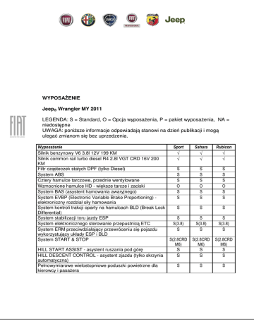 WYPOSAŻENIE Jeep® Wrangler MY 2011 LEGENDA: S = Standard, O = Opcja wyposażenia, P = pakiet wyposażenia, NA = niedostępne UWAGA: poniższe informacje odpowiadają stanowi na dzień publikacji i mogą ulegać zmianom się bez uprzedzenia. Wyposażenie Sport Silnik benzynowy V6 3.8l 12V 199 KM √ Silnik common rail turbo diesel R4 2.8l VGT CRD 16V 200 √ KM Filtr cząsteczek stałych DPF (tylko Diesel) S System ABS S Cztery hamulce tarczowe, przednie wentylowane S Wzmocnione hamulce HD - większe tarcze i zaciski O System BAS (asystent hamowania awaryjnego) S System EVBP (Electronic Variable Brake Proportioning) S elektroniczny rozdział siły hamowania System kontroli trakcji oparty na hamulcach BLD (Break Lock S Differential) System stabilizacji toru jazdy ESP S System elektronicznego sterowanie przepustnicą ETC S(3.8) System ERM przeciwdziałający przewróceniu się pojazdu S wykorzystujący układy ESP i BLD System START & STOP S(2.8CRD M6) HILL START ASSIST - asystent ruszania pod górę S HILL DESCENT CONTROL - asystent zjazdu (tylko skrzynia S automatyczna) Pełnowymiarowe wielostopniowe poduszki powietrzne dla S kierowcy i pasażera Sahara √ √ Rubicon √ √ S S S O S S S S S O S S S S S S(3.8) S S S(3.8) S S(2.8CRD M6) S S S(2.8CRD M6) S S S S Boczne fotelowe poduszki powietrzne O O O Bezpieczna kolumna kierownicy S S S Trzypunktowe pasy bezpieczeństwa z regulacją wysokości S S S Napinacze pasów bezpieczeństwa dla przednich foteli S S S Pałąk przeciwkapotażowy - system rur S S S Immobilizer silnika Sentry Key z kodowanym transponderem S S S w kluczyku Regulacja reflektorów w zależności od obciążenia S S S Wyposażenie Sport Sahara Rubicon Reflektory z automatycznym włączaniem NA S S Reflektory przeciwmgielne przednie S S S Lampa przeciwmgielna tylna S S S Trzecie światło stopu S S S Alternator 160 AMP S S S Akumulator 600 AMP bezobsługowy S S S Mosty Dana 30 przód / Dana 44 HD (Heavy Duty) tył S S NA Mosty Dana 44 HD (Heavy Duty) przód i tył NA NA S Przełożenie osi tylnej 3,21 (2.8CRD i 3.8 M6) S S NA Przełożenie osi tylnej 3,73 S(3.8 AUT) S(3.8 AUT) S(2.8CRD) Przełożenie osi tylnej 4,10 NA NA S(3.8) Skrzynia rozdzielcza Command-Trac z reduktorem o S S NA przełożeniu 2,72:1 Skrzynia rozdzielcza Rock-Trac z reduktorem o przełożeniu NA NA S 4,0:1 Elektromechaniczne blokady mechanizmów różnicowych NA NA S (przód i tył) Elektronicznie rozłączany stabilizator przedni P NA S Osłona skrzynki rozdzielczej i zbiornika paliwa (dodatkowo S S S miski olejowej - silnik 2.8 CRD) Boczne progi ochronne Rock Rails o zwiększonej NA NA S wytrzymałości, ze stali lakierowanej na czarno, mocowane do nadwozia Mata wygłuszająca maski silnika S S S Klimatyzacja manualna (niedostępna z 2.8CRD M6) O NA NA Klimatyzacja automatyczna (SPORT pakiet z 2.8CRD M6) O S S Regulator stałej prędkości S S S Kompas i wskaźnik temperatury zewnętrznej S S S Pakiet Elektryczny - centralny zamek sterowany pilotem, O S O elektrycznie otwierane szyby, elektrycznie regulowane i podgrzewane lusterka boczne (pakiet z 2.8CRD M6) Zamykany schowek z przodu S S S Konsola podłogowa z uchwytami na kubki, schowkiem i S S S podłokietnikiem Schowek pod podłogą bagażnika Pakiet Connectivity - system komunikacji bezprzewodowej uconnect phone, lusterko wsteczne z automatycznym ściemnianiem i wbudowanym mikrofonem, centrum informacji o pojeździe EVIC z wyświetlaczem, skórzane koło kierownicy (pakiet z 2.8CRD M6) Radio AM/FM DVD MP3 RDS Wyposażenie Radio 235 AM/FM DVD MP3 RDS zmieniacz na 6 CD System multimedialny 735N z nawigacją, 6,5" ekranem dotykowym i 30 GB dyskiem twardym 6 głośników System nagłośnienia Infinity - 6 głośników, subwoofer, wzmacniacz 368 watt Sterowanie radiem w kole kierownicy Skórzane koło kierownicy Wspomaganie kierownicy Regulowana kolumna kierownicy w pionie Materiałowe pokrycie foteli Skórzana tapicerka siedzeń, podgrzewane fotele przednie Regulacja wysokości fotela kierowcy Składana i demontowana kanapa z tyłu z zagłówkami Maty podłogowe przód Easy Acces - przsuwane fotele ze składanym oparciem z przodu dla łatwego dostępu do kanapy tylnej Popielniczka demontowana Zapalniczka, dodatkowe gniazdko 12V Gril przedni w kolorze nadwozia Nadkola w kolorze czarnym Nadkola lakierowane w kolorze nadwozia Zderzaki w kolorze czarnym - przód i tył Obręcze kół stalowe 16" x 7" Obręcze kół ze stopu aluminium 17" x 7,5" Obręcze kół ze stopu aluminium 18" x 7,5" Opony 245/75 R16 BSW ON/OFF ROAD Opony P245/75 R17 OWL ON/OFF ROAD Opony P255/70 R18 BSW ON/OFF ROAD Pełnowymiarowe koło zapasowe montowane na klapie bagażnika Pokrowiec koła zapasowego System monitorowania ciśnienia w oponach TPM S O S O S O S Sport O O S Sahara O O S Rubicon O O S NA NA S NA S S S S S S NA S S S S S S S S S O S S S S S S S S S NA S S S S S S S S NA S S O NA S O NA S S S S NA S S NA S O NA S O S S S S S NA S NA S NA NA S NA S S S S S S S ostrzegający o za niskim ciśnieniu powietrza w kołach Sunrider Soft Top - dach tkaninowy, składany i demontowany, otwierany dach słoneczny z przodu, drzwi połówkowe Pełne drzwi (SPORT/RUBICON pakiet z 2.8CRD M6) Czarny Freedom Top- trzy-częściowy Hard Top, dach z tworzywa, demontowany, podgrzewana szyba tylna z wycieraczką i spryskiwaczem, pełne drzwi Wyposażenie Lakierowany w kolorze nadwozia Freedom Top - trzyczęściowy Hard Top, dach z tworzywa, demontowany, podgrzewana szyba tylna z wycieraczką i spryskiwaczem, pełne drzwi Zestaw dachów Soft Top, Hard Top, pełne drzwi Ciemne szyby w części tylnej Stopnie boczne Pakiet Europool 4 - pełne drzwi, boczne fotelowe poduszki powietrzne, wzmocnione hamulce HD, 17"x7,5" aluminiowe obręcze kół (opony P245/75R17), pakiet Elektryczny Pakiet Europool 6 - pełne drzwi, boczne fotelowe poduszki powietrzne, wzmocnione hamulce HD, 17"x7,5" aluminiowe obręcze kół (opony P245/75R17), pakiet Elektryczny, pakiet Connectivity Pakiet Europool 8 - - ci