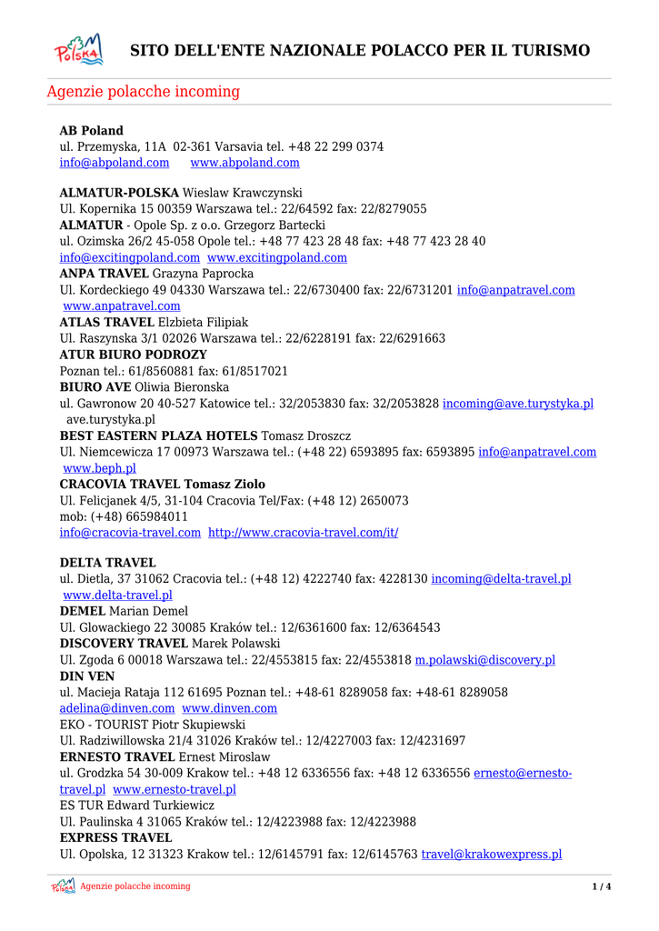 SITO DELL'ENTE NAZIONALE POLACCO PER IL TURISMO Agenzie polacche incoming AB Poland ul. Przemyska, 11A 02-361 Varsavia tel. +48 22 299 0374 [email protected] www.abpoland.com ALMATUR-POLSKA Wieslaw Krawczynski Ul. Kopernika 15 00359 Warszawa tel.: 22/64592 fax: 22/8279055 ALMATUR - Opole Sp. z o.o. Grzegorz Bartecki ul. Ozimska 26/2 45-058 Opole tel.: +48 77 423 28 48 fax: +48 77 423 28 40 [email protected] www.excitingpoland.com ANPA TRAVEL Grazyna Paprocka Ul. Kordeckiego 49 04330 Warszawa tel.: 22/6730400 fax: 22/6731201 [email protected] www.anpatravel.com ATLAS TRAVEL Elzbieta Filipiak Ul. Raszynska 3/1 02026 Warszawa tel.: 22/6228191 fax: 22/6291663 ATUR BIURO PODROZY Poznan tel.: 61/8560881 fax: 61/8517021 BIURO AVE Oliwia Bieronska ul. Gawronow 20 40-527 Katowice tel.: 32/2053830 fax: 32/2053828 [email protected] ave.turystyka.pl BEST EASTERN PLAZA HOTELS Tomasz Droszcz Ul. Niemcewicza 17 00973 Warszawa tel.: (+48 22) 6593895 fax: 6593895 [email protected] www.beph.pl CRACOVIA TRAVEL Tomasz Ziolo Ul. Felicjanek 4/5, 31-104 Cracovia Tel/Fax: (+48 12) 2650073 mob: (+48) 665984011 [email protected] http://www.cracovia-travel.com/it/ DELTA TRAVEL ul. Dietla, 37 31062 Cracovia tel.: (+48 12) 4222740 fax: 4228130 [email protected] www.delta-travel.pl DEMEL Marian Demel Ul. Glowackiego 22 30085 Kraków tel.: 12/6361600 fax: 12/6364543 DISCOVERY TRAVEL Marek Polawski Ul. Zgoda 6 00018 Warszawa tel.: 22/4553815 fax: 22/4553818 [email protected] DIN VEN ul. Macieja Rataja 112 61695 Poznan tel.: +48-61 8289058 fax: +48-61 8289058 [email protected] www.dinven.com EKO - TOURIST Piotr Skupiewski Ul. Radziwillowska 21/4 31026 Kraków tel.: 12/4227003 fax: 12/4231697 ERNESTO TRAVEL Ernest Miroslaw ul. Grodzka 54 30-009 Krakow tel.: +48 12 6336556 fax: +48 12 6336556 [email protected] www.ernesto-travel.pl ES TUR Edward Turkiewicz Ul. Paulinska 4 31065 Kraków tel.: 12/4223988 fax: 12/4223988 EXPRESS TRAVEL Ul. Opolska, 12 31323 Krakow tel.: 12/6145791 fax: 12/6145763 [email protected] Agenzie polacche incoming 1/4 SITO DELL'ENTE NAZIONALE POLACCO PER IL TURISMO Agenzie polacche incoming www.expresstravel.pl FINGER TRAVEL ul. Warszawaska 18 31155 Krakow tel.: (+48 12) 4234016 fax: 634 10 16 [email protected] www.finger.krakow.pl FURNEL TRAVEL Tadeusz Milik Ul. Kopernika 3 00367 Warszawa tel.: 22/8266946 fax: 22/8260135 [email protected] www.furnel.pl GM TRAVEL Ul. Bratnia 30 05840 Brwinow tel.: +48-22 7292681 fax: 7293663 [email protected] www.gmtravel.pl GROMADA BTZ Roman Budzynski Pl. Powstancow Warszawy 2 00353 Warszawa tel.: 22/8274968 fax: 22/8270135 GFP Greetings From Poland ul. Dworcowa 8 - 44180 Toszek tel.: + 48 607 932 328 [email protected] www.greetingsfrompoland.com HAPPY END Monika Klimont Ul. Rzymowskiego 30 02679 Warszawa tel.: 22/6470850 fax: 22/6470849 [email protected] HOLIDAY TRAVEL Ryszard Cetnarski Ul. Nowowiejska 10 00653 Warszawa tel.: 22/2100600 fax: 22/8259393 [email protected] www.holidaytravel.pl INTERCRAC Piotr Rabczak Rynek Glówny 14 31006 Kraków tel.: 12/4219858 fax: 12/4219858 IVOTRANS Iwona Strzalka Ul. Zakopianska 2B/35 30418 Cracovia tel./fax +48 12/2673030 [email protected] www.ivotrans.pl JAN-POL BH Krzysztof Jedrocha Ul. Westerplatte 15/16 31033 Kraków tel.: 12/4119964 fax: 12/4212726 KAMPIO Piotr Kaminski Ul. Maszynowa 9/2 02392 Warszawa tel.: 22/8237070 fax: 22/8237144 KONSORCJUM TURYSTYCZNE Grazyna Switon-Pawlicka Ul. Wolnosci 1/57 57330 Szczytna tel.: 74/868333 fax: 74 8684580 KRAKUS Rynek Glowny 30 Krakow tel.: (+48 12) 4323110 fax: 4213220 [email protected] www.mice.pl LAUER Wojciech Lauer Ul. Piwna 22 80881 Gdansk tel.: 58/3011619 fax: 58/3011619 LOGOSTOUR BT ZNP Jadwiga Jasica Ul. Karmelicka 32 31123 Kraków tel.: 12/6340325 fax: 12/6345709 Agenzie polacche incoming 2/4 SITO DELL'ENTE NAZIONALE POLACCO PER IL TURISMO Agenzie polacche incoming MARCO DER POLE Ul. Kanonicza 15 31002 Krakow tel.: (+48 12) 4302131 fax: 4302117 [email protected] www.marcoderpole.com.pl MAZURKAS TRAVEL Andrzej Bartkowski Al. Wojska Polskiego 27 01515 Warszawa tel.: (+48 22) 5364600 fax: 8392090 [email protected] www.mazurkas.com.pl MAZURSKIE BIURO PODRÓZY Krzysztof Skrzypczyk Ul. Pocztowa 5 11 500 Gizycko tel.: 87/4284628 fax: 87/4284628 MEGA TRAVEL Ltd. ul. Wojewódzka 7 40-026 Katowice tel.: +48 32 7815008 fax: +48 32 7297501 [email protected] www.megapoland.pl MICEART os. Dywizjonu 303, 25/33 Cracovia tel. +48 782 28 00 75 - +48 782 28 00 15 [email protected] www.miceart.pl NATURE EXPLORER Artur Wiatr Ul. Nowy Swiat 24 19119 Goniadz tel.: 48/604065162 fax: 86/2720709 NEW POLAND Malgorzata Bednarczyk Ul. Broniewskiego 7 01780 Warszawa tel.: 48/22 6635795 fax: 48/22 6635706 [email protected] www.newpoland.com.pl PEGROTOUR Katarzyna Hryniewicz Ul. Emilii Plater 47 00118 Warszawa tel.: 22/6243676 fax: 22/6206297 POINT TOURS & TRAVEL Grazyna B. Semkowicz Ul. Armii Krajowej 11 30150 Krakow tel.: 12/6360151 fax: 12/6360151 POLAND GATEWAY Ltd Ul. Drobnera 11 50257 Wroclaw tel.: (+48 71) 7872207 fax: 7872209 www.poland.com POLAND TOUR Joanna Osiecka Ul. J. Pankiewicza 3 Varsavia tel.: (+48 22) 623 83 90 [email protected] [email protected] www.polandtour.pl POLISH TRAVEL QUO VADIS Jolanta Pszczola Ul. Ptasia 2 00138 Warszawa tel.: 22/6521456 fax: 22/6521461 [email protected] www.polishtravel.com.pl SOS Travel Stefano Iannucci Ul. Karmelicka, 9/4 31-133 Cracovia tel. +48 12 44 66 371 mob. +48 533 592408 SPORTS-TOURIST Krzysztof Góralczyk Ul. Grochowska 280 00987 Warszawa tel.: 22/8132386 fax: 22/8133966 TOP TRAVEL SERVICE S.C. Barbara Marchewka Ul. Nowohucka 33 30-728 Kraków tel.: (+48 12) 6520123 fax: 6520133 [email protected] www.toptravelservice.pl Agenzie polacche incoming 3/4 SITO DELL'ENTE NAZIONALE POLACCO PER IL TURISMO Agenzie polacche incoming TOURPOL Jaroslaw Fischbach Ul. Piramowicza 9 90254 Lodz tel.: 42/6303015 fax: 42/6323560 TRAVEL PROJEKT Leszek Ostaszewski Ul. Jagiellonska 15, 03-717 Warszawa tel.: (+48-22) 46 332 00 fax: 46 332 01 [email protected] www.travel