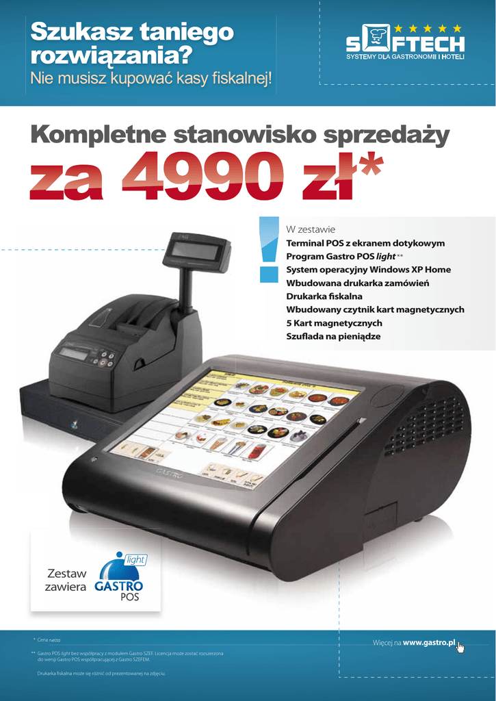 Szukasz taniego rozwiązania? SYSTEMY DLA GASTRONOMII I HOTELI Nie musisz kupować kasy fiskalnej! Kompletne stanowisko sprzedaży W zestawie Terminal POS z ekranem dotykowym Program Gastro POS light ** System operacyjny Windows XP Home Wbudowana drukarka zamówień Drukarka fiskalna Wbudowany czytnik kart magnetycznych 5 Kart magnetycznych Szuflada na pieniądze Zestaw zawiera * Cena netto ** Gastro POS light bez współpracy z modułem Gastro SZEF. Licencja może zostać rozszerzona do wersji Gastro POS współpracującej z Gastro SZEFEM. Drukarka fiskalna może się różnić od prezentowanej na zdjęciu. Więcej na www.gastro.pl Program Gastro POS light Gastronomiczny system sprzedaży na ekranie dotykowym Gastro POS light jest systemem sprzedaży obsługiwanym poprzez ekran dotykowy, dedykowanym dla lokali gastronomicznych. Powstał w celu wyeliminowania ograniczeń funkcjonalnych, jakie stwarzało posługiwanie się na stanowisku sprzedaży kasą fiskalną. Gastro POS light jest prostszą wersją najpopularniejszego w Polsce programu dla gastronomii Gastro POS. Obsługa programu Gastro POS light przypomina pracę na zwykłej kasie, z tą różnicą, że klawisze są wyświetlane na ekranie a wybór potraw jest prosty i intuicyjny, przy tym nieporównywalnie szybszy. Identyfikacja kelnera następuje wg kodu lub z użyciem karty magnetycznej. System przewyższa ergonomią oraz swoimi możliwościami każdą kasę gastronomiczną. Łatwa i efektywna praca w restauracji Obsługa poprzez ekran dotykowy; Identyfikacja sprzedawcy kodem lub kartą magnetyczną, rejestracja; Tryb szybkiej sprzedaży dla lokali typu fast-food. Elastyczne kształtowanie cen i rozliczeń Możliwość korekt rachunków przed i po wydrukowaniu zamówienia - z możliwością ustalania uprawnień do wykonania korekt; Obsługa dowolnych form płatności - gotówka, karty kredytowe, czeki; Obsługa wewnętrznej sprzedaży bezgotówkowej. Współpraca z kuchnią Współpraca z jedną drukarką zamówień – zintegrowaną z PS3100 Gastro lub zewnętrzną. Liczne i dokładne raporty Raport kelnerski, raport utargów, raport o udzielonych rabatach, raport wykonanych storn, raport sprzedaży wg PLU (kodów produktów), raport sprzedaży wg grup towarowych, raport sprzedaży na karty rabatowe, rejestry VAT, raporty kasowe i inne; Bogata funkcjonalność, specjalistyczne funkcje Wyświetlanie ceny i nazwy potrawy oraz komunikatu dla Klienta na wyświetlaczu konsumenckim; Wystawianie faktur; Współpraca z większością urządzeń fiskalnych dostępnych na polskim rynku; Wydruk na jednej drukarce fiskalnej z kilku komputerów POS poprzez spooler DFSERWIS; Specyfikacja techniczna Terminal dotykowy PS3100 Gastro Wyjątkowy Zintegrowany Terminal POS z ekranem 10,4” z systemem Gastro mPOS Cechy i zalety PS3100 Gastro POS Szybki procesor Intel ATOM N270 Obudowa bez wentylatorów Wygodny dotykowy ekran 10.4" LCD Wbudowany czytnik kart magnetycznych Dysk twardy 160 GB, Pamięć RAM 512 MB Nowoczesny wygląd Wbudowana termiczna drukarka zamówień z odcinaczem Małe rozmiary 300 szer. x 299 wys. x 135 gł. mm Więcej informacji o możliwościach i zaletach systemów Gastro znajdziesz na www.gastro.pl 04-386 Warszawa, ul. Nizinna 13/1 tel./fax +48 22 610 77 42 e-mail: [email protected], www.gastro.pl Przygotowanie i realizacja www.EXIS.pl Softech Spółka z o.o. PARTNER SOFTECH