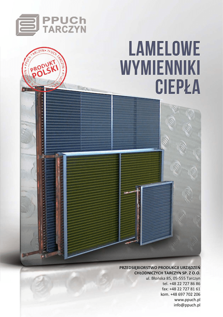 PPUCh TARCZYN LAMELOWE WYMIENNIKI CIEPtA PRZEDSIĘBIORSTWO PRODUKCJI URZĄDZEŃ CHŁODNICZYCH TARCZYN SP. Z 0.0. ul. Błońska 85, 05-555 Tarczyn tel. +48 22 727 86 86 fax: +48 22 727 81 61 kom. +48 697 702 206 www.ppuch.pl [email protected] Przedsiębiorstwo Produkcji Urządzeń Chłodniczych Tarczyn Sp z o.o. istnieje od ponad 50 lat i zajmuje wysoką pozycję w polskiej branży chłodniczej. Dzięki wieloletniemu doświadczeniu popartemu nowoczesnymi technologiami nasze wyroby osiągają najwyższą jakość i sprawność. Cecha ta zapewnia tanią eksploatację ( niskie zużycie energii L a tym samym ochronę środowiska. Zakres produkcji obejmuje: • Lamelowe wymienniki ciepła ( freonowe, wodne, glikolowe, olejowe, parowe) • Wentylatorowe chłodnice powietrza • Wentylatorowe chłodnice cieczy • Skraplacze powietrzne • Wentylatorowe nagrzewnice powietrza • Bloki lamelowe używane do regeneracji • Inne nietypowe rozwiązania wynikające z indywidualnych potrzeb Klienta Lamelowe wymienniki ciepła wykonywane są przy użyciu najnowocześniejszego parku maszynowego na bazie obrabiarek CNC; zachowując swoją powtarzalność oraz parametry techniczne. Różnorodna konfiguracja materiałowa umożliwia wykonywanie wymienników przeznaczonych dla trudnych warunków środowiskowych. Wysoka jakość stosowanych komponentów gwarantuje długą żywotność wyrobów. Tym co nas wyróżnia od konkurencji to możliwości opracowywania indywidualnych projektów bez konieczności zamawiania dużych partii danego asortymentu. Wykonujemy również bloki lamelowe używane do regeneracji istniejących urządzeń chłodniczych. Istotnym czynnikiem są również krótkie terminy realizacji. Głównym celem naszego działania jest kooperacja produkcyjna z producentami wyrobów oraz wytwórcami instalacji zawierających lamelowe wymienniki ciepła. Nasze wyroby dystrybuowane są poprzez sieć współpracujących hurtowni, oraz przyzakładowy sklep firmowy. RODZAJE GEOMETRII BATERII LAMELOWVCH ~5/16" ~3/8" (7,94 mm) 25 25 kierunek kierunek przepływu 2165 przepływu powietrza powietrza 94mm) 05/16" Rury CuGrubość 03/8" 9,52 mm wewnętrznie żebrowane Grubość ścianki Rury Cu- Podziałka Grubość Krawędź odcięta Iameii w pojedyńczej może być lameli: 12; minimalna: 1 usztywniona przez pofalowanie ~1/2" rur- 0,28 mm lub 0,45 mm lamel Al- 0,15 mm Podziałka lamel: 1,8- 3,2 mm co 0,1 mm ilość rzędów wewnętrznie żebrowane Grubość ścianki rur- 0,28 mm lub 0,45 mm lamel Al- 0,15 mm Maksymalna (9,52 mm) lamel: 1,8- 3,2 mm co 0,1 mm Maksymalna ilość rzędów Krawędź odcięta Iameii w pojedyńczej może być lameli: 12; minimalna: 1 usztywniona przez pofalowanie (12,70 mm) ~5/8" (15,88 mm) otwory pod grzałki opcjonalnie 50 32 kierunek przepływu powietrza kierunek przepływu 40 01/2" (12,70 mm) Rury Cu- wewnętrznie żebrowane Grubość ścianki Grubość lub gładkie rur- 0,36 mm lub 0,63 mm ilość rzędów Krawędź odcięta Iameii w Rury Cu- pojedyńczej może być lameli: 10; minimalna: 1 usztywniona przez pofalowanie wewnętrznie żebrowane Grubość ścianki lub gładkie rur- 0,4 mm lub 0,58 mm lamel Al- 0,25 mm Podziałka lamel: 2- 6 mm co 0,1 mm Maksymalna 05/8" 15,88 mm) Grubość lamel Al- 0,18 mm Podziałka powietrza lamel: 4- 8 mm co 0,1 mm Maksymalna ilość rzędów Krawędź odcięta Iameii w pojedyńczej może być lameli: 8; minimalna: 1 usztywniona przez pofalowanie System nazewnictwa wymienników lamelowych Opis parametrów występujących w symbolice nazewnictwa wymienników lamelowych TG- typ geometrii- litera i liczba dwucyfrowa (GOl, G02, G03, G04, G05, G06) RR- rodzaj rury- G- rura gładka; GR- grubość ścianki rur [10materiał MR- materiał Z- rura wewnętrznie żebrowana mm] -liczba dwucyfrowa (np. 35 oznacza grubość ścianki rury wynoszącą 0,35 mm) rur- nazwa dwuliterowa: Cu- GL- grubość lamelek [10ML- 2 2 miedź; mm] -liczba dwucyfrowa (np. 25 oznacza grubość lamelki wynoszącą 0,25 mm) lamelek- nazwa dwuliterowa: Cu- RL- rozstaw lamelek [10materiał miedź; Al- aluminium; AE- al. epoksyd.; Ko- stal kwasoodporna mm] -liczba dwu lub trzycyfrowa (np. 32 oznacza odstęp między lamelkami 1 wynoszący MO- Ko- stal kwasoodporna 3,2 mm) obramowania- nazwa dwuliterowa: Fe- stal ocynkowana; Ko- stal kwasoodporna; Al- aluminium IR- liczba dwucyfrowa określająca ilość rzędów RR- liczba trzycyfrowa określająca ilość -druga litera: C- rzędzie oznaczająca długość części DL- liczba czterocyfrowa określająca AB- nazwa dwuliterowa rur w rur w baterii (np. 04 oznacza 4 chłodnica; rzędy) (np. 012 oznacza 12 rur w rzędzie) lamelowej baterii w mm przeznaczenie baterii- pierwsza litera: F- freonowa; W- cieczowa; N- nagrzewnica; S- skraplacz; D- PB- nazwa jednoliterowa określająca pozycję NP- nazwa jednoliterowa określająca układ dwufunkcyjny baterii w stosunku do kierunku powietrza: V- pionowa; H- pozioma kierunek napływu powietrza na baterię: P- prawy; L- lewy 10 - liczba dwucyfrowa określająca ilość obiegów czynnika w baterii (np. 04 określa 4 obiegi) SP- dwie liczby rozdzielone znakiem dzielenia określające średnice przyłączy na wlocie i wylocie z baterii (np. 12/28 oznacza wlot o średnicy 12 mm i wylot o średnicy 28 mm lub l~ oznacza wlot i wylot o średnicy l~ cala; w przypadku przyłączy calowych występuje tylko jedna liczba) PARAMETR TG RR GR MR GL ML RL MO PRZYKŁAD GOl G 35 Cu 25 Al 32 Fe 04 012 0950 FC V n n n n n - typ geometr-ii_ _ _ _ _ _· _ r T ~ -rodzaj rury -grubość ścianki rur [10- mm] 2 -materiał rur -grubość lamelek [10- mm] 2 -materiał lamelek 1 -rozstaw lamelek [10- mm] - materiał obramowania -ilość rzędów -ilość rur w rur rzędzie -długość części lamelowej [mm] -aplikacja baterii -pozycja baterii w stosunku do -kierunek - ilość napływu przepływu powietrza powietrza obiegów -średnice przyłączy (wlot/wylot) [mm/mm] IR RR n DL n AB n PB NP L 10 04 SP 10/22
