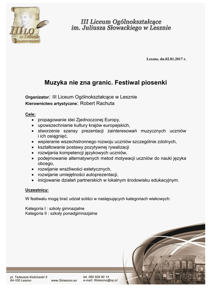 Leszno, dn.02.01.2017 r. Muzyka nie zna granic. Festiwal piosenki Organizator: III Liceum Ogólnokształcące w Lesznie Kierownictwo artystyczne: Robert Rachuta Cele: propagowanie idei Zjednoczonej Europy, upowszechnianie kultury krajów europejskich, stworzenie szansy prezentacji zainteresowań muzycznych uczniów i ich osiągnięć, wspieranie wszechstronnego rozwoju uczniów szczególnie zdolnych, kształtowanie postawy pozytywnej rywalizacji rozwijania kompetencji językowych uczniów, podejmowanie alternatywnych metod motywacji uczniów do nauki języka obcego, rozwijanie wrażliwości estetycznych, rozwijanie umiejętności autoprezentacji, inicjowanie działań partnerskich w lokalnym środowisku edukacyjnym. Uczestnicy: W festiwalu mogą brać udział soliści w następujących kategoriach wiekowych: Kategoria I : szkoły gimnazjalne Kategoria II : szkoły ponadgimnazjalne Warunkiem uczestnictwa w Festiwalu piosenki. Muzyka nie zna granic. jest pełne i czytelne wypełnienie karty zgłoszenia i nadesłanie jej do dnia 16stycznia 2017 r. Kartę zgłoszenia należy przesłać na e-mail szkoły: [email protected] Harmonogram: Eliminacje – odbędą się na dnia 18 stycznia 2017 r. o godzinie 11. 30 w budynku szkoły. Do finału zakwalifikuje się 20 osób (po 10 z każdej kategorii). Przesłuchania finałowe odbędą się 22 lutego 2017 r. I kategoria (gimnazja) – o godz. 11.30 II kategoria (szkoły ponadgimnazjalne) – o godz. 13.00 Dla finalistów odbędą się warsztaty wokalno- ruchowe we wspólnie uzgodnionym terminie Koncert finałowy i wręczenie nagród : 22. 02. 2017 r. Miejsce: III Liceum Ogólnokształcące im. Juliusza Słowackiego (aula) pl. Kościuszki 5 64-100 Leszno przesłuchania finałowe: I kategoria (gimnazja) – o godz. 14.00 II kategoria (szkoły ponadgimnazjalne) – o godz. 15. 30 koncert galowy godz. 17.00 Postanowienia organizacyjne: 1. Festiwal ma zasięg regionalny. 2. Termin nadsyłania zgłoszeń upływa 16.01.2017 r. Karty należy wysyłać pocztą elektroniczną (jako załączniki) na adres e-mail: [email protected] . W nazwie załącznika proszę podać nazwisko i imię. 3. Karty nadesłane po tym terminie mogą nie być brane pod uwagę przez Organizatora. 4. Każdy solista wykonuje jedną piosenkę z akompaniamentem, półplaybackiem lub a’cappella w dowolnym języku obcym. Uczestnik ma prawo zdecydować o przygotowaniu dwóch różnych piosenek na eliminację i finał. 5. W przypadku prezentacji z akompaniamentem, uczestnik zobowiązany jest WYRAŹNIE ująć w karcie zgłoszenia wymagania techniczne, ilość potrzebnych mikrofonów i wejść liniowych), 6. W przypadku półplaybacku dopuszczalne są następujące nośniki- CD (z nagraniem tylko wykonywanego utworu, prosimy o podpisanie nośników imieniem i nazwiskiem). Organizatorzy nie biorą odpowiedzialności za jakość nagrania. Prosimy o wcześniejsze, (co najmniej 0,5 godziny przed eliminacjami) dostarczenie nagrania na płycie CD. 7. Każdy wykonawca otrzyma dyplom za udział w festiwalu. 8. Jury przyzna I, II i III miejsce w każdej kategorii oraz wyróżnienia. 10. Zdobywcy I, II i III miejsc w każdej z kategorii otrzymają nagrody rzeczowe, wszyscy wyróżnieni, oraz inni uczestnicy wyznaczeni przez organizatora wystąpią w Koncercie Galowym. 11.Dyrektor Artystyczny zastrzega sobie prawo do rozstrzygnięcia wszelkich spraw nieujętych w Regulaminie. Ocena: Jury w swojej ocenie kierować się będzie następującymi kryteriami: a) dobór repertuaru b) muzykalność c) warunki głosowe d) interpretacja e) ogólny wyraz artystyczny f) poprawność językowa Szczególnie pod uwagę przy ocenie będzie brana twórczość autorska. Postanowienia końcowe: 1. Kolejność przesłuchań finałowych będzie do wglądu na stronie internetowej szkoły www.3loleszno.eu od 17 stycznia 2017 r. 2. Każdy uczestnik festiwalu powinien być obecny (w miejscu imprezy) na pół godziny przed planowanym rozpoczęciem przesłuchań w danej kategorii wiekowej. 3. Do regulaminu dołączona jest jedna karta zgłoszenia, którą w przypadku chęci zgłoszenia większej ilości uczestników można kopiować. ORGANIZATORZY