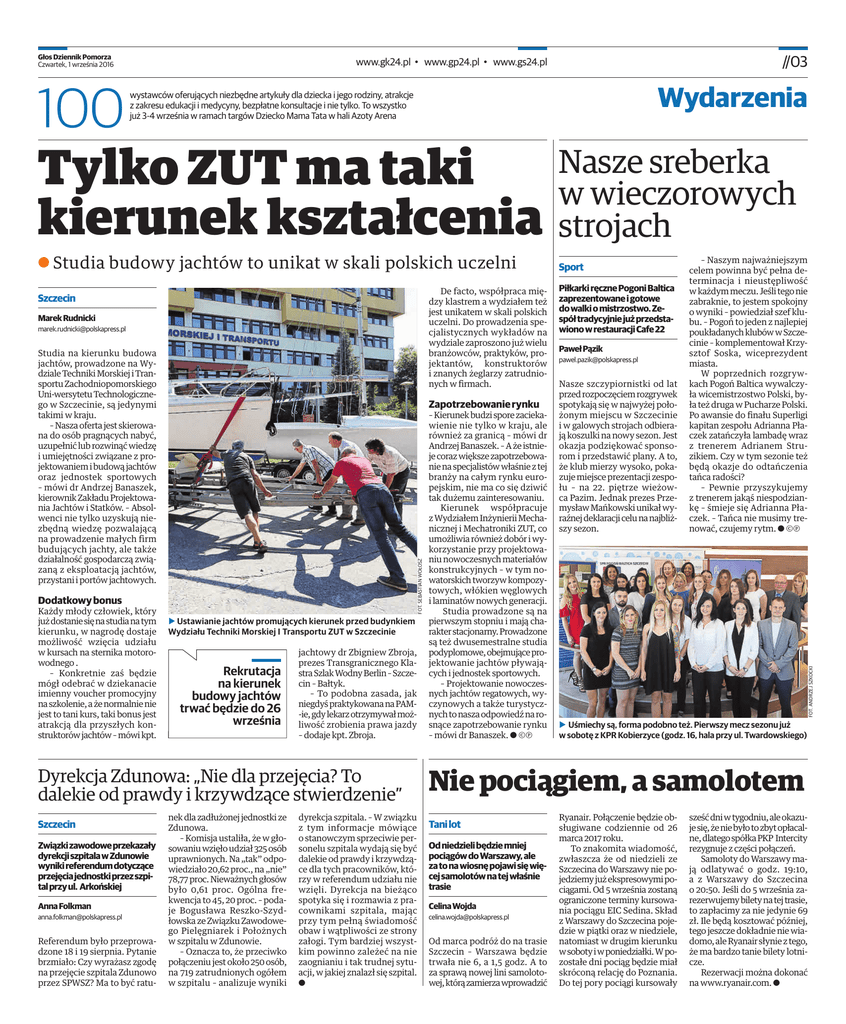 Głos Dziennik Pomorza Czwartek, 1 września 2016 100 //03 www.gk24.pl • www.gp24.pl • www.gs24.pl Wydarzenia wystawców oferujących niezbędne artykuły dla dziecka i jego rodziny, atrakcje z zakresu edukacji i medycyny, bezpłatne konsultacje i nie tylko. To wszystko już 3-4 września w ramach targów Dziecko Mama Tata w hali Azoty Arena Tylko ZUT ma taki kierunek kształcenia Nasze sreberka w wieczorowych strojach A Studia budowy jachtów to unikat w skali polskich uczelni Sport Marek Rudnicki [email protected] Studia na kierunku budowa jachtów, prowadzone na Wydziale Techniki Morskiej i Transportu Zachodniopomorskiego Uni-wersytetu Technologicznego w Szczecinie, są jedynymi takimi w kraju. – Nasza oferta jest skierowana do osób pragnących nabyć, uzupełnić lub rozwinąć wiedzę i umiejętności związane z projektowaniem i budową jachtów oraz jednostek sportowych – mówi dr Andrzej Banaszek, kierownik Zakładu Projektowania Jachtów i Statków. – Absolwenci nie tylko uzyskują niezbędną wiedzę pozwalającą na prowadzenie małych firm budujących jachty, ale także działalność gospodarczą związaną z eksploatacją jachtów, przystani i portów jachtowych. FOT. SEBASTIAN WOŁOSZ Zapotrzebowanie rynku Dodatkowy bonus Każdy młody człowiek, który już dostanie się na studia na tym kierunku, w nagrodę dostaje możliwość wzięcia udziału w kursach na sternika motorowodnego . – Konkretnie zaś będzie mógł odebrać w dziekanacie imienny voucher promocyjny na szkolenie, a że normalnie nie jest to tani kurs, taki bonus jest atrakcją dla przyszłych konstruktorów jachtów – mówi kpt. b Ustawianie jachtów promujących kierunek przed budynkiem Wydziału Techniki Morskiej I Transportu ZUT w Szczecinie Rekrutacja na kierunek budowy jachtów trwać będzie do 26 września jachtowy dr Zbigniew Zbroja, prezes Transgranicznego Klastra Szlak Wodny Berlin – Szczecin – Bałtyk. – To podobna zasada, jak niegdyś praktykowana na PAM-ie, gdy lekarz otrzymywał możliwość zrobienia prawa jazdy – dodaje kpt. Zbroja. Dyrekcja Zdunowa: „Nie dla przejęcia? To dalekie od prawdy i krzywdzące stwierdzenie” Szczecin Związki zawodowe przekazały dyrekcji szpitala w Zdunowie wyniki referendum dotyczące przejęcia jednostki przez szpital przy ul. Arkońskiej Anna Folkman [email protected] Referendum było przeprowadzone 18 i 19 sierpnia. Pytanie brzmiało: Czy wyrażasz zgodę na przejęcie szpitala Zdunowo przez SPWSZ? Ma to być ratu- nek dla zadłużonej jednostki ze Zdunowa. – Komisja ustaliła, że w głosowaniu wzięło udział 325 osób uprawnionych. Na „tak” odpowiedziało 20,62 proc., na „nie” 78,77 proc. Nieważnych głosów było 0,61 proc. Ogólna frekwencja to 45, 20 proc. – podaje Bogusława Reszko-Szydłowska ze Związku Zawodowego Pielęgniarek i Położnych w szpitalu w Zdunowie. – Oznacza to, że przeciwko połączeniu jest około 250 osób, na 719 zatrudnionych ogółem w szpitalu – analizuje wyniki dyrekcja szpitala. – W związku z tym informacje mówiące o stanowczym sprzeciwie personelu szpitala wydają się być dalekie od prawdy i krzywdzące dla tych pracowników, którzy w referendum udziału nie wzięli. Dyrekcja na bieżąco spotyka się i rozmawia z pracownikami szpitala, mając przy tym pełną świadomość obaw i wątpliwości ze strony załogi. Tym bardziej wszystkim powinno zależeć na nie zaognianiu i tak trudnej sytuacji, w jakiej znalazł się szpital. a – Kierunek budzi spore zaciekawienie nie tylko w kraju, ale również za granicą – mówi dr Andrzej Banaszek. – A że istnieje coraz większe zapotrzebowanie na specjalistów właśnie z tej branży na całym rynku europejskim, nie ma co się dziwić tak dużemu zainteresowaniu. Kierunek współpracuje z Wydziałem Inżynierii Mechanicznej i Mechatroniki ZUT, co umożliwia również dobór i wykorzystanie przy projektowaniu nowoczesnych materiałów konstrukcyjnych – w tym nowatorskich tworzyw kompozytowych, włókien węglowych i laminatów nowych generacji. Studia prowadzone są na pierwszym stopniu i mają charakter stacjonarny. Prowadzone są też dwusemestralne studia podyplomowe, obejmujące projektowanie jachtów pływających i jednostek sportowych. – Projektowanie nowoczesnych jachtów regatowych, wyczynowych a także turystycznych to nasza odpowiedź na rosnące zapotrzebowanie rynku – mówi dr Banaszek. a ¥ Piłkarki ręczne Pogoni Baltica zaprezentowane i gotowe do walki o mistrzostwo. Zespół tradycyjnie już przedstawiono w restauracji Cafe 22 Paweł Pązik [email protected] Nasze szczypiornistki od lat przed rozpoczęciem rozgrywek spotykają się w najwyżej położonym miejscu w Szczecinie i w galowych strojach odbierają koszulki na nowy sezon. Jest okazja podziękować sponsorom i przedstawić plany. A to, że klub mierzy wysoko, pokazuje miejsce prezentacji zespołu – na 22. piętrze wieżowca Pazim. Jednak prezes Przemysław Mańkowski unikał wyraźnej deklaracji celu na najbliższy sezon. FOT. ANDRZEJ SZKOCKI De facto, współpraca między klastrem a wydziałem też jest unikatem w skali polskich uczelni. Do prowadzenia specjalistycznych wykładów na wydziale zaproszono już wielu branżowców, praktyków, projektantów, konstruktorów i znanych żeglarzy zatrudnionych w firmach. Szczecin – Naszym najważniejszym celem powinna być pełna determinacja i nieustępliwość w każdym meczu. Jeśli tego nie zabraknie, to jestem spokojny o wyniki – powiedział szef klubu. – Pogoń to jeden z najlepiej poukładanych klubów w Szczecinie – komplementował Krzysztof Soska, wiceprezydent miasta. W poprzednich rozgrywkach Pogoń Baltica wywalczyła wicemistrzostwo Polski, była też druga w Pucharze Polski. Po awansie do finału Superligi kapitan zespołu Adrianna Płaczek zatańczyła lambadę wraz z trenerem Adrianem Struzikiem. Czy w tym sezonie też będą okazje do odtańczenia tańca radości? – Pewni