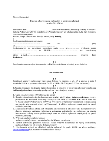 Pieczęć Jednostki Umowa o korzystanie z obiadów w stołówce szkolnej w roku 2015/2016 zawarta w dniu ……………………………. roku we Wrocławiu pomiędzy Gminą Wrocław Szkołą Podstawową Nr 99 z siedzibą we Wrocławiu przy ul. Głubczyckiej 3, 52-026 Wrocław reprezentowaną przez: Jolantą Horyń - Dyrektora Szkoły, zwaną dalej Szkołą, a Rodzicem (opiekunem prawnym) ………………………………. zam. we …………………….. przy ul…………………............................................. legitymującym się dowodem osobistym seria …… nr……………. wydanym przez ………………………….., nr PESEL………………………………, tel. kontaktowy ………………….., adres e-mail…………………………………………………………… zwanym dalej Rodzicem. §1 Przedmiotem umowy jest korzystanie z obiadów w stołówce szkolnej przez dziecko: ………………………………………………….. (imię, nazwisko, klasa) §2 Przedmiot umowy realizowany jest przez Szkołę w oparciu o art. 67 a ustawy z dnia 7 września 1991 r. o systemie oświaty ( Dz. U. z 2004 r. Nr 256, poz.2572 ze zmianami). §3 1.Rodzic deklaruje, Ŝe dziecko będzie korzystało z obiadów w stołówce szkolnej wypełniając deklarację obiadową stanowiącą załącznik nr 1 do niniejszej umowy. §4 1. Cena obiadu wynosi: 5,00 zł (wsad do kotła) 2. Rodzic zobowiązuje się do dokonywania wpłaty do 11 dnia kaŜdego miesiąca, z góry, przelewem na rachunek bankowy Szkoły nr 46 1020 5226 0000 6702 0416 2244 lub w Kasie Szkoły Podstawowej nr 99 we Wrocławiu w terminie wskazanym comiesięcznie na stronie internetowej szkoły sp99.nazwa.pl i tablicy ogłoszeń znajdującej się przed stołówką szkolną. 3. Miesięczna kwota za obiad jest obliczana jako iloczyn: 5 zł x ilość dni Ŝywieniowych w danym miesiącu. Aktualne informacje dotyczące odpłatności są podawane na stronie internetowej szkoły www.sp99.nazwa.pl oraz na tablicy ogłoszeń znajdującej się przed stołówką szkolną. 4. W treści przelewu naleŜy wpisać: wpłata za obiady / imię i nazwisko dziecka/ klasa / za miesiąc…………. 4. Termin dokonania płatności oznacza dzień wpływu naleŜności na wyŜej wymieniony rachunek bankowy lub wpłaty do Kasy Szkoły. 5. Nieobecność dzieci na obiadach naleŜy zgłaszać do godz. 08:00 na adres mailowy: [email protected] lub pisemnie w sekretariacie szkoły. 6. Wszystkie nieobecności zgłoszone z zachowaniem powyŜszego terminu zostaną odliczone od wpłaty za kolejny miesiąc. Informację o wysokości odliczeń moŜna uzyskać telefonicznie pod nr 717986879 wew. 110 .Nie będą odliczane nieobecności niezgłoszone lub zgłoszone po terminie. 7.W dni wolne od zajęć lekcyjnych stołówka jest nieczynna. 8. W przypadku wyjazdu na wycieczkę szkolną, konkurs, zawody, nieobecność na obiedzie zgłasza rodzic, jak w pkt 5. 9. Po zakończeniu umowy o korzystanie z obiadów w stołówce szkolnej, ewentualne nadpłaty Szkoła przekaŜe na poniŜej podany rachunek bankowy Rodzica:………………………………………………………………………………………. lub wypłacone w Kasie Szkoły. §5 Umowa obowiązuje od momentu zawarcia do zakończenia zajęć dydaktycznych roku szkolnego 2015/2016, tj. 24 czerwca 2016. §6 1.W razie zwłoki w uregulowaniu comiesięcznej opłaty Szkoła moŜe rozwiązać umowę bez zachowania terminu wypowiedzenia, po uprzednim pisemnym wezwaniu Rodzica do zapłaty, z określeniem siedmiodniowego terminu płatności zaległej naleŜności. 2.Brak wpłaty naleŜności o której mowa w ust. 1 spowoduje wszczęcie postępowania windykacyjnego. §7 1.Rodzic zobowiązuje się zapoznać z REGULAMINEM ZASAD ODPŁATNOŚCI ZA KORZYSTANIE Z POSIŁKÓW WYDAWANYCH W STOŁÓWCE SZKOLNEJ W SZKOLE PODSTAWOWEJ NR 99 NR 99 IM. TADEUSZA KOŚCIUSZKI WE WROCŁAWIU. §8 1.Rodzic wyraŜa zgodę na przetwarzanie danych osobowych zawartych w niniejszej umowie przez Szkołę Podstawową nr 99 w Wrocławiu w zakresie niezbędnym do realizacji niniejszej umowy. §9 1. W Ŝywieniu uczniów uwzględniane są za zgodą Dyrektora i w uzgodnieniu z ajentem diety eliminacyjne, potwierdzone stosownym zaświadczeniem lekarskim. Zalecenia lekarskie, powinny zawierać określenie jednostki chorobowej oraz wykaz produktów wskazanych i przeciwskazanych niezbędnych do opracowania właściwej diety eliminacyjnej. Zaświadczenie wraz z podaniem o zastosowanie diety wykluczającej naleŜy złoŜyć w sekretariacie szkoły w dniu podpisania umowy. § 10 1. Strony mogą rozwiązać umowę w kaŜdym czasie, w trybie porozumienia stron. 2. Rezygnacja z obiadów lub zmiana terminów korzystania z obiadów wymaga formy pisemnej. Informację o poniŜszej treści naleŜy zgłosić w sekretariacie szkoły do 25 dnia miesiąca, w którym uczeń korzysta z obiadów: REZYGNACJA Ja, ……………………………………………. oświadczam, Ŝe moje dziecko………………………………………………. uczeń klasy……………………. nie będzie korzystało z obiadów w Szkole………………………… od miesiąca……………………. Podpis Rodzica § 11 Wszelkie zmiany niniejszej umowy dla swej waŜności wymagają formy pisemnego aneksu. § 12 W sprawach nieuregulowanych niniejszą umową mają zastosowanie przepisy Kodeksu cywilnego. § 13 Umowę sporządzono w dwóch jednobrzmiących egzemplarzach, po jednym dla kaŜdej ze stron. podpis Rodzica podpis Dyrektora Szkoły Załącznik nr 1 Dziecko będzie uczęszczało na obiady w niŜej wymienionych dniach tygodnia * Poniedziałek Wtorek Środa Czwartek Piątek tak tak tak tak tak *niepotrzebne skreślić ……………………………………… Podpis rodzica/opiekuna prawnego nie nie nie nie nie