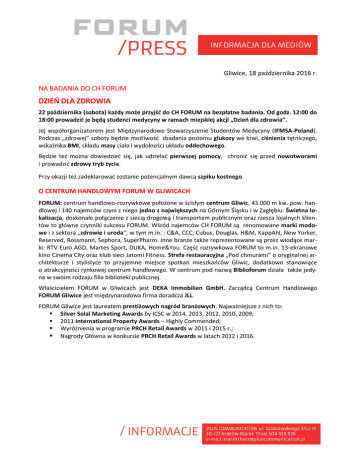 Gliwice, 18 października 2016 r. NA BADANIA DO CH FORUM DZIEŃ DLA ZDROWIA 22 października (sobota) każdy może przyjść do CH FORUM na bezpłatne badania. Od godz. 12:00 do 18:00 prowadzić je będą studenci medycyny w ramach miejskiej akcji „Dzień dla zdrowia”. Jej współorganizatorem jest Międzynarodowe Stowarzyszenie Studentów Medycyny (IFMSA-Poland). Podczas „zdrowej” soboty będzie możliwość zbadania poziomu glukozy we krwi, ciśnienia tętniczego, wskaźnika BMI, składu masy ciała i wydolności układu oddechowego. Będzie też można dowiedzieć się, jak udzielać pierwszej pomocy, chronić się przed nowotworami i prowadzić zdrowy tryb życia. Przy okazji też zadeklarować zostanie potencjalnym dawcą szpiku kostnego. O CENTRUM HANDLOWYM FORUM W GLIWICACH FORUM: centrum handlowo-rozrywkowe położone w ścisłym centrum Gliwic. 43.000 m kw. pow. handlowej i 140 najemców czyni z niego jedno z największych na Górnym Śląsku i w Zagłębiu. Świetna lokalizacja, doskonałe połączenie z siecią drogową i transportem publicznym oraz rzesza lojalnych klientów to główne czynniki sukcesu FORUM. Wśród najemców CH FORUM są renomowane marki modowe i z sektora „zdrowie i uroda”, w tym m.in. : C&A, CCC, Cubus, Douglas, H&M, KappAhl, New Yorker, Reserved, Rossmann, Sephora, SuperPharm. Inne branże także reprezentowane są przez wiodące marki: RTV Euro AGD, Martes Sport, DUKA, Home&You. Część rozrywkowa FORUM to m.in. 13-ekranowe kino Cinema City oraz klub sieci Jatomi Fitness. Strefa restauracyjna „Pod chmurami” o oryginalnej architekturze i stylistyce to przyjemne miejsce spotkań mieszkańców Gliwic, dodatkowo stanowiące o atrakcyjności rynkowej centrum handlowego. W centrum pod nazwą Biblioforum działa także jedyna w swoim rodzaju filia biblioteki publicznej. Właścicielem FORUM w Gliwicach jest DEKA Immobilien GmbH. Zarządcą Centrum Handlowego FORUM Gliwice jest międzynarodowa firma doradcza JLL. FORUM Gliwice jest laureatem prestiżowych nagród branżowych. Najważniejsze z nich to: Silver Solal Marketing Awards by ICSC w 2014, 2013, 2012, 2010, 2009; 2011 International Property Awards – Highly Commended; Wyróżnienia w programie PRCH Retail Awards w 2011 i 2015 r.; Nagrody Główna w konkursie PRCH Retail Awards w latach 2012 i 2016.