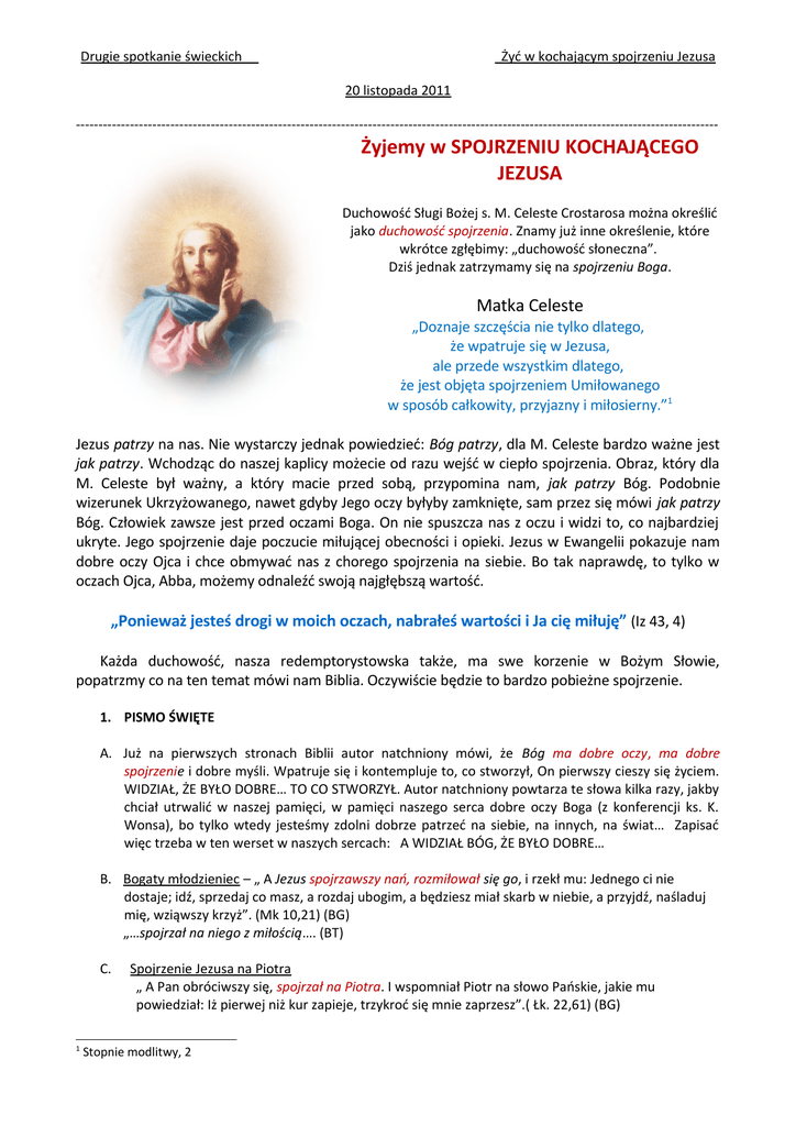 Drugie spotkanie świeckich Żyć w kochającym spojrzeniu Jezusa 20 listopada 2011 ----------------------------------------------------------------------------------------------------------------------------------------------- Żyjemy w SPOJRZENIU KOCHAJĄCEGO JEZUSA Duchowość Sługi Bożej s. M. Celeste Crostarosa można określić jako duchowość spojrzenia. Znamy już inne określenie, które wkrótce zgłębimy: „duchowość słoneczna”. Dziś jednak zatrzymamy się na spojrzeniu Boga. Matka Celeste „Doznaje szczęścia nie tylko dlatego, że wpatruje się w Jezusa, ale przede wszystkim dlatego, że jest objęta spojrzeniem Umiłowanego w sposób całkowity, przyjazny i miłosierny.”1 Jezus patrzy na nas. Nie wystarczy jednak powiedzieć: Bóg patrzy, dla M. Celeste bardzo ważne jest jak patrzy. Wchodząc do naszej kaplicy możecie od razu wejść w ciepło spojrzenia. Obraz, który dla M. Celeste był ważny, a który macie przed sobą, przypomina nam, jak patrzy Bóg. Podobnie wizerunek Ukrzyżowanego, nawet gdyby Jego oczy byłyby zamknięte, sam przez się mówi jak patrzy Bóg. Człowiek zawsze jest przed oczami Boga. On nie spuszcza nas z oczu i widzi to, co najbardziej ukryte. Jego spojrzenie daje poczucie miłującej obecności i opieki. Jezus w Ewangelii pokazuje nam dobre oczy Ojca i chce obmywać nas z chorego spojrzenia na siebie. Bo tak naprawdę, to tylko w oczach Ojca, Abba, możemy odnaleźć swoją najgłębszą wartość. „Ponieważ jesteś drogi w moich oczach, nabrałeś wartości i Ja cię miłuję” (Iz 43, 4) Każda duchowość, nasza redemptorystowska także, ma swe korzenie w Bożym Słowie, popatrzmy co na ten temat mówi nam Biblia. Oczywiście będzie to bardzo pobieżne spojrzenie. 1. PISMO ŚWIĘTE A. Już na pierwszych stronach Biblii autor natchniony mówi, że Bóg ma dobre oczy, ma dobre spojrzenie i dobre myśli. Wpatruje się i kontempluje to, co stworzył, On pierwszy cieszy się życiem. WIDZIAŁ, ŻE BYŁO DOBRE… TO CO STWORZYŁ. Autor natchniony powtarza te słowa kilka razy, jakby chciał utrwalić w naszej pamięci, w pamięci naszego serca dobre oczy Boga (z konferencji ks. K. Wonsa), bo tylko wtedy jesteśmy zdolni dobrze patrzeć na siebie, na innych, na świat… Zapisać więc trzeba w ten werset w naszych sercach: A WIDZIAŁ BÓG, ŻE BYŁO DOBRE… B. Bogaty młodzieniec – „ A Jezus spojrzawszy nań, rozmiłował się go, i rzekł mu: Jednego ci nie dostaje; idź, sprzedaj co masz, a rozdaj ubogim, a będziesz miał skarb w niebie, a przyjdź, naśladuj mię, wziąwszy krzyż”. (Mk 10,21) (BG) „…spojrzał na niego z miłością…. (BT) C. 1 Spojrzenie Jezusa na Piotra „ A Pan obróciwszy się, spojrzał na Piotra. I wspomniał Piotr na słowo Pańskie, jakie mu powiedział: Iż pierwej niż kur zapieje, trzykroć się mnie zaprzesz”.( Łk. 22,61) (BG) Stopnie modlitwy, 2 Drugie spotkanie świeckich Żyć w kochającym spojrzeniu Jezusa 20 listopada 2011 ----------------------------------------------------------------------------------------------------------------------------------------------D. ... Jesteśmy w domu Szymona (Łk 7, 36-50)… jest tam jawnogrzesznica, która wylała cenny olejek na nogi Pana. Jak zareagował Szymon? Jeśli On byłby prorokiem, wiedziałby, kim jest ta kobieta, która Go dotyka, że jest grzesznicą. Spojrzenie Szymona zatrzymało się na tym, co kobieta uczyniła wcześniej. Kobieta dla niego jest tym, co zrobiła. Zobaczmy, jakie jest spojrzenie Chrystusa. Upomniawszy Szymona, tak mówi: Odpuszczone są jej liczne grzechy, ponieważ bardzo umiłowała. Chrystus nie zatrzymał się na tym, co uczyniła, patrzy na miłość, jaką teraz ma w sercu, z jaką przyszła do Niego. Zauważcie różnicę spojrzenia: Szymon zatrzymał się na tym, co uczyniła i potępia ją, Chrystus patrzy na intencję jej serca, a Jego spojrzenie ma moc wyzwalającą kobietę. Chrystus nie patrzy na to, co człowiek wcześniej zrobił, ale patrzy na otwarcie jego serca, z jakim przychodzi i opierając się na tym otwarciu serca Jego spojrzenie wyzwala człowieka. E. Inne spojrzenie Jezusa: przypowieść o Synu marnotrawnym (dziś często określa się ją jako przypowieść o dobrym Ojcu): (Łk 15). Zatrzymajmy się tylko na spojrzeniu Ojca i starszego syna. Kiedy syn był jeszcze daleko, ujrzał go jego Ojciec, wzruszył się głęboko, wybiegł naprzeciw niego i ucałował go. Dlaczego tak? Bo Ojciec widzi syna, swoje dziecko. To jest ważne: nie patrzy na to, co syn uczynił, widzi syna, który powraca. Natomiast starszy brat patrzy na coś innego. Tak mówi do Ojca: „Oto tyle lat ci służę i nie przekroczyłem żadnego twojego rozkazu, a ty nie dałeś mi nigdy koźlęcia, abym mógł się zabawić z przyjaciółmi. Skoro jednak wrócił ten syn twój, który roztrwonił twój majątek, kazałeś zabić dla niego utuczone cielę”. Ojciec widzi syna, który wraca. Starszy syn, który ma spojrzenie starego człowieka, widzi kogoś, kto wszystko roztrwonił. Ojciec wychodzi do syna, starszy brat myśli o jego czynach i to go blokuje. Rezultat tych dwóch spojrzeń jest następujący: spojrzenie ojca jest świętowaniem powrotu, a więc nowym życiem; starszy syn chciałby zamknąć brata w tym, co dawniej uczynił. Spojrzenie ojca uwalnia, spojrzenie brata zamyka. Taka jest różnica starego i nowego spojrzenia. Zachęcam Was, abyście w tym miesiącu na modlitwie starali się zobaczyć, że Jezus naprawdę otula nas swoim spojrzeniem, dobrym, ciepłym, podnoszącym, nawet, gdy przeżywamy sytuacje, za które przepraszamy… 2. MATKA CELESTE. Można powiedzieć, że Matka Celeste, jako mistrzyni życia duchowego, całą formację duchową osoby wstępującej do klasztoru rozpoczyna od SPOJRZENIA, od wejścia w promienie spojrzenia miłującego Chrystusa. Ta propozycja przekracza ściany klasztoru, ona jest propozycją dla wszystkich. Patrząc na obraz Jezusa idącego przez świat, któr